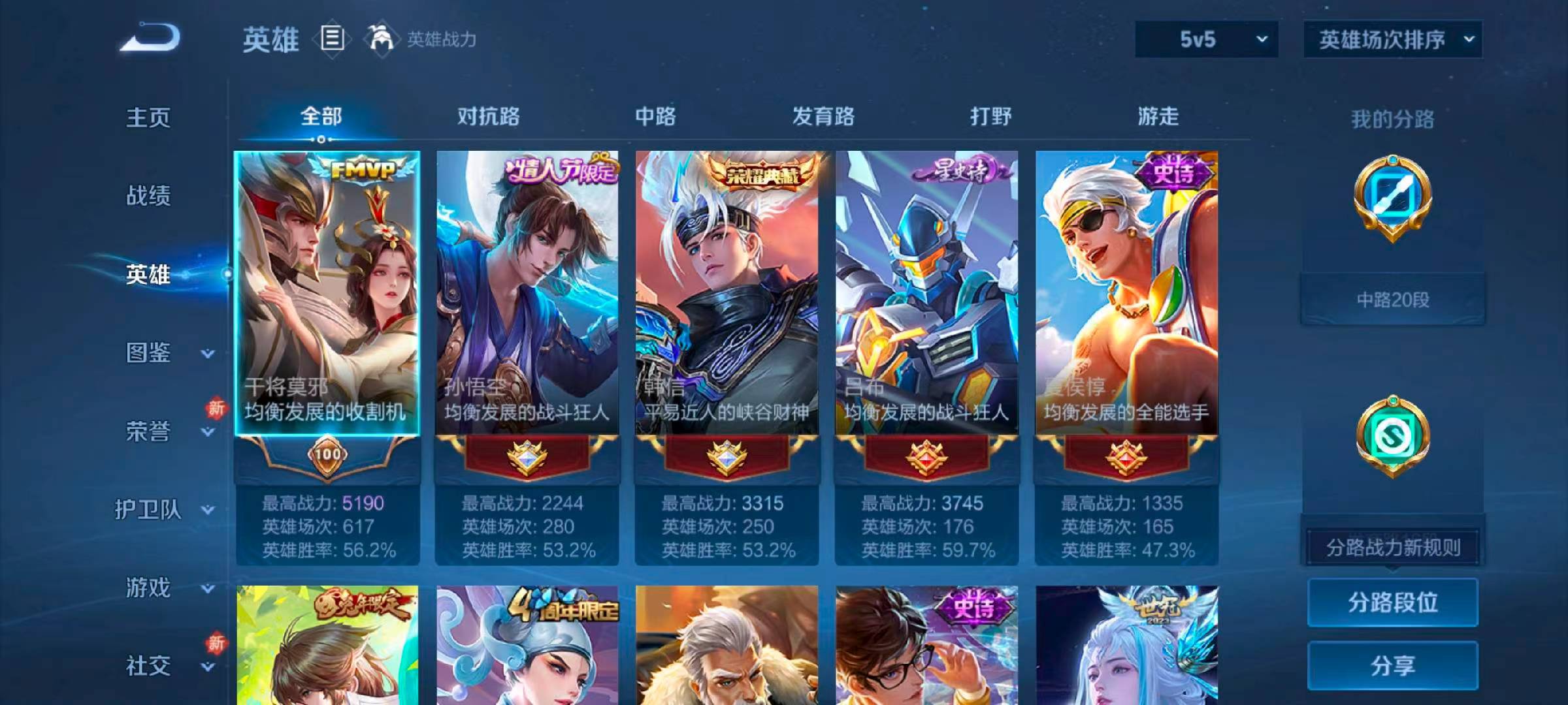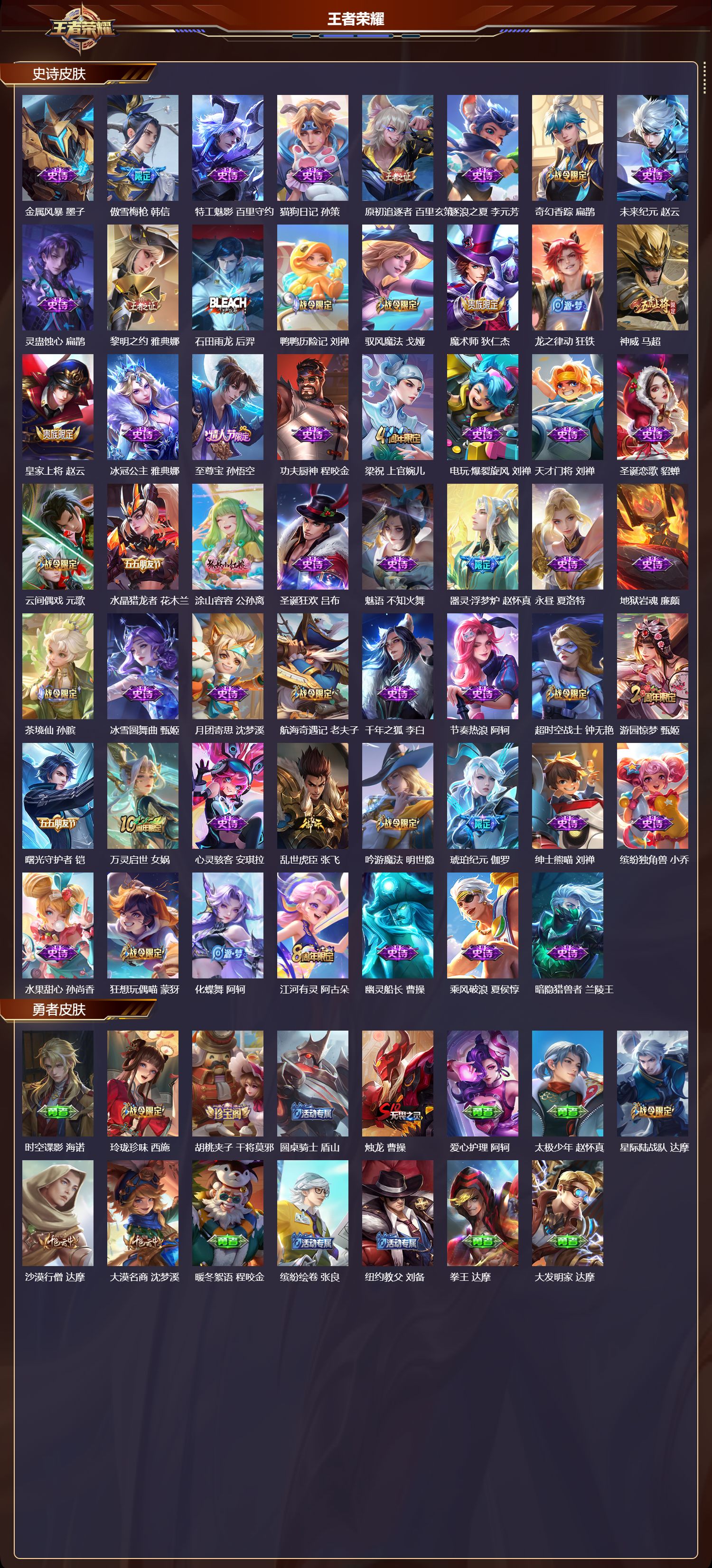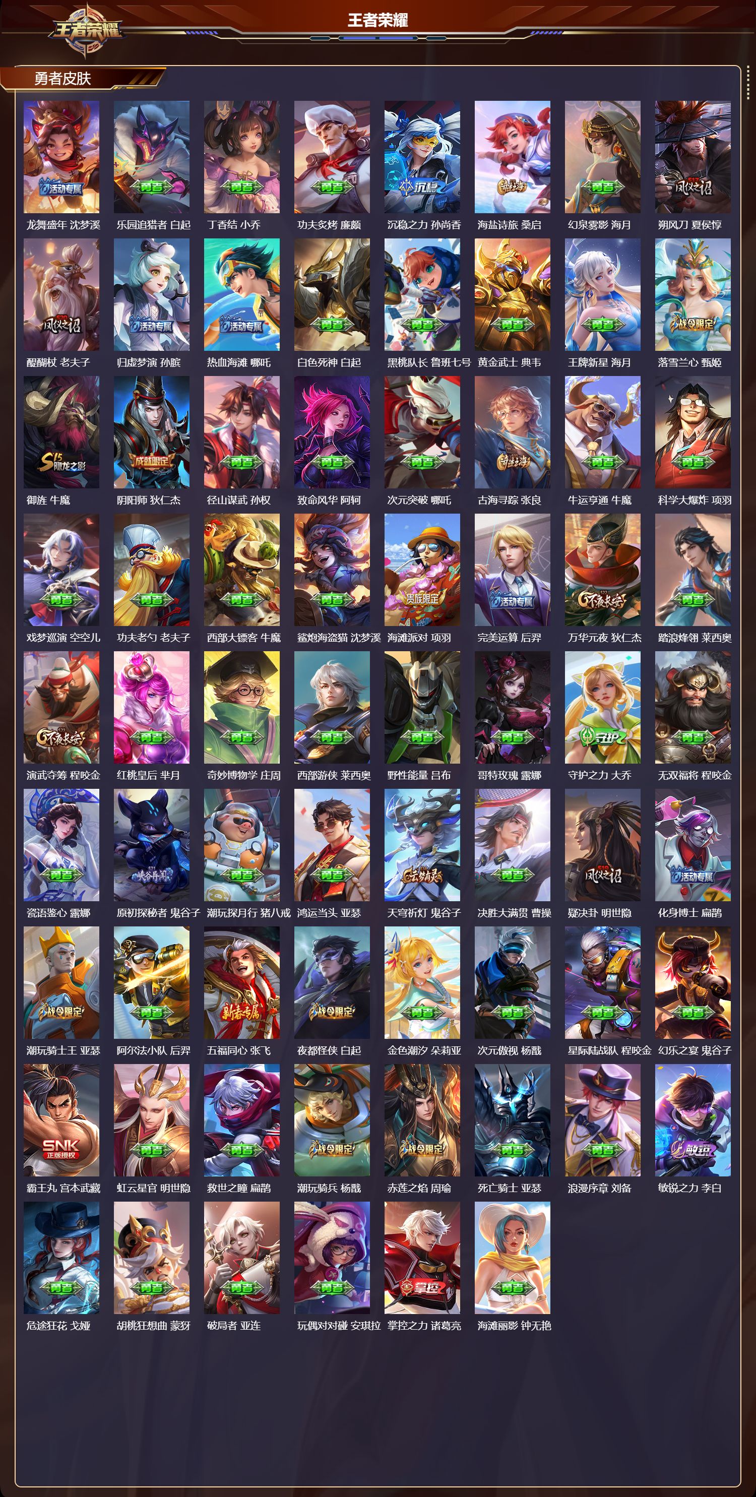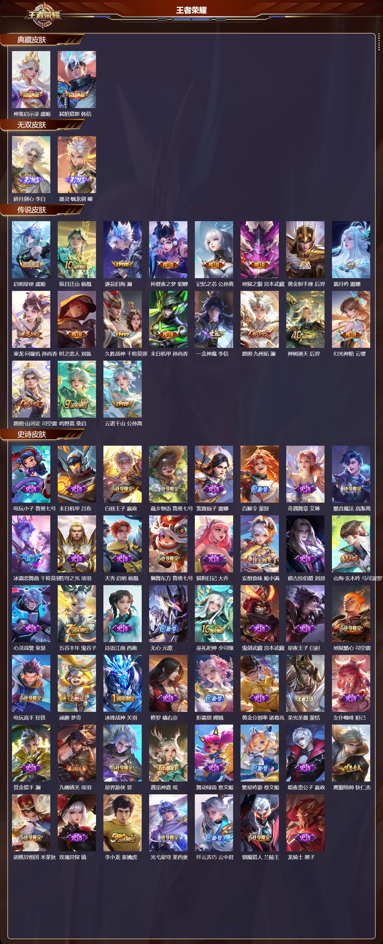 安卓qq/至尊星耀/378皮肤/128英雄/2典藏/0珍品无双/2无双/0珍品传说/19传说/102史诗/9稀有英雄【2 典藏皮肤】神鉴启示录 虞姬弑呛猎影 韩信【2 无双皮肤】碎月剑心 李白器灵·螭龙剑 曜【19 传说皮肤】启明星使 虞姬纵目迁山 杨戬逐花归海 澜仲夏夜之梦 貂蝉记忆之芯 公孙离地狱之眼 宫本武藏黄金射手座 后羿霜月吟 露娜乘龙·问璇玑 孙尚香时之恋人