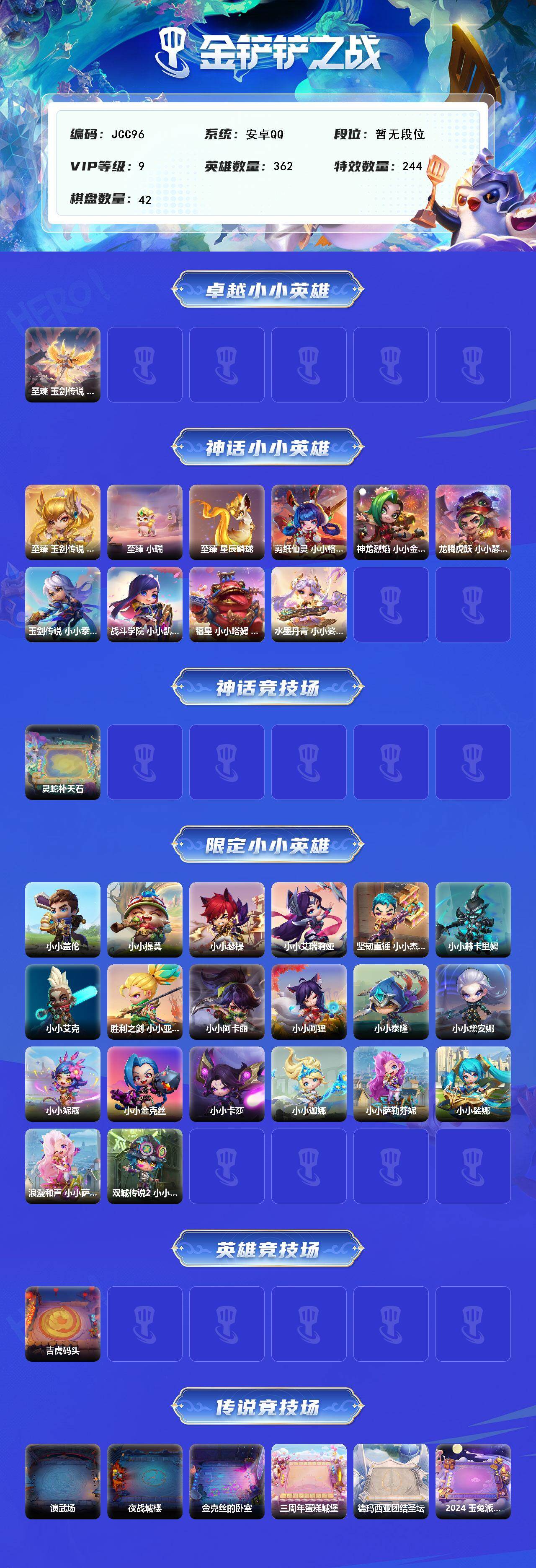 【jcc96】14神话/362小小英雄/42棋盘/至臻 玉剑传说 翼剑仙 不朽凯尔/至臻 玉剑传说 小小艾瑞莉娅/水墨丹青 小小娑娜/福星 小小塔姆 纳财大帝/剪纸仙灵 小小格温/龙腾虎跃 小小瑟提/玉剑传说 小小泰隆/神龙烈焰 小小金克丝/战斗学院 小小凯特琳/至臻 小瑞/至臻 星辰鳞珑/灵蛇补天石/坚韧重锤 小小杰斯/小小妮蔻/双城传说2 小小伊莎/浪漫和声 小小萨勒芬妮/小小黛安娜/胜利之剑 小小亚索/小小萨勒芬妮/小小赫卡里姆/小小提莫/小小迦娜/小小娑娜/小小瑟提/小小卡莎/小小盖伦/小小阿狸/小小阿卡丽/小小泰隆/小小艾瑞莉娅/小小金克丝/小小艾克/吉虎码头/夜战城楼/演武场/金克丝的卧室/2024 玉兔派对/三周年蛋糕城堡/德玛西亚团结圣坛