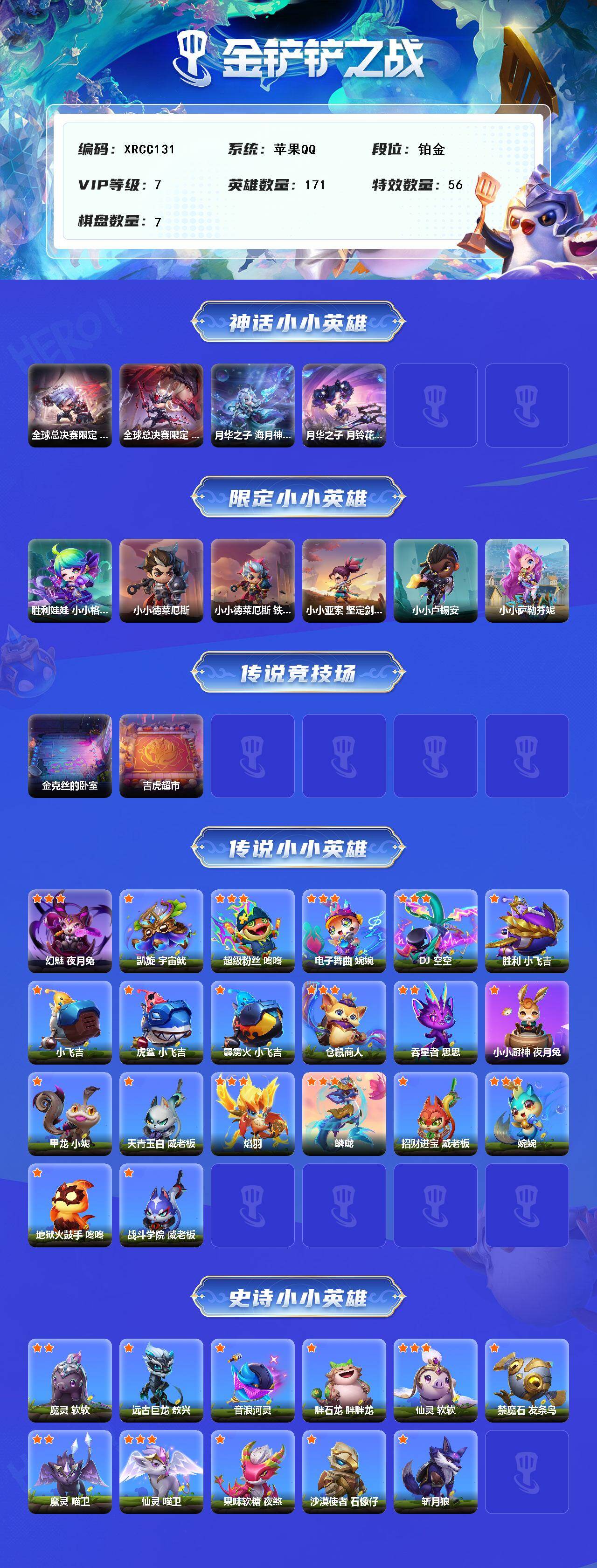 【xrcc131】xr49788-果q-可二次-4神话小小英雄-0神话竞技场-171小小英雄-7竞技场-56攻击特效 【神话小小英雄】:全球总决赛限定 t1 小小蔚,全球总决赛限定 t1 小小永恩,月华之子 海月神 小小佛耶戈,月华之子 月铃花 小小格温 【限定小小英雄】:胜利娃娃 小小格温,小小德莱厄斯,小小德莱厄斯 铁血将军,小小亚索 坚定剑豪,小小卢锡安,小小萨勒芬妮 【传说竞技场】:金克丝的卧室,吉虎超市 【传说小小英雄】:幻魅 夜月兔,凯旋 宇宙鱿,超级粉丝 咚咚,电子舞曲 婉婉,dj 空空,胜利 小飞吉,小飞吉,虎鲨 小飞吉,霹雳火 小飞吉,仓鼠商人,吞星者 思思,小小厨神 夜月兔,甲龙 小妮,天青玉白 威老板,焰羽,鳞珑,招财进宝 威老板,婉婉,地狱火鼓手 咚咚,战斗学院 威老板 【史诗小小英雄】:魔灵 软软,远古巨龙 敖兴,音浪河灵,胖石龙 胖胖龙,仙灵 软软,禁魔石 发条鸟,魔灵 喵卫,仙灵 喵卫,果味软糖 夜煞,沙漠使者 石像仔,斩月狼