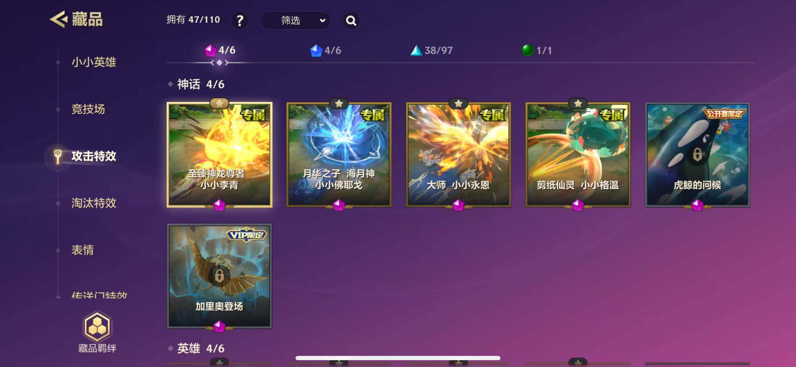 vip9,,1至臻,,3神话小小英雄-0神话竞技场-6小小英雄-1竞技场-3攻击特效 【限定小小英雄】:小小卡特琳娜 【传说小小英雄】:歌姬 夜月兔 【神话小小英雄】:至臻 神龙尊者 小小李青,月华之子 海月神 小小佛耶戈,大师 小小永恩,剪纸仙灵 小小格温 【神话竞技场】:幻境竞技场 【神话攻击特效】:至臻神龙尊者小小李青(专属)