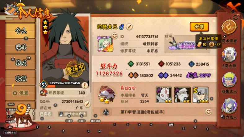 hy11798|安卓qq 1377区 s忍者数:27 a忍者数:46 忍者:旗木卡卡西「须佐能乎」宇智波止水「须佐能乎」艾「忍界大战」大筒木桃式宇智波斑「秽土转生·解」宇智波佐助「永恒万花筒」神秘面...