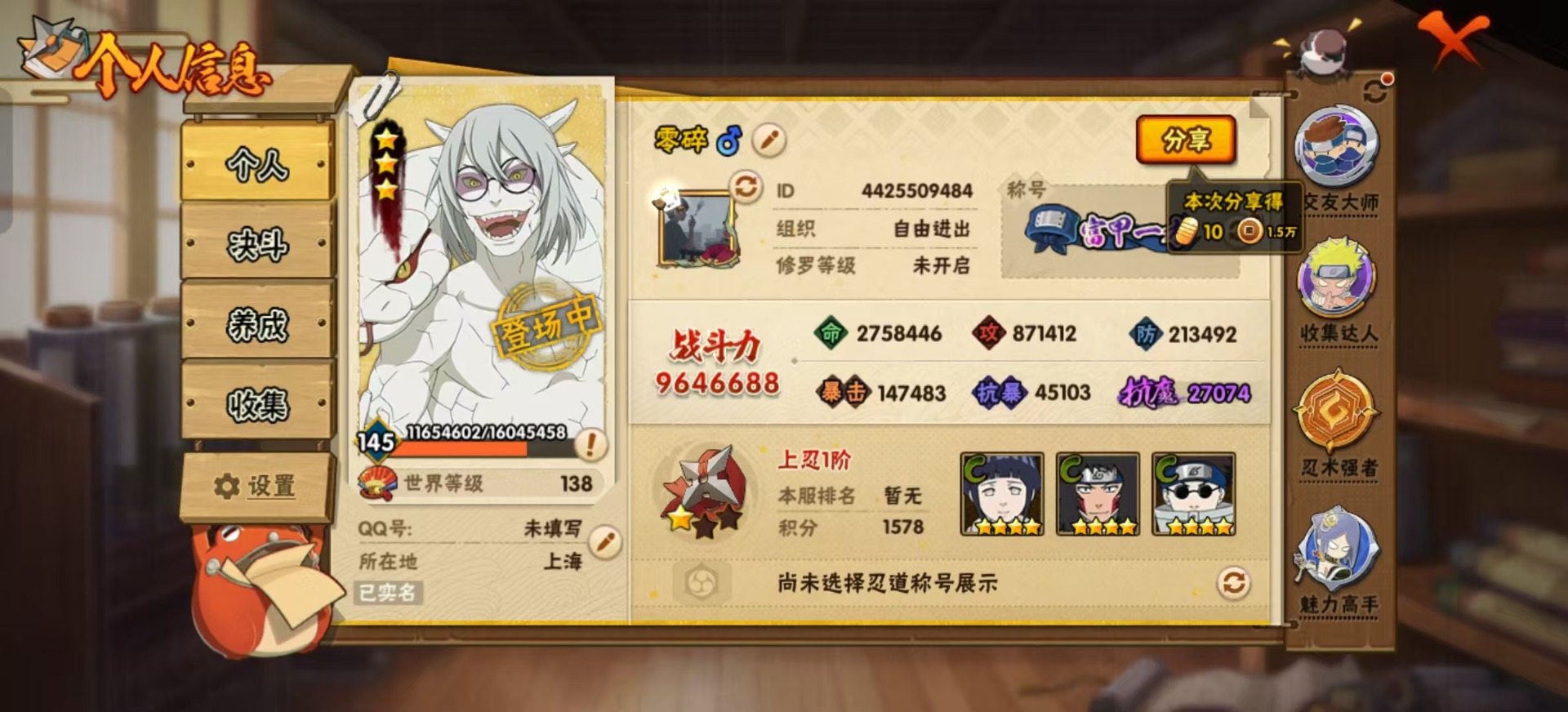 [10246285]v11 18s忍 964.6w战力 可二次 可修改实名 s级忍者:宇智波止水「须佐能乎」艾「忍界大战」大筒木桃式宇智波斑「秽土转生·解」宇智波佐助「永恒万花筒」神秘面具男 「红夜之刃」漩涡鸣人 「九喇嘛连结」宇智波带土 「忍界大战」千手柱间「秽土转生」自来也 「舞之豪杰」大筒木舍人 「最终章」药师兜「仙人模式」“宇智波斑” 「白面具」猿飞日斩「秽土转生」宇智波鼬 「须佐能乎」佩恩「天道」波风水门大蛇丸