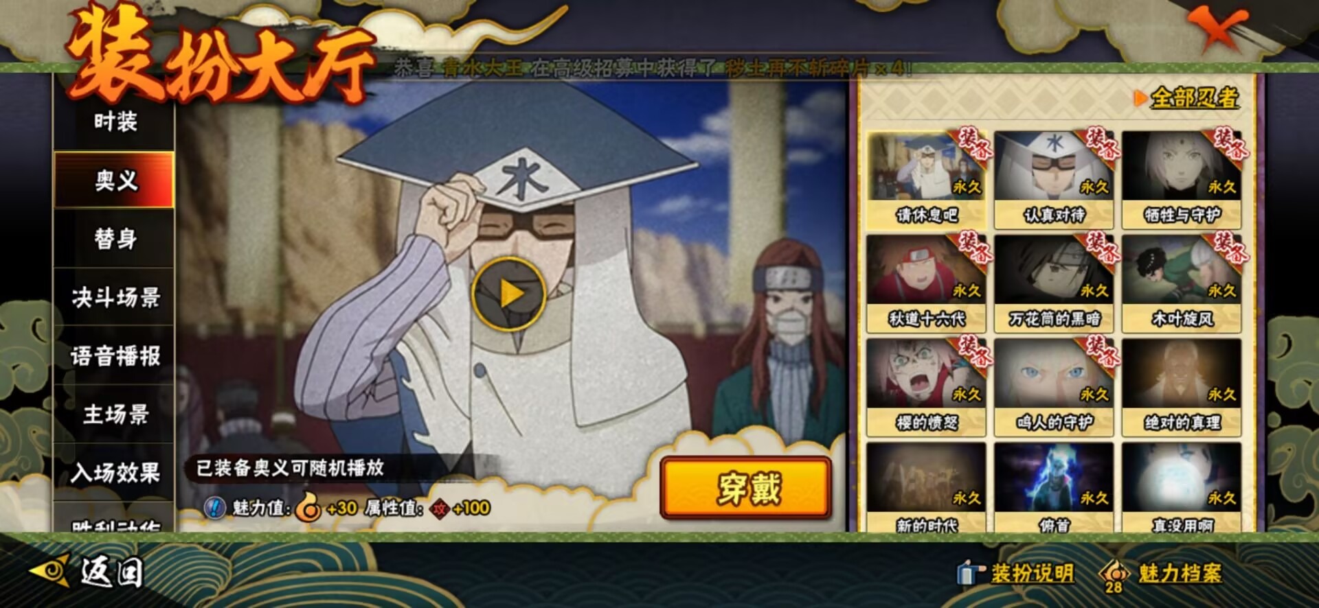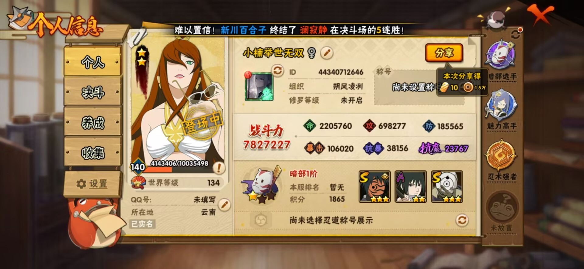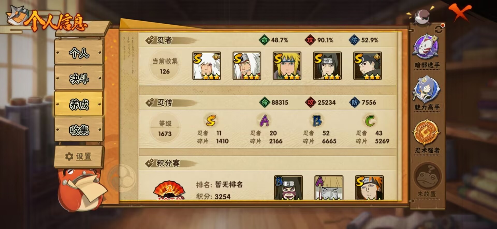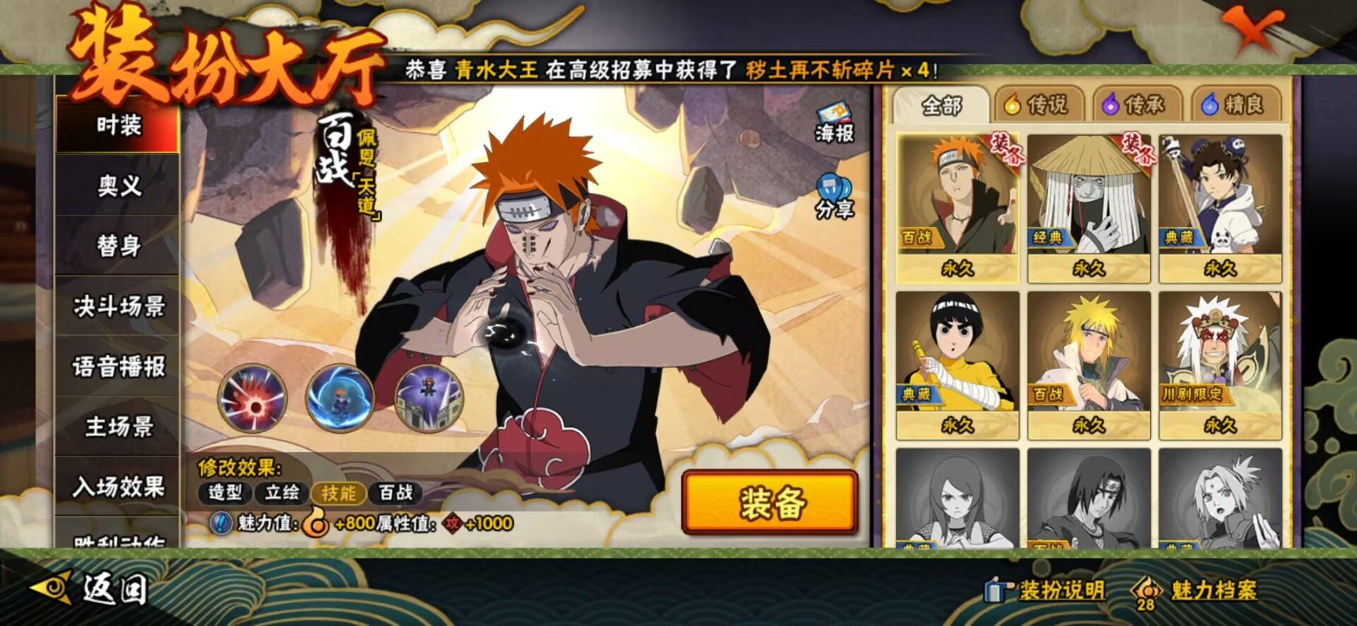[10326703]v10 11s忍 782.7w战力 可二次 可修改实名 s级忍者:宇智波止水「须佐能乎」艾「忍界大战」大筒木桃式神秘面具男 「红夜之刃」宇智波带土 「忍界大战」自来也 「舞之豪杰」自来也 「传说中的三忍」“宇智波斑” 「白面具」宇智波鼬 「须佐能乎」佩恩「天道」波风水门