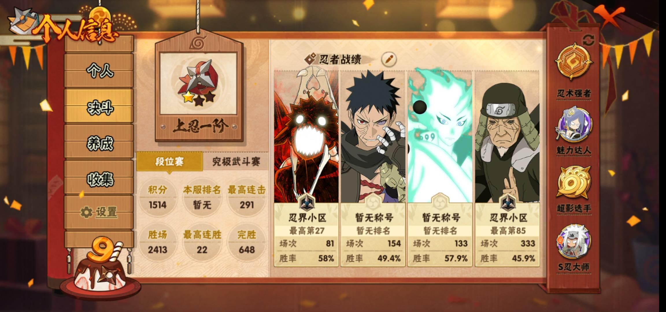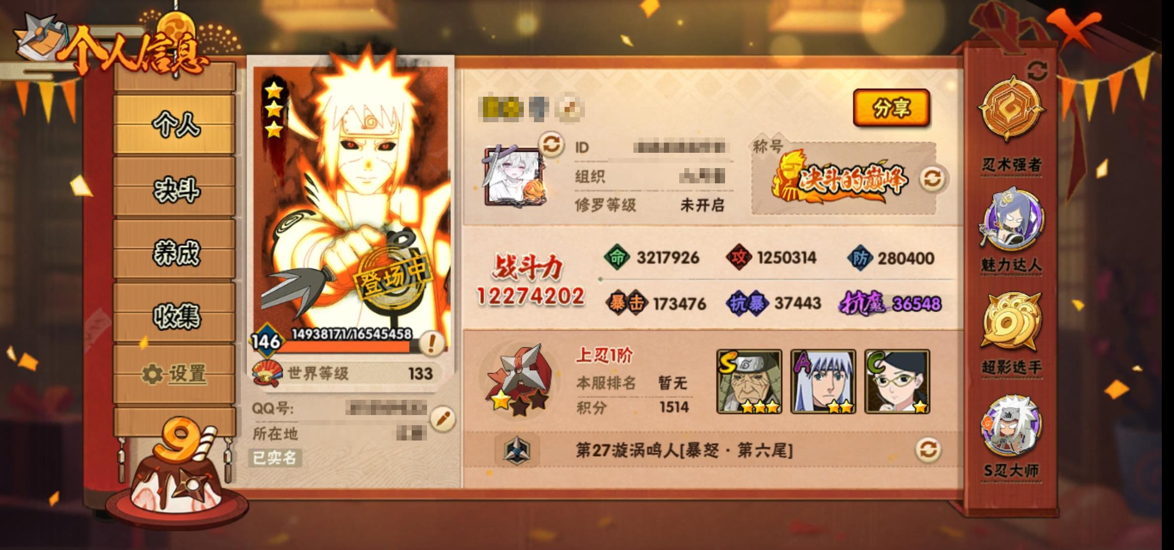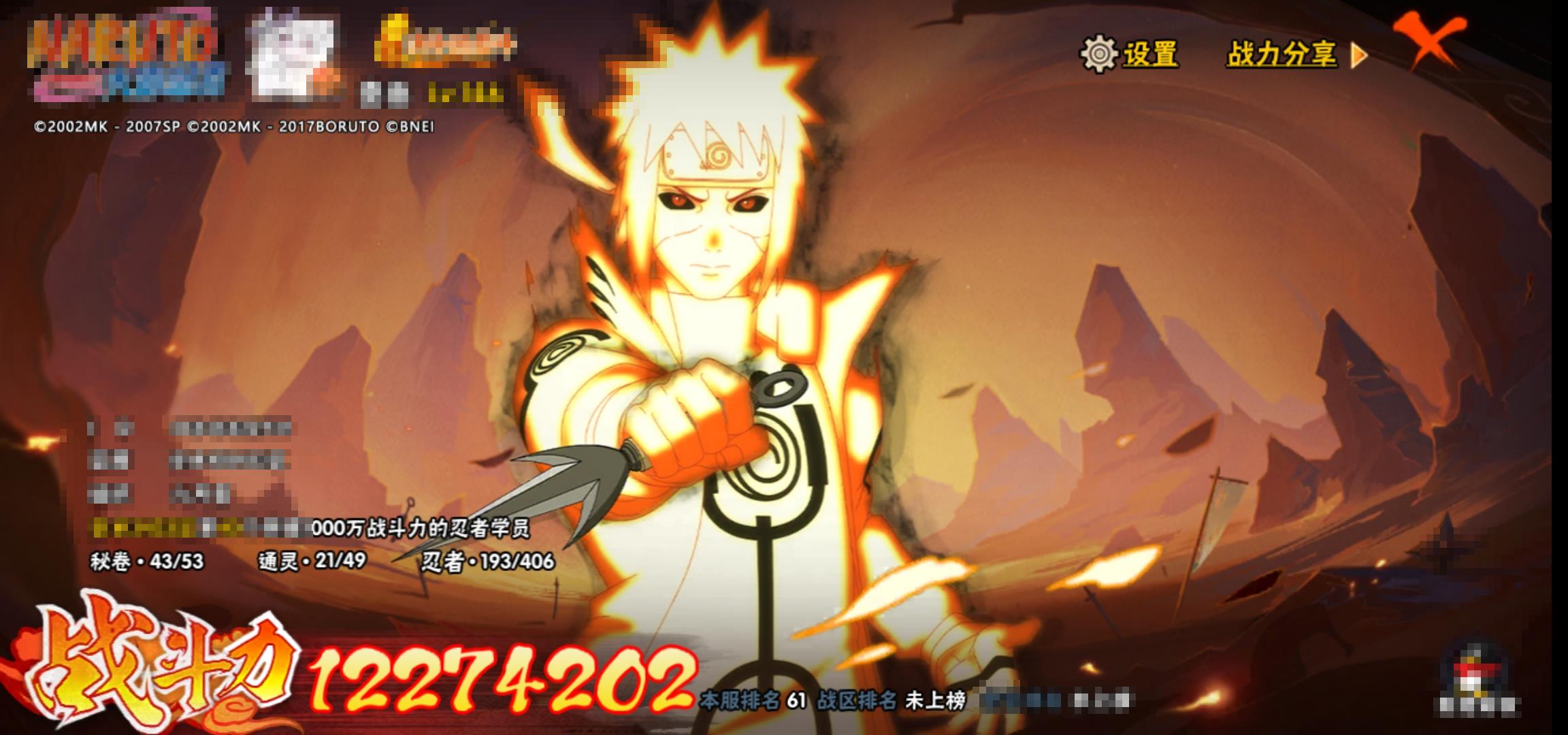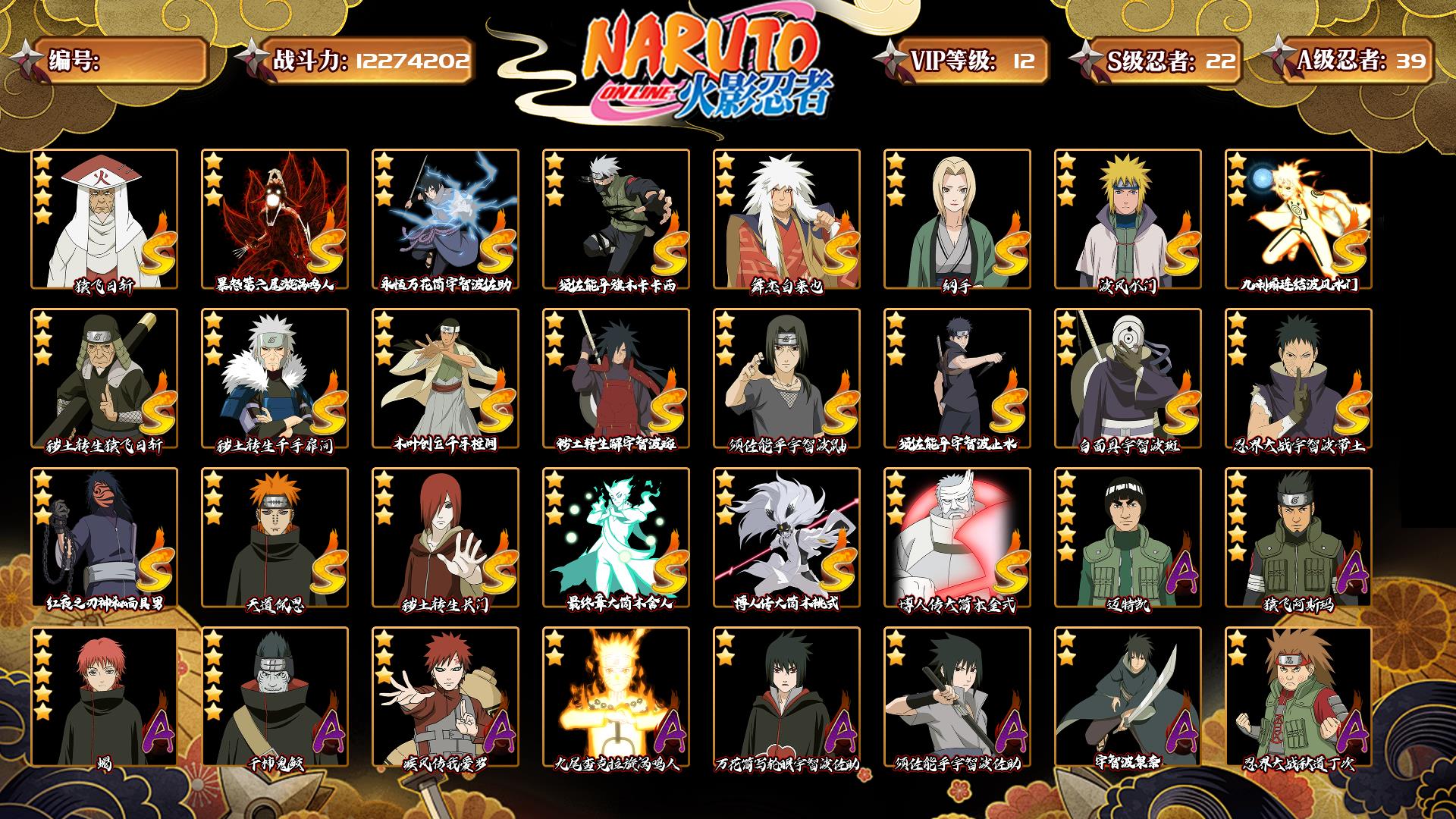 [11889584]vip12,1227w战力,s忍22个,a忍39个,本服排名61,战区排名未上榜,通灵兽21个,7时装,上忍1阶,忍者星数479