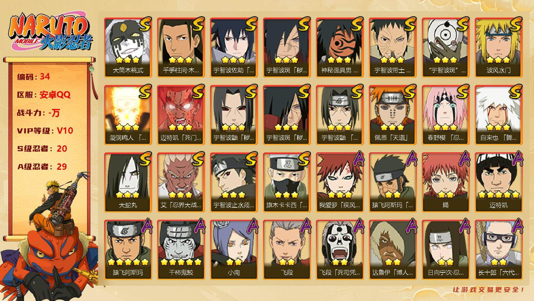 [12347171]【编号20455可秒换绑】店长推荐特价处理精品号【商品标题】:20s级忍者数-29a级忍者数 【s级忍者】:宇智波鼬「秽土转生」3星,宇智波斑「秽土转生」3星,宇智波斑「秽土转生·解」3星,春野樱「忍界大战」3星,宇智波带土「忍界大战」3星,艾「忍界大战」3星,宇智波鼬「须佐能乎」3星,宇智波止水「须佐能乎」3星,旗木卡卡西「须佐能乎」3星,千手柱间「木叶创立」3星,自来也「舞之豪杰」3星,大蛇丸3星,波风水门3星,神秘面具男「红夜之刃」3星,漩涡鸣人「九喇嘛连结」3星,迈特凯「死门」3星,佩恩「天道」3星,宇智波佐助「永恒万花筒」3星,宇智波斑 「白面具」3星宇智波斑「白面具」,大筒木桃式3星 【a级忍者】:艾「青年」2星,长门「青年」2星,波风水门「青年」2星,达鲁伊「博人传」2星,飞段2星,飞段「死司凭血」2星,干柿鬼鲛5星,漩涡博人「桃式显现」2星,迈特凯5星,我爱罗「疾风传」3星,蝎2星,蝎「绯流琥」2星,小南2星,小南「新春限定」2星,小南「漂泊浪客」2星,角都「秽土转生」2星,猿飞阿斯玛5星,猿飞阿斯玛「秽土转生」2星,宇智波佐助「须佐能乎」2星,日向宁次「忍界大战」2星,日向雏田「最终章」2星,宇智波带土「漂泊浪客」2星,长十郎「六代目水影」2星,李洛克「忍界大战」2星,黑土「博人传」2星,秋道丁次「忍界大战」2星,千代「近松十人卫」2星,加藤断2星,宇智波泉奈2星