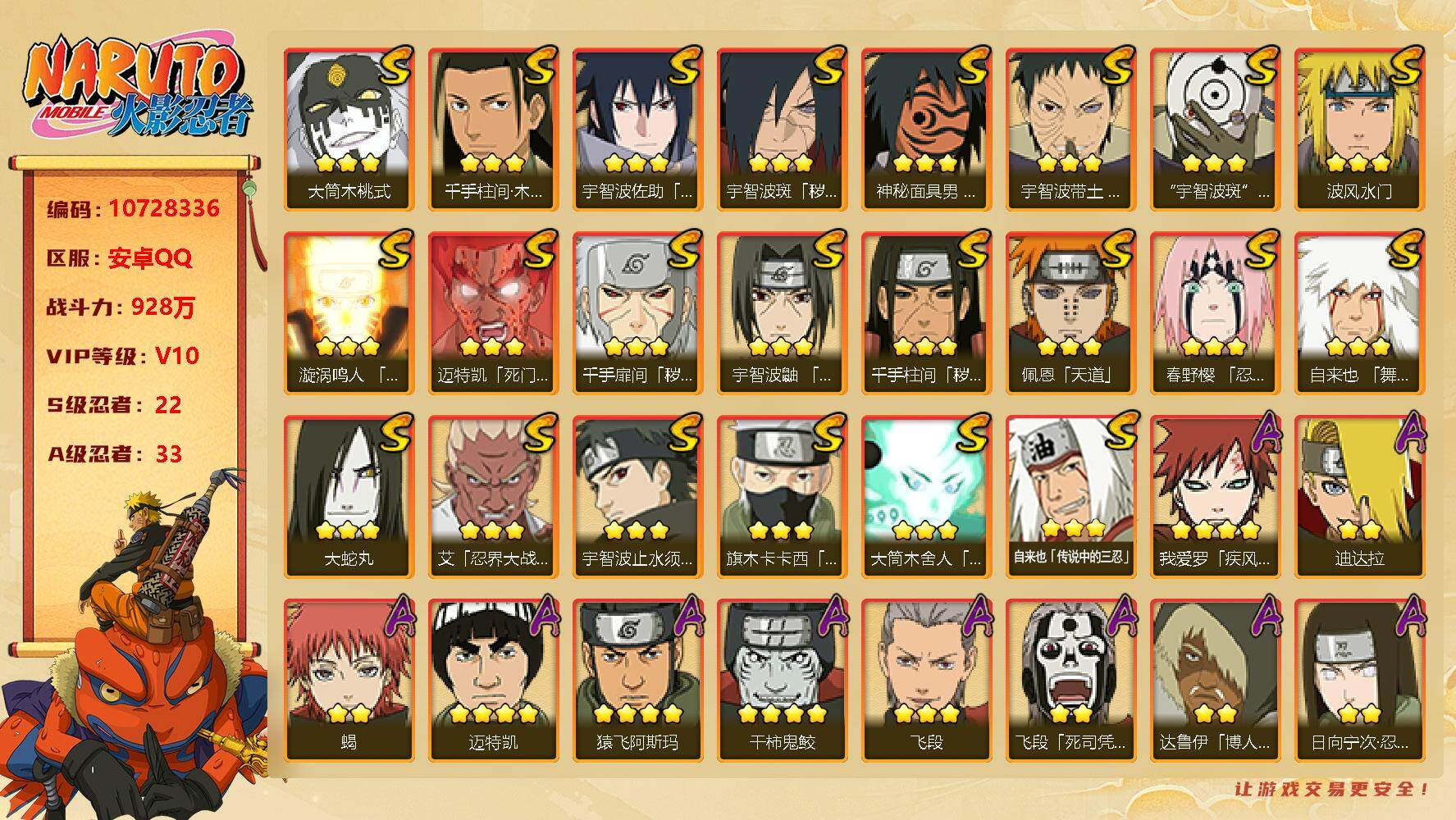 [12579282]【编号76732可秒换绑】【店长推荐精品号!】22s级忍者数-33a级忍者数 【s级忍者】:千手扉间「秽土转生」3星,千手柱间「秽土转生」3星,宇智波斑「秽土转生·解」3星,春野樱「忍界大战」3星,宇智波带土「忍界大战」3星,艾「忍界大战」3星,宇智波鼬「须佐能乎」3星,宇智波止水「须佐能乎」3星,旗木卡卡西「须佐能乎」3星,千手柱间「木叶创立」3星,自来也「舞之豪杰」3星,大蛇丸3星,自来也「传说中的三忍」3星,波风水门3星,神秘面具男「红夜之刃」3星,漩涡鸣人「九喇嘛连结」3星,迈特凯「死门」3星,佩恩「天道」3星,宇智波佐助「永恒万花筒」3星,宇智波斑 「白面具」3星宇智波斑「白面具」,大筒木桃式3星,大筒木舍人「最终章」3星 【a级忍者】:艾「青年」2星,长门「青年」2星,波风水门「青年」2星,达鲁伊「博人传」2星,迪达拉2星,奇拉比「忍界大战」2星,飞段3星,飞段「死司凭血」2星,干柿鬼鲛4星,漩涡博人「桃式显现」2星,漩涡鸣人「九尾查克拉」2星,迈特凯4星,旗木卡卡西「幻之真容」2星,我爱罗「疾风传」4星,蝎2星,蝎「绯流琥」2星,角都「秽土转生」2星,猿飞阿斯玛4星,宇智波鼬2星,宇智波佐助「须佐能乎」2星,照美冥「五代目水影」2星,日向宁次「忍界大战」2星,日向雏田「最终章」2星,长十郎「六代目水影」2星,神秘面具男「忍者之路」2星,佩恩·六道「漂泊浪客」2星,李洛克「忍界大战」2星,黑土「博人传」2星,秋道丁次「忍界大战」2星,千代「近松十人卫」2星,不缘2星,不风2星,宇智波泉奈2星