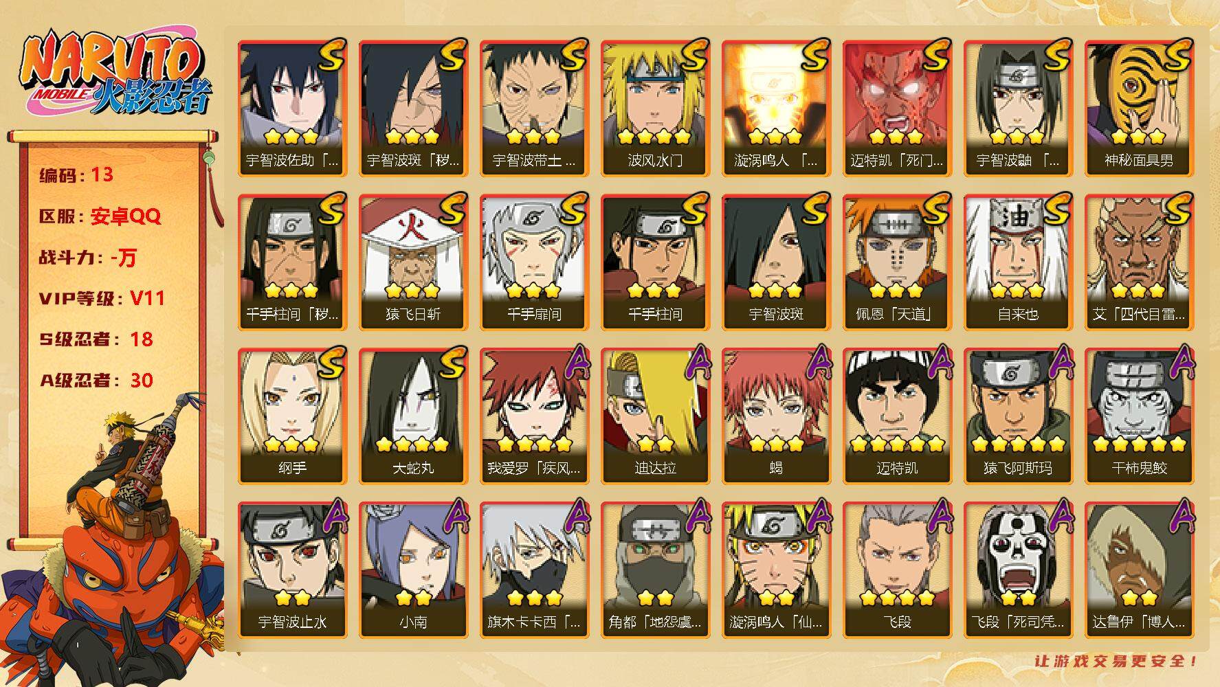 [12628883]【编号74144可秒换绑】店长推荐精品号18s级忍者数-30a级忍者数 【s级忍者】:千手柱间「秽土转生」3星,宇智波斑「秽土转生·解」3星,宇智波带土「忍界大战」3星,宇智波鼬「须佐能乎」3星,艾「四代目雷影」3星,自来也3星,大蛇丸4星,纲手3星,千手柱间3星,千手扉间3星,猿飞日斩3星,宇智波斑3星,波风水门4星,神秘面具男3星,漩涡鸣人「九喇嘛连结」3星,迈特凯「死门」3星,佩恩「天道」3星,宇智波佐助「永恒万花筒」3星 【a级忍者】:艾「青年」2星,长门「青年」2星,波风水门「青年」2星,达鲁伊「博人传」2星,迪达拉2星,迪达拉「秽土转生」2星,大蛇丸「晓」2星,奇拉比3星,飞段4星,飞段「死司凭血」2星,干柿鬼鲛5星,漩涡鸣人「仙人模式」2星,迈特凯5星,旗木卡卡西「万花筒写轮眼」3星,我爱罗「疾风传」4星,蝎3星,小南2星,角都「地怨虞」2星,猿飞阿斯玛5星,宇智波止水2星,宇智波鼬2星,宇智波佐助「须佐能乎」2星,宇智波佐助「万花筒写轮眼」2星,照美冥「五代目水影」2星,日向宁次「忍界大战」2星,长十郎「六代目水影」2星,黑土「博人传」2星,春野樱「百豪」2星,秋道丁次「忍界大战」2星,千代「近松十人卫」2星