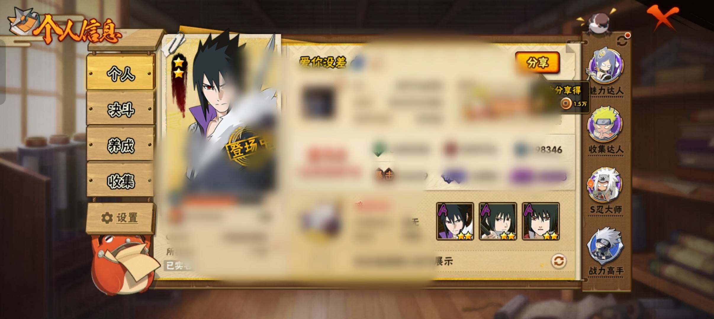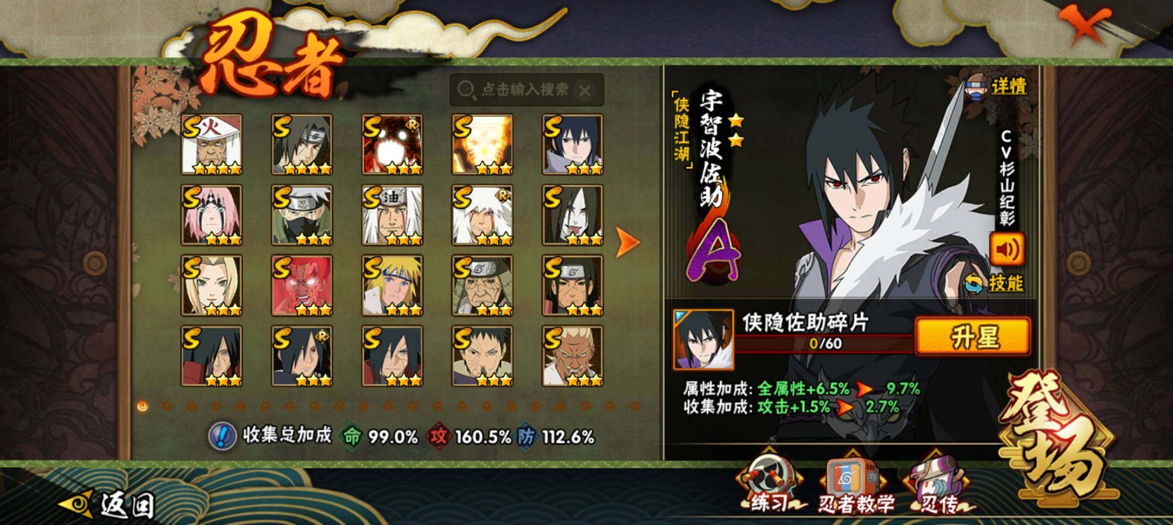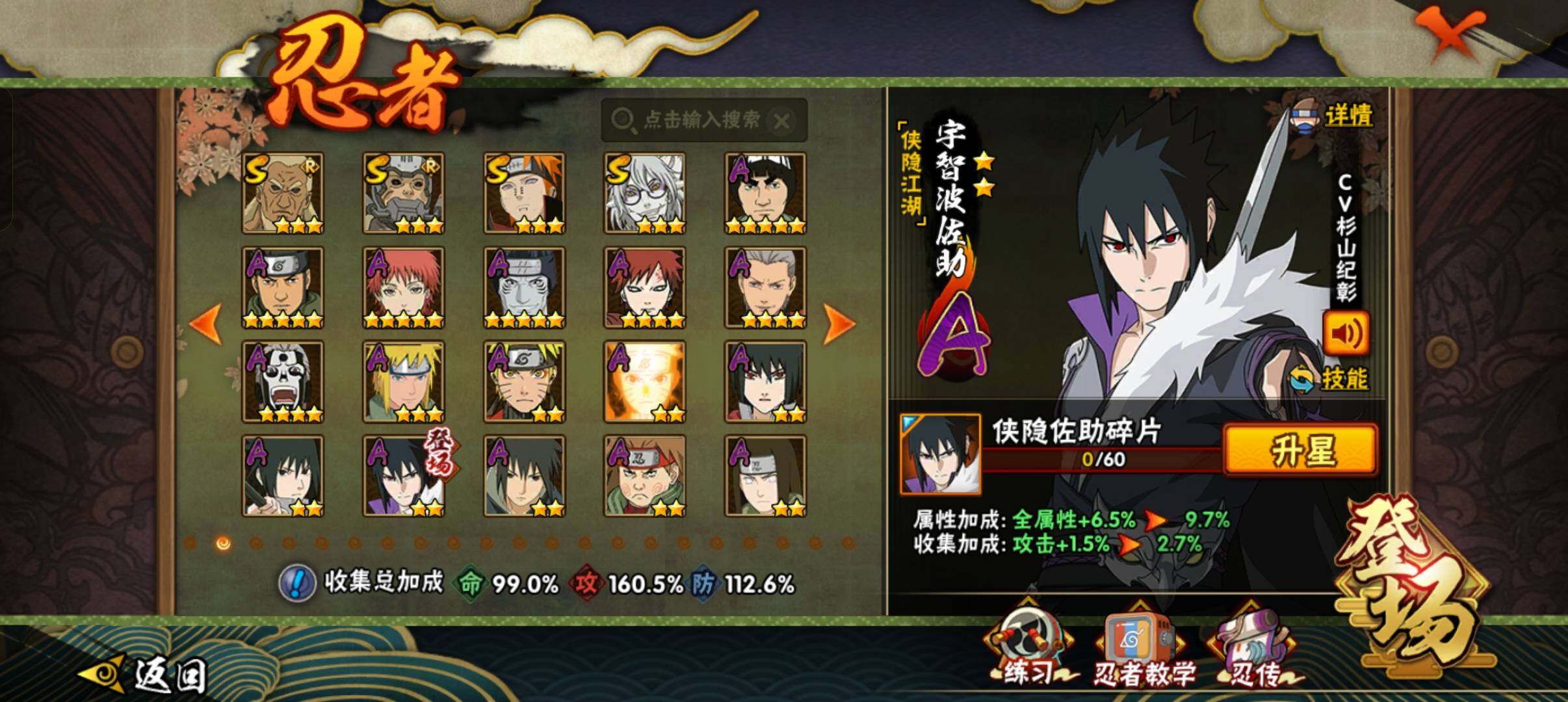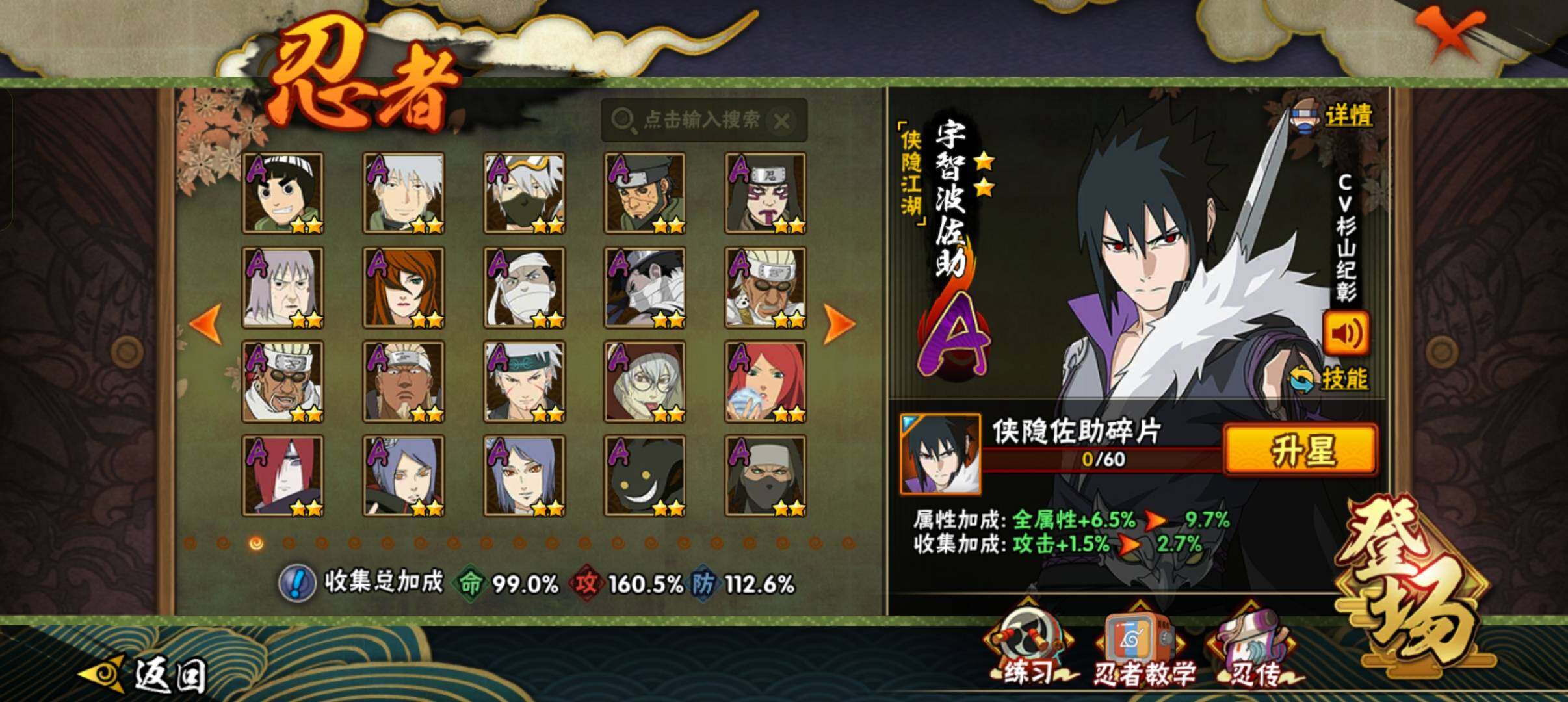 24s级忍者数-47a级忍者数 【s级忍者】:半藏「秽土转生」3星,猿飞日斩「秽土转生」3星,千手柱间「秽土转生」3星,宇智波斑「秽土转生」3星,宇智波斑「秽土转生·解」3星,春野樱「忍界大战」3星,宇智波带土「忍界大战」3星,艾「忍界大战」3星,宇智波鼬「须佐能乎」4星,旗木卡卡西「须佐能乎」3星,宇智波斑「木叶创立」3星,艾「三代目雷影」3星,自来也3星,自来也「舞之豪杰」3星,大蛇丸3星,纲手3星,猿飞日斩4星,波风水门3星,药师兜「仙人模式」3星,漩涡鸣人「九喇嘛连结」3星,迈特凯「死门」3星,佩恩「天道」3星,宇智波佐助「永恒万花筒」3星,漩涡鸣人「暴怒·第六尾」3星 【a级忍者】:艾「青年」2星,长门「青年」2星,波风水门「青年」3星,达鲁伊「博人传」2星,迪达拉2星,迪达拉「秽土转生」2星,大蛇丸「晓」2星,奇拉比2星,奇拉比「忍界大战」2星,飞段4星,飞段「死司凭血」4星,干柿鬼鲛5星,漩涡博人「桃式显现」2星,漩涡鸣人「仙人模式」2星,漩涡鸣人「九尾查克拉」2星,迈特凯5星,旗木卡卡西「元气夏日」2星,旗木卡卡西「幻之真容」2星,桃地再不斩「漂泊武士」2星,桃地再不斩「秽土转生」2星,我爱罗「疾风传」4星,蝎5星,蝎「绯流琥」2星,小南2星,小南「夏日泳装」2星,角都「地怨虞」2星,角都「晓创生」2星,猿飞阿斯玛5星,猿飞阿斯玛「秽土转生」2星,宇智波鼬2星,宇智波佐助「须佐能乎」2星,宇智波佐助「万花筒写轮眼」2星,宇智波佐助「侠隐江湖」2星,药师兜「半蛇斗篷」2星,照美冥「五代目水影」2星,日向宁次「忍界大战」2星,黑绝2星,长十郎「六代目水影」2星,李洛克「忍界大战」2星,黑土「博人传」2星,千手扉间「漂泊武士」2星,勘九郎「忍界大战」2星,秋道丁次「忍界大战」2星,千代「近松十人卫」2星,神农「羁绊」2星,不风2星,宇智波泉奈2星 【通灵兽】:忍犬,蓝蛇,蛤蟆吉,忍龟,镰鼬,蜃,山椒鱼,猿魔,蛤蟆仙人,鲛鲨,蛤蟆健,乌鸦,蛤蟆龙,蛤蟆广,梦貘,鵺,蛞蝓,螃蟹,砂之守鹤,蜘蛛