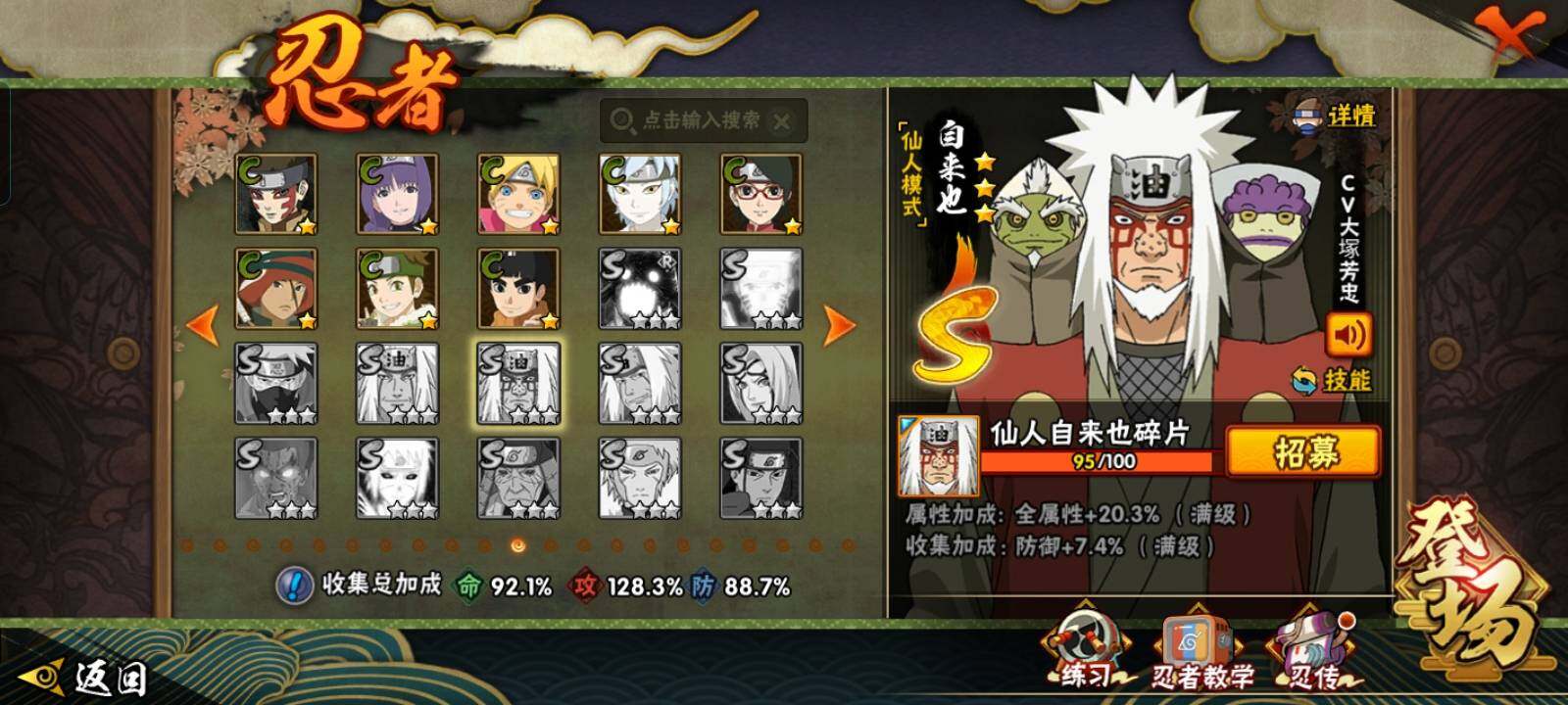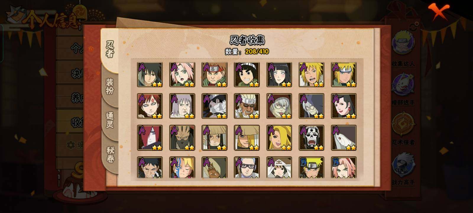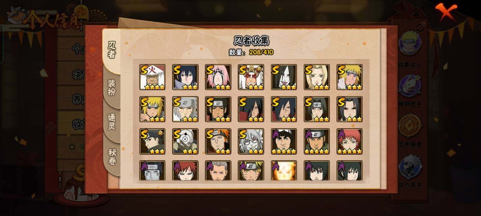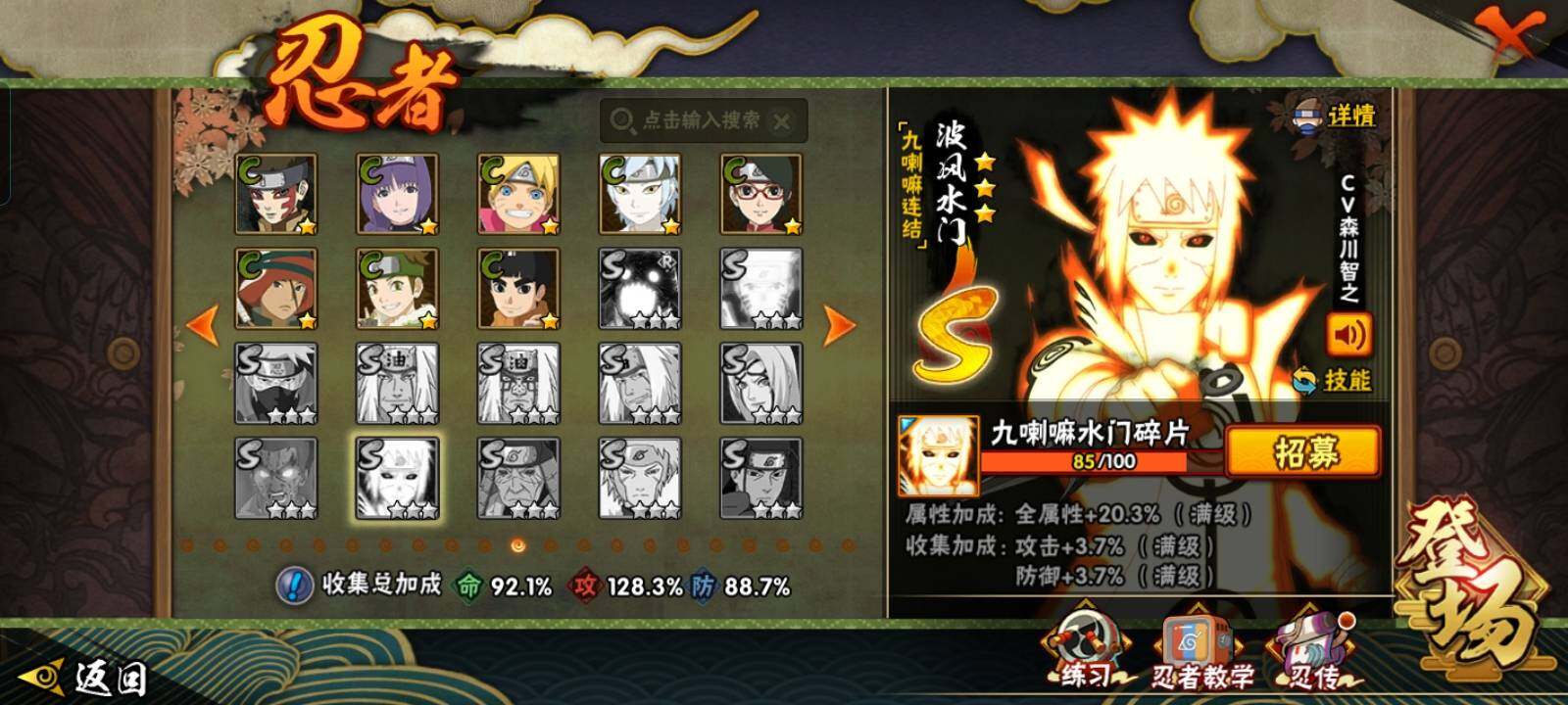 18s级忍者数-36a级忍者数 【s级忍者】:波风水门「秽土转生」3星,千手扉间「秽土转生」3星,千手柱间「秽土转生」3星,宇智波鼬「秽土转生」3星,宇智波斑「秽土转生」3星,宇智波斑「秽土转生·解」3星,春野樱「忍界大战」3星,宇智波鼬「须佐能乎」3星,宇智波止水「须佐能乎」3星,自来也「舞之豪杰」3星,大蛇丸3星,纲手3星,猿飞日斩4星,波风水门3星,药师兜「仙人模式」3星,佩恩「天道」3星,宇智波佐助「永恒万花筒」3星,宇智波斑 「白面具」3星宇智波斑「白面具」 【a级忍者】:长门「青年」2星,波风水门「青年」2星,波风水门「新春限定」2星,达鲁伊「博人传」2星,迪达拉2星,迪达拉「秽土转生」2星,奇拉比「忍界大战」2星,飞段3星,飞段「死司凭血」2星,干柿鬼鲛5星,漩涡博人「桃式显现」2星,漩涡鸣人「仙人模式」2星,漩涡鸣人「九尾查克拉」2星,迈特凯5星,桃地再不斩「秽土转生」2星,我爱罗「疾风传」3星,我爱罗「忍界大战」2星,蝎5星,蝎「绯流琥」2星,猿飞阿斯玛5星,宇智波鼬2星,宇智波佐助「须佐能乎」2星,宇智波佐助「万花筒写轮眼」2星,药师兜「半蛇斗篷」2星,药师兜「侠影江湖」2星,日向雏田「最终章」2星,宇智波带土「暴怒」2星,宇智波带土「漂泊浪客」2星,长十郎「六代目水影」2星,李洛克「忍界大战」2星,黑土「博人传」2星,春野樱「百豪」2星,秋道丁次「忍界大战」2星,千代「近松十人卫」2星,不缘2星,宇智波泉奈2星