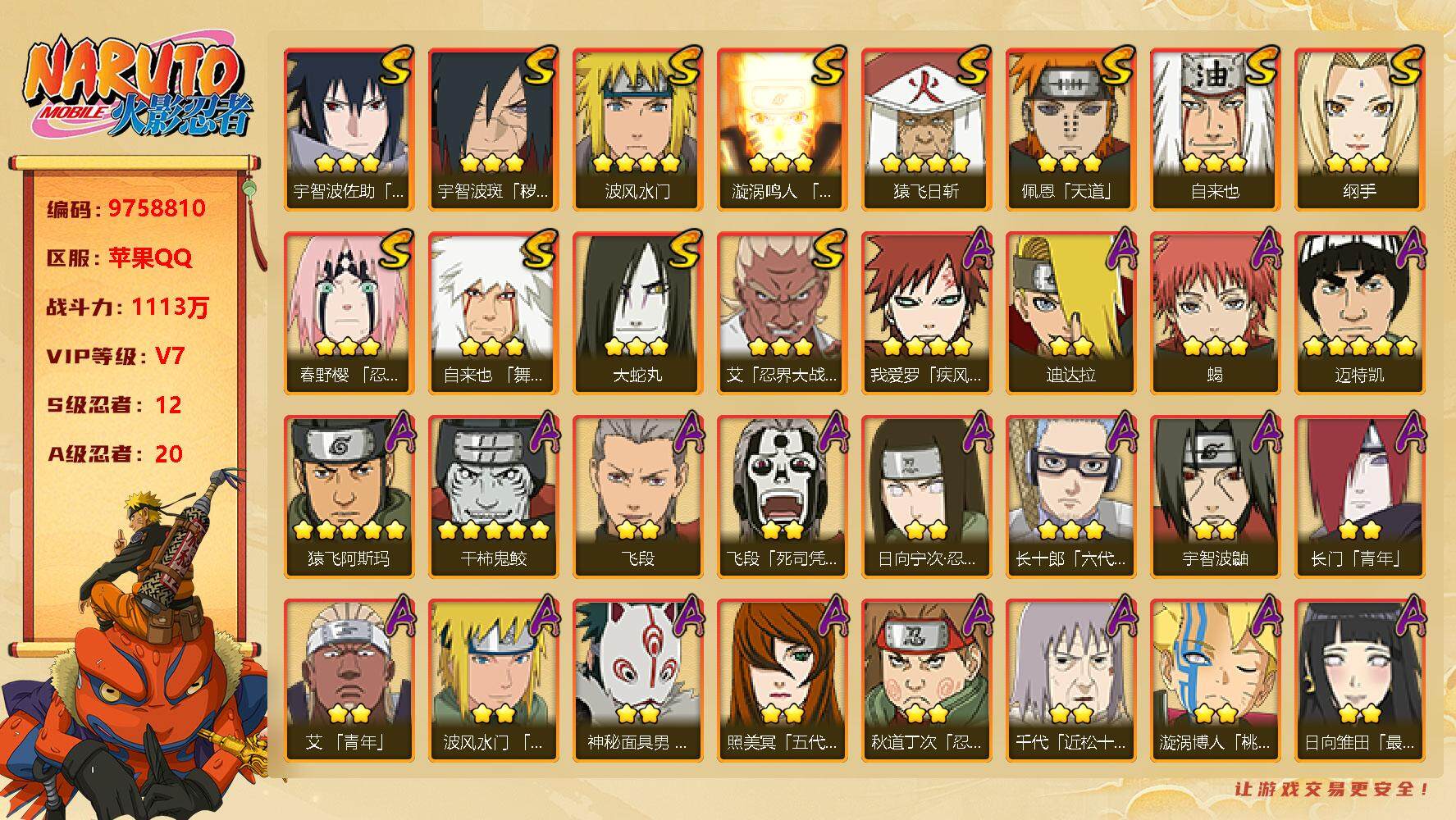 [12705915]【编号12126可秒换绑】店长推荐特价处理精品号12s级忍者数-20a级忍者数 【s级忍者】:宇智波斑「秽土转生·解」3星,春野樱「忍界大战」3星,艾「忍界大战」3星,自来也3星,自来也「舞之豪杰」3星,大蛇丸3星,纲手3星,猿飞日斩4星,波风水门4星,漩涡鸣人「九喇嘛连结」3星,佩恩「天道」3星,宇智波佐助「永恒万花筒」3星 【a级忍者】:艾「青年」2星,长门「青年」2星,波风水门「青年」2星,迪达拉2星,飞段2星,飞段「死司凭血」2星,干柿鬼鲛5星,漩涡博人「桃式显现」2星,迈特凯5星,我爱罗「疾风传」4星,蝎3星,猿飞阿斯玛5星,宇智波鼬2星,照美冥「五代目水影」2星,日向宁次「忍界大战」2星,日向雏田「最终章」2星,长十郎「六代目水影」3星,神秘面具男「忍者之路」2星,秋道丁次「忍界大战」2星,千代「近松十人卫」2星