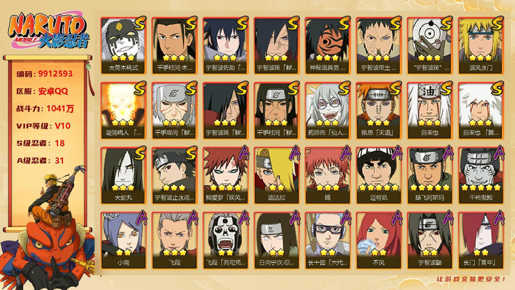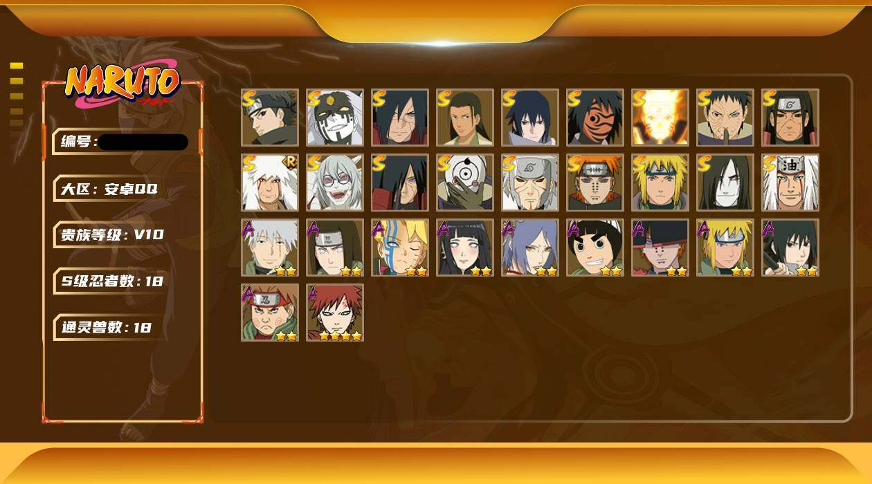 [12722087]【编号25597】店长推荐特价处理精品号 18s级忍者数-31a级忍者数 【s级忍者】:千手扉间「秽土转生」3星,千手柱间「秽土转生」3星,宇智波斑「秽土转生」3星,宇智波斑「秽土转生·解」3星,宇智波带土「忍界大战」3星,宇智波止水「须佐能乎」3星,千手柱间「木叶创立」3星,自来也3星,自来也「舞之豪杰」3星,大蛇丸3星,波风水门3星,药师兜「仙人模式」3星,神秘面具男「红夜之刃」3星,漩涡鸣人「九喇嘛连结」3星,佩恩「天道」3星,宇智波佐助「永恒万花筒」3星,宇智波斑 「白面具」3星宇智波斑「白面具」,大筒木桃式3星 【a级忍者】:艾「青年」2星,长门「青年」2星,波风水门「青年」2星,迪达拉2星,迪达拉「秽土转生」2星,大蛇丸「晓」2星,奇拉比「忍界大战」2星,飞段3星,飞段「死司凭血」2星,干柿鬼鲛5星,漩涡博人「桃式显现」2星,迈特凯5星,旗木卡卡西「幻之真容」2星,我爱罗「疾风传」4星,蝎3星,小南2星,小南「漂泊浪客」2星,猿飞阿斯玛5星,宇智波鼬2星,宇智波佐助「须佐能乎」2星,宇智波佐助「万花筒写轮眼」2星,照美冥「五代目水影」2星,日向宁次「忍界大战」2星,日向雏田「最终章」2星,长十郎「六代目水影」2星,佩恩·六道「漂泊浪客」2星,李洛克「忍界大战」2星,黑土「博人传」2星,秋道丁次「忍界大战」2星,千代「近松十人卫」2星,不风2星