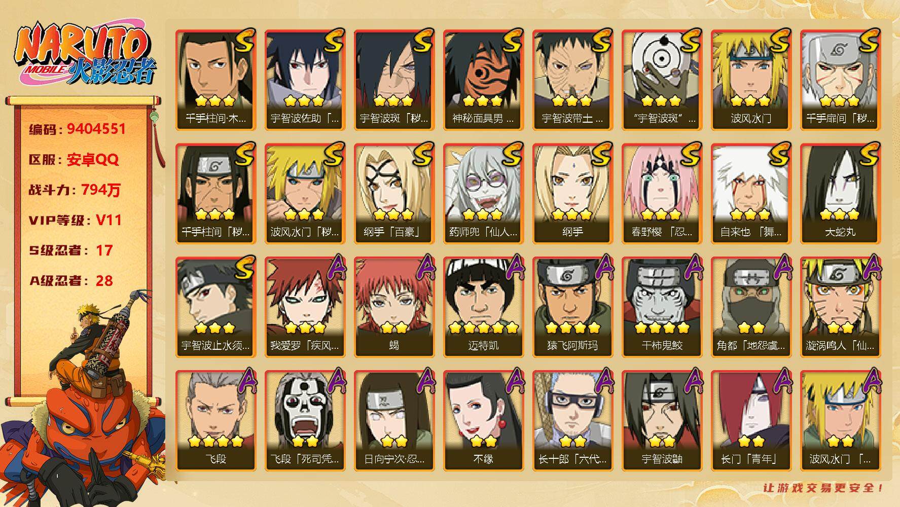 [12750501]【编号91313】【店长推荐捡漏号】17s级忍者数-28a级忍者数 【s级忍者】:波风水门「秽土转生」3星,千手扉间「秽土转生」3星,千手柱间「秽土转生」3星,宇智波斑「秽土转生·解」3星,春野樱「忍界大战」3星,宇智波带土「忍界大战」3星,宇智波止水「须佐能乎」3星,千手柱间「木叶创立」3星,自来也「舞之豪杰」3星,大蛇丸3星,纲手3星,纲手「百豪」3星,波风水门3星,药师兜「仙人模式」3星,神秘面具男「红夜之刃」3星,宇智波佐助「永恒万花筒」3星,宇智波斑 「白面具」3星宇智波斑「白面具」 【a级忍者】:长门「青年」2星,波风水门「青年」2星,迪达拉「秽土转生」2星,飞段4星,飞段「死司凭血」2星,干柿鬼鲛4星,漩涡鸣人「仙人模式」2星,漩涡鸣人「九尾查克拉」2星,迈特凯5星,我爱罗「疾风传」3星,蝎2星,小南「漂泊浪客」2星,角都「地怨虞」2星,猿飞阿斯玛4星,宇智波鼬2星,宇智波鼬「新春限定」2星,宇智波佐助「须佐能乎」2星,宇智波佐助「万花筒写轮眼」2星,药师兜「半蛇斗篷」2星,照美冥「夏日泳装」2星,照美冥「五代目水影」2星,日向宁次「忍界大战」2星,长十郎「六代目水影」2星,猿飞木叶丸「博人传」2星,黑土「博人传」2星,秋道丁次「忍界大战」2星,千代「近松十人卫」2星,不缘2星