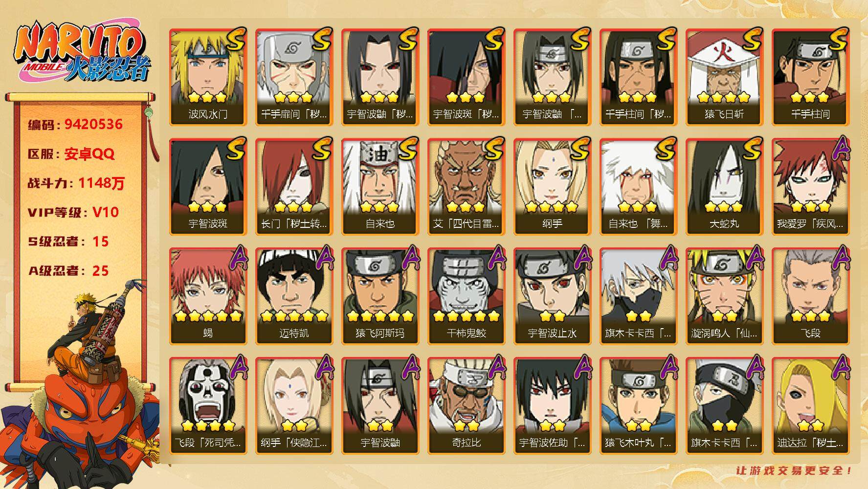 [12751749]【编号95121可秒换绑】【店长推荐捡漏号】15s级忍者数-25a级忍者数 【s级忍者】:长门「秽土转生」3星,千手扉间「秽土转生」3星,千手柱间「秽土转生」3星,宇智波鼬「秽土转生」3星,宇智波斑「秽土转生」3星,宇智波鼬「须佐能乎」3星,艾「四代目雷影」3星,自来也3星,自来也「舞之豪杰」3星,大蛇丸3星,纲手4星,千手柱间3星,猿飞日斩4星,宇智波斑3星,波风水门3星 【a级忍者】:迪达拉「秽土转生」2星,大蛇丸「晓」2星,奇拉比2星,奇拉比「忍界大战」2星,飞段3星,飞段「死司凭血」4星,干柿鬼鲛5星,漩涡鸣人「仙人模式」2星,漩涡鸣人「九尾查克拉」2星,迈特凯5星,旗木卡卡西「忍界大战」2星,旗木卡卡西「万花筒写轮眼」2星,我爱罗「疾风传」3星,蝎5星,猿飞阿斯玛5星,宇智波止水2星,宇智波鼬2星,宇智波佐助「须佐能乎」2星,宇智波佐助「万花筒写轮眼」2星,照美冥「五代目水影」2星,纲手「侠隐江湖」2星,猿飞木叶丸「博人传」2星,黑土「博人传」2星,春野樱「百豪」2星,千代「近松十人卫」2星