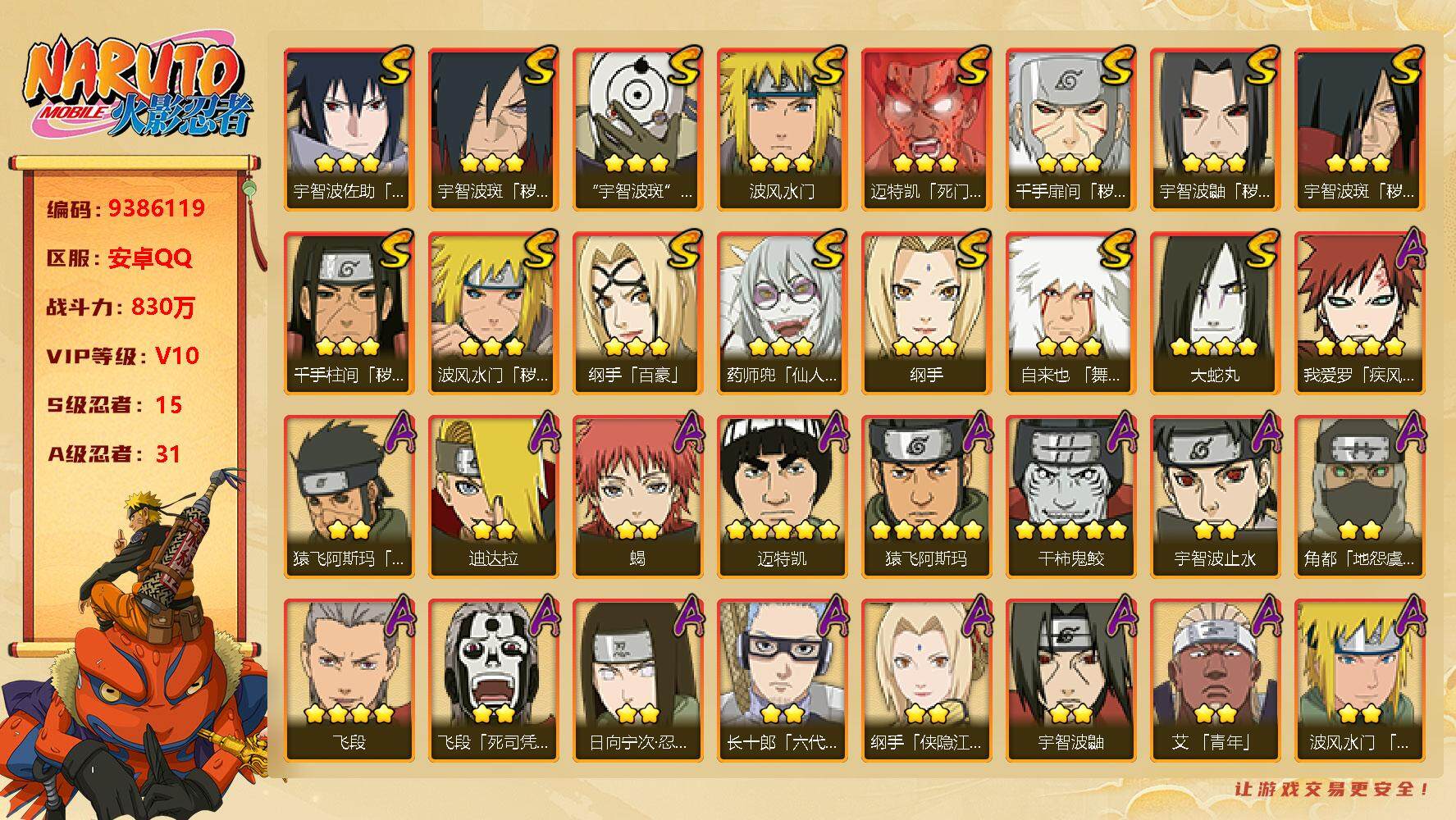 [12834944]【编号48608可秒换绑】【店长推荐捡漏号】15s级忍者数-31a级忍者数 【s级忍者】:波风水门「秽土转生」3星,千手扉间「秽土转生」3星,千手柱间「秽土转生」3星,宇智波鼬「秽土转生」3星,宇智波斑「秽土转生」3星,宇智波斑「秽土转生·解」3星,自来也「舞之豪杰」3星,大蛇丸4星,纲手3星,纲手「百豪」3星,波风水门3星,药师兜「仙人模式」3星,迈特凯「死门」3星,宇智波佐助「永恒万花筒」3星,宇智波斑 「白面具」3星宇智波斑「白面具」 【a级忍者】:艾「青年」2星,波风水门「青年」2星,迪达拉2星,迪达拉「秽土转生」2星,大蛇丸「晓」2星,奇拉比「忍界大战」2星,飞段4星,飞段「死司凭血」2星,干柿鬼鲛5星,漩涡鸣人「九尾查克拉」2星,迈特凯5星,我爱罗「疾风传」4星,我爱罗「忍界大战」2星,蝎2星,小南「夏日泳装」2星,角都「地怨虞」2星,猿飞阿斯玛5星,猿飞阿斯玛「秽土转生」2星,宇智波止水2星,宇智波止水「新春限定」2星,宇智波鼬2星,宇智波佐助「须佐能乎」2星,药师兜「半蛇斗篷」3星,照美冥「五代目水影」2星,日向宁次「忍界大战」2星,长十郎「六代目水影」2星,纲手「侠隐江湖」2星,猿飞木叶丸「博人传」2星,黑土「博人传」2星,秋道丁次「忍界大战」2星,千代「近松十人卫」2星
