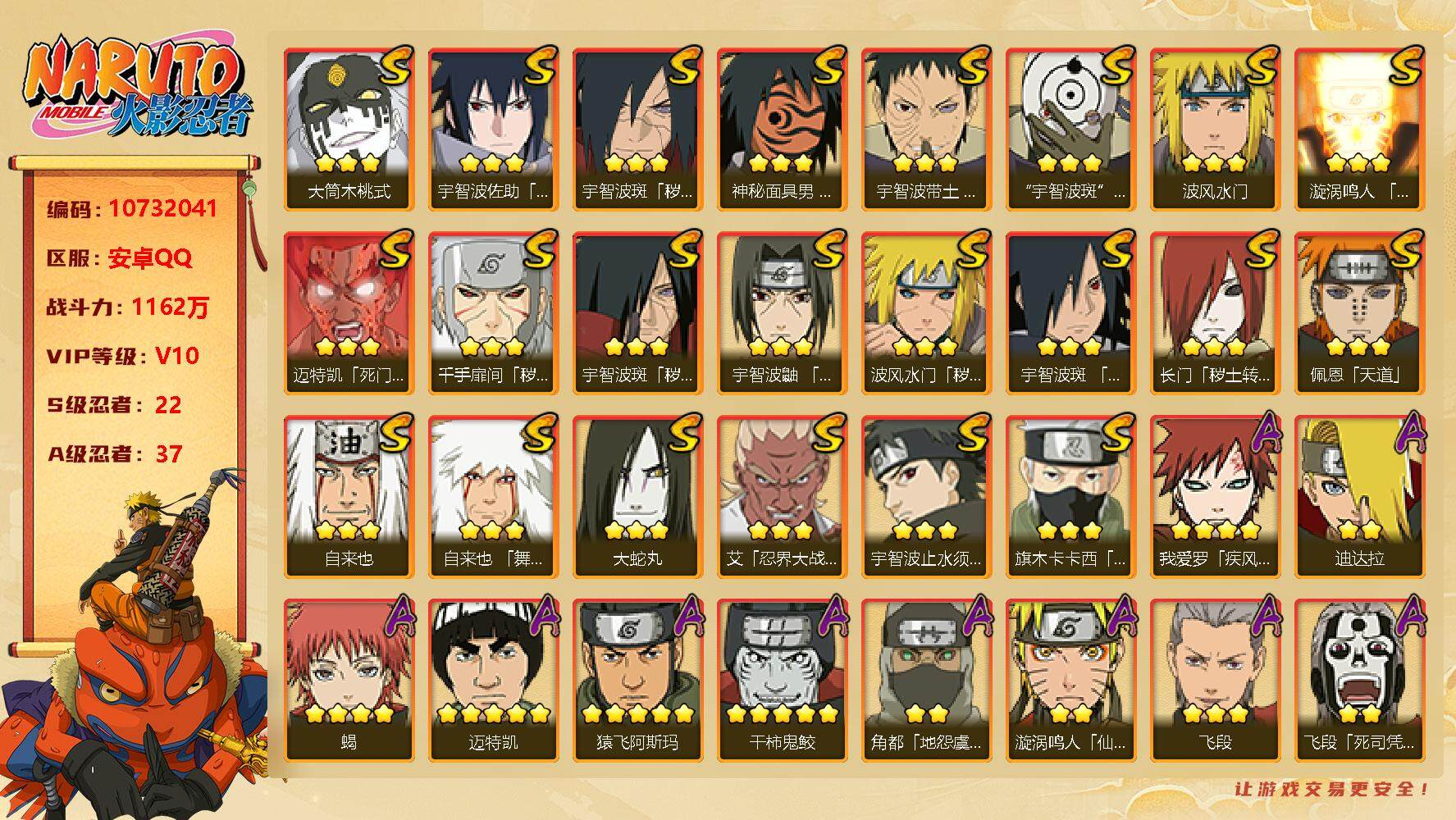 [12872361]【编号19729 可秒换绑】【店长推荐精品号】22s级忍者数-37a级忍者数 【s级忍者】:长门「秽土转生」3星,波风水门「秽土转生」3星,千手扉间「秽土转生」3星,宇智波斑「秽土转生」3星,宇智波斑「秽土转生·解」3星,宇智波带土「忍界大战」3星,艾「忍界大战」3星,宇智波鼬「须佐能乎」3星,宇智波止水「须佐能乎」3星,旗木卡卡西「须佐能乎」3星,宇智波斑「木叶创立」3星,自来也3星,自来也「舞之豪杰」3星,大蛇丸3星,波风水门3星,神秘面具男「红夜之刃」3星,漩涡鸣人「九喇嘛连结」3星,迈特凯「死门」3星,佩恩「天道」3星,宇智波佐助「永恒万花筒」3星,宇智波斑 「白面具」3星宇智波斑「白面具」,大筒木桃式3星 【a级忍者】:艾「青年」2星,长门「青年」2星,波风水门「青年」2星,达鲁伊「博人传」2星,迪达拉2星,迪达拉「秽土转生」2星,大蛇丸「晓」2星,奇拉比2星,飞段3星,飞段「死司凭血」2星,干柿鬼鲛5星,漩涡博人「桃式显现」2星,漩涡鸣人「仙人模式」2星,漩涡鸣人「九尾查克拉」2星,迈特凯5星,我爱罗「疾风传」4星,我爱罗「忍界大战」2星,蝎4星,蝎「绯流琥」2星,角都「地怨虞」2星,角都「晓创生」2星,猿飞阿斯玛5星,宇智波鼬2星,宇智波佐助「须佐能乎」2星,宇智波佐助「万花筒写轮眼」2星,药师兜「半蛇斗篷」2星,照美冥「五代目水影」2星,日向宁次「忍界大战」2星,日向雏田「最终章」2星,宇智波带土「漂泊浪客」2星,长十郎「六代目水影」2星,李洛克「忍界大战」3星,勘九郎「忍界大战」2星,春野樱「百豪」2星,秋道丁次「忍界大战」2星,千代「近松十人卫」2星,宇智波泉奈2星