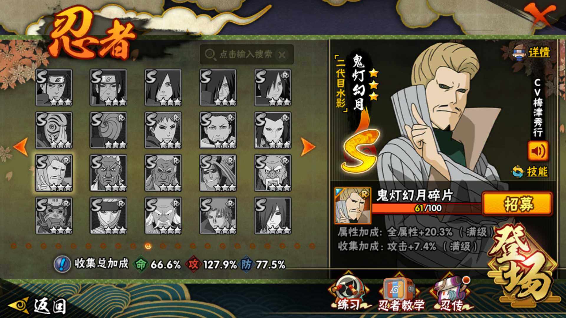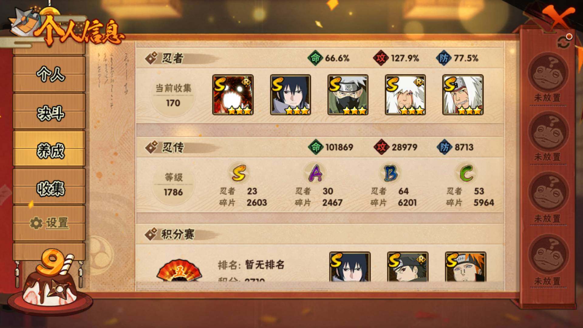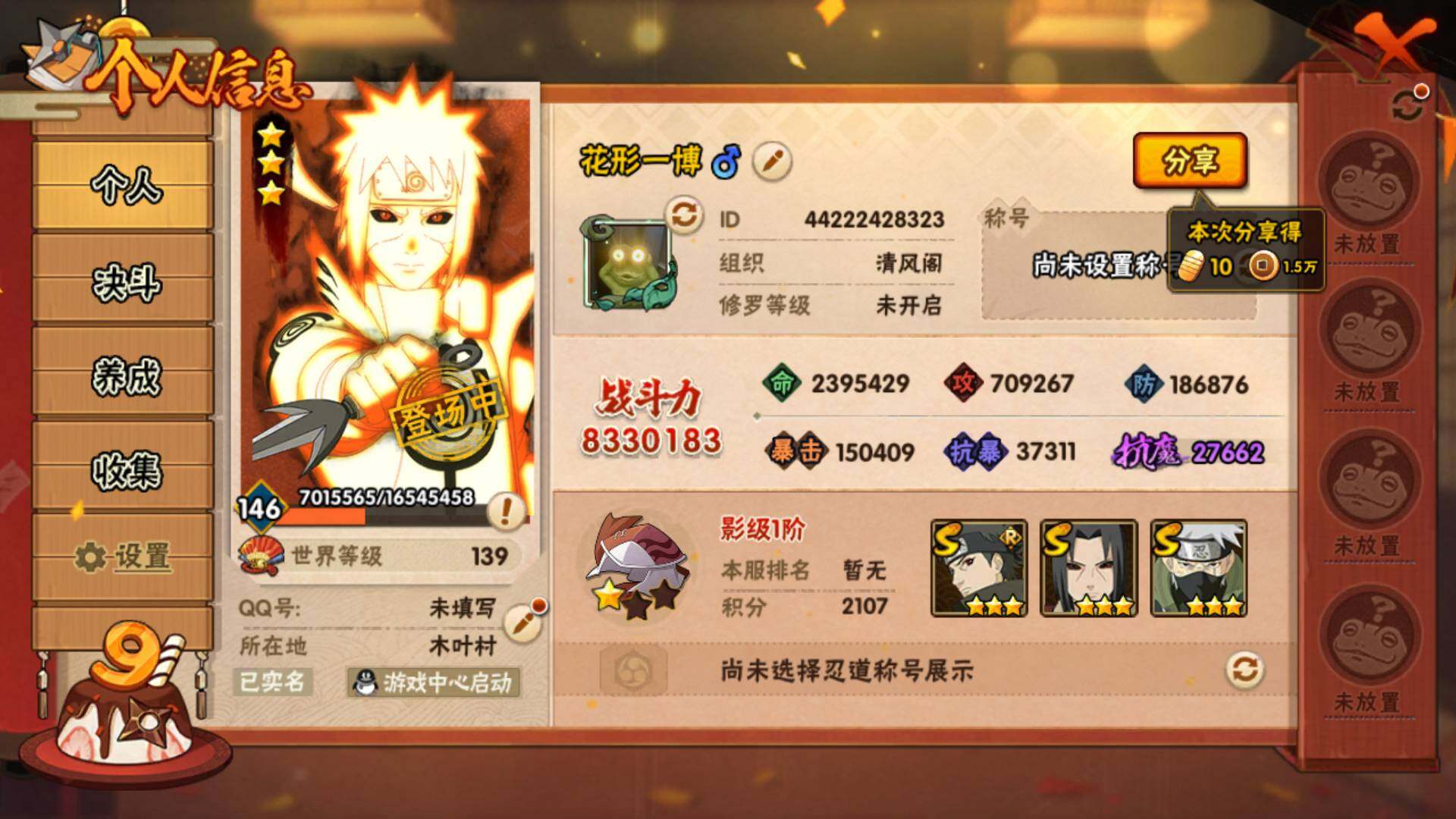 v10/833万战力/总忍者170/23s/30a/暴怒六尾/最终章舍人/红夜带土/须佐止水/创立柱间/九喇嘛水门/须佐卡卡西/传说自来也/白面具/忍战带土/忍战艾/秽土解斑/秽土鼬/秽土日斩/永恒佐助/死门凯/仙人兜/侠隐大野木/漂泊带土/真容卡卡西/秽土再不斩/秽土角都/神农/17通灵/49密卷/3.5千金币/210点卷/鬼灯幻月61片