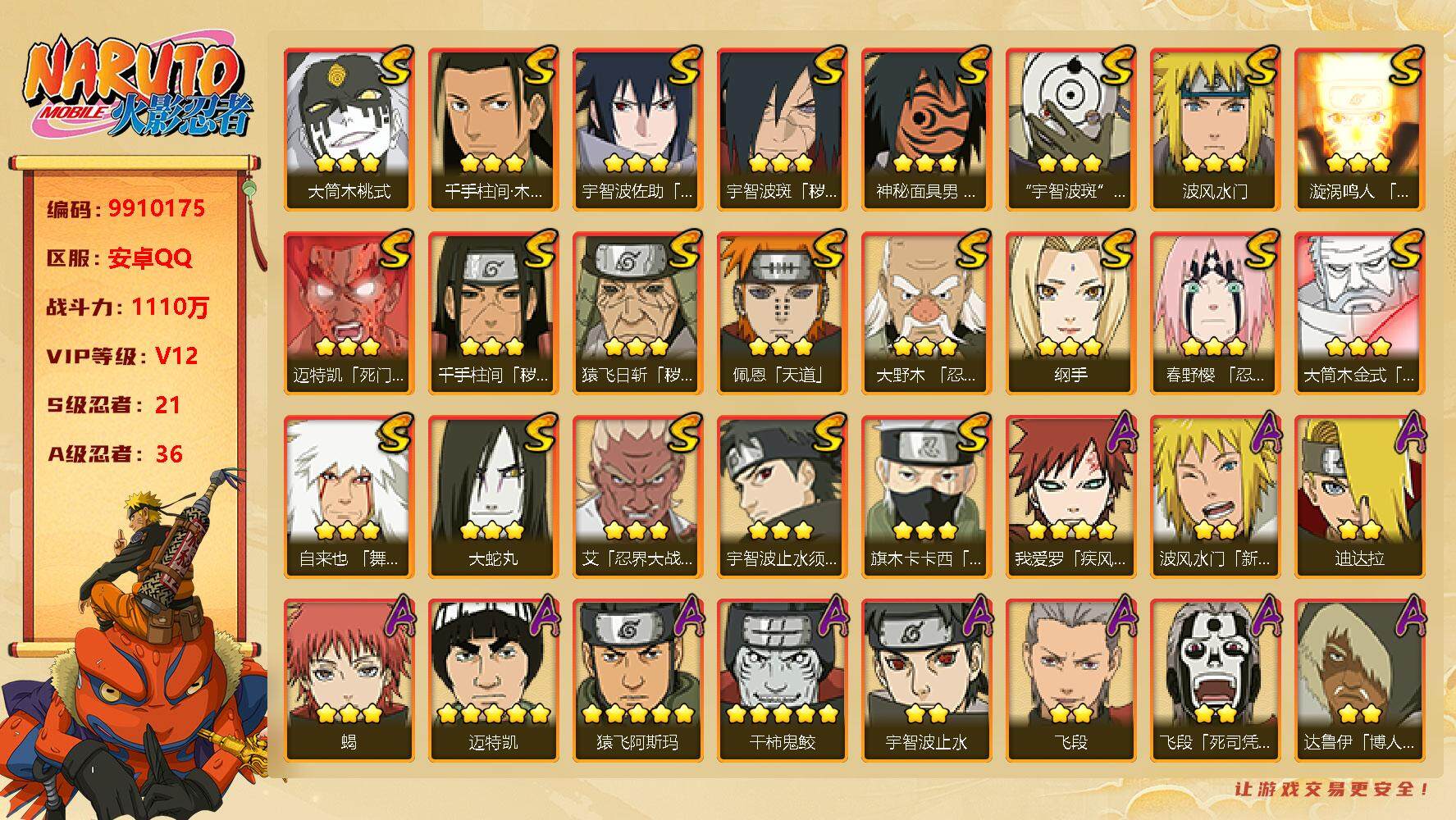 [12898754]【编号19411可秒换绑】【店长推荐精品号!】21s级忍者数-36a级忍者数 【s级忍者】:猿飞日斩「秽土转生」3星,千手柱间「秽土转生」3星,宇智波斑「秽土转生·解」3星,大野木「忍界大战」3星,春野樱「忍界大战」3星,艾「忍界大战」3星,宇智波止水「须佐能乎」3星,旗木卡卡西「须佐能乎」3星,千手柱间「木叶创立」3星,自来也「舞之豪杰」3星,大蛇丸3星,纲手3星,波风水门3星,神秘面具男「红夜之刃」3星,漩涡鸣人「九喇嘛连结」3星,迈特凯「死门」3星,佩恩「天道」3星,宇智波佐助「永恒万花筒」3星,宇智波斑 「白面具」3星宇智波斑「白面具」,大筒木金式3星,大筒木桃式3星 【a级忍者】:艾「青年」2星,长门「青年」2星,波风水门「青年」2星,波风水门「新春限定」2星,达鲁伊「博人传」2星,迪达拉2星,飞段2星,飞段「死司凭血」2星,干柿鬼鲛5星,漩涡博人「桃式显现」2星,迈特凯5星,迈特凯「忍界大战」2星,旗木卡卡西「忍界大战」2星,桃地再不斩「漂泊武士」2星,我爱罗「疾风传」4星,我爱罗「忍界大战」2星,蝎3星,小南「新春限定」2星,小南「漂泊浪客」2星,猿飞阿斯玛5星,宇智波止水2星,宇智波止水「新春限定」2星,宇智波鼬2星,宇智波鼬「新春限定」2星,宇智波鼬「夏日限定」2星,宇智波佐助「须佐能乎」2星,照美冥「夏日泳装」2星,照美冥「五代目水影」2星,日向宁次「忍界大战」2星,宇智波带土「暴怒」2星,长十郎「六代目水影」2星,纲手「侠隐江湖」2星,李洛克「忍界大战」2星,黑土「博人传」2星,秋道丁次「忍界大战」2星,千代「近松十人卫」2星