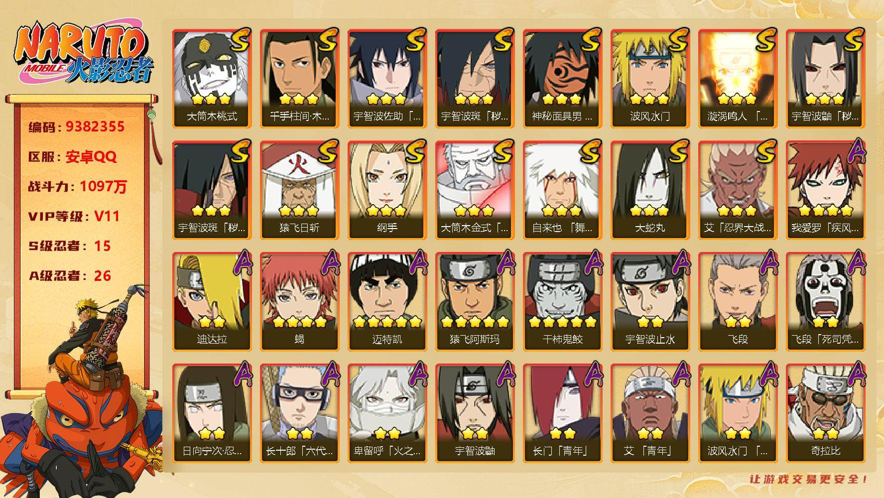 [12929591]【编号56226 可秒换绑】【店长推荐精品号!】15s级忍者数-26a级忍者数 【s级忍者】:宇智波鼬「秽土转生」3星,宇智波斑「秽土转生」3星,宇智波斑「秽土转生·解」3星,艾「忍界大战」3星,千手柱间「木叶创立」3星,自来也「舞之豪杰」3星,大蛇丸3星,纲手3星,猿飞日斩3星,波风水门3星,神秘面具男「红夜之刃」3星,漩涡鸣人「九喇嘛连结」3星,宇智波佐助「永恒万花筒」3星,大筒木金式3星,大筒木桃式3星 【a级忍者】:艾「青年」2星,长门「青年」2星,波风水门「青年」2星,迪达拉2星,奇拉比2星,奇拉比「忍界大战」2星,飞段2星,飞段「死司凭血」2星,干柿鬼鲛5星,漩涡博人「桃式显现」2星,迈特凯5星,我爱罗「疾风传」4星,蝎4星,猿飞阿斯玛5星,宇智波止水2星,宇智波鼬2星,宇智波鼬「新春限定」2星,宇智波佐助「须佐能乎」2星,日向宁次「忍界大战」2星,日向雏田「最终章」2星,长十郎「六代目水影」2星,卑留呼「火之意志继承者」2星,李洛克「忍界大战」2星,黑土「博人传」2星,秋道丁次「忍界大战」2星,千代「近松十人卫」2星