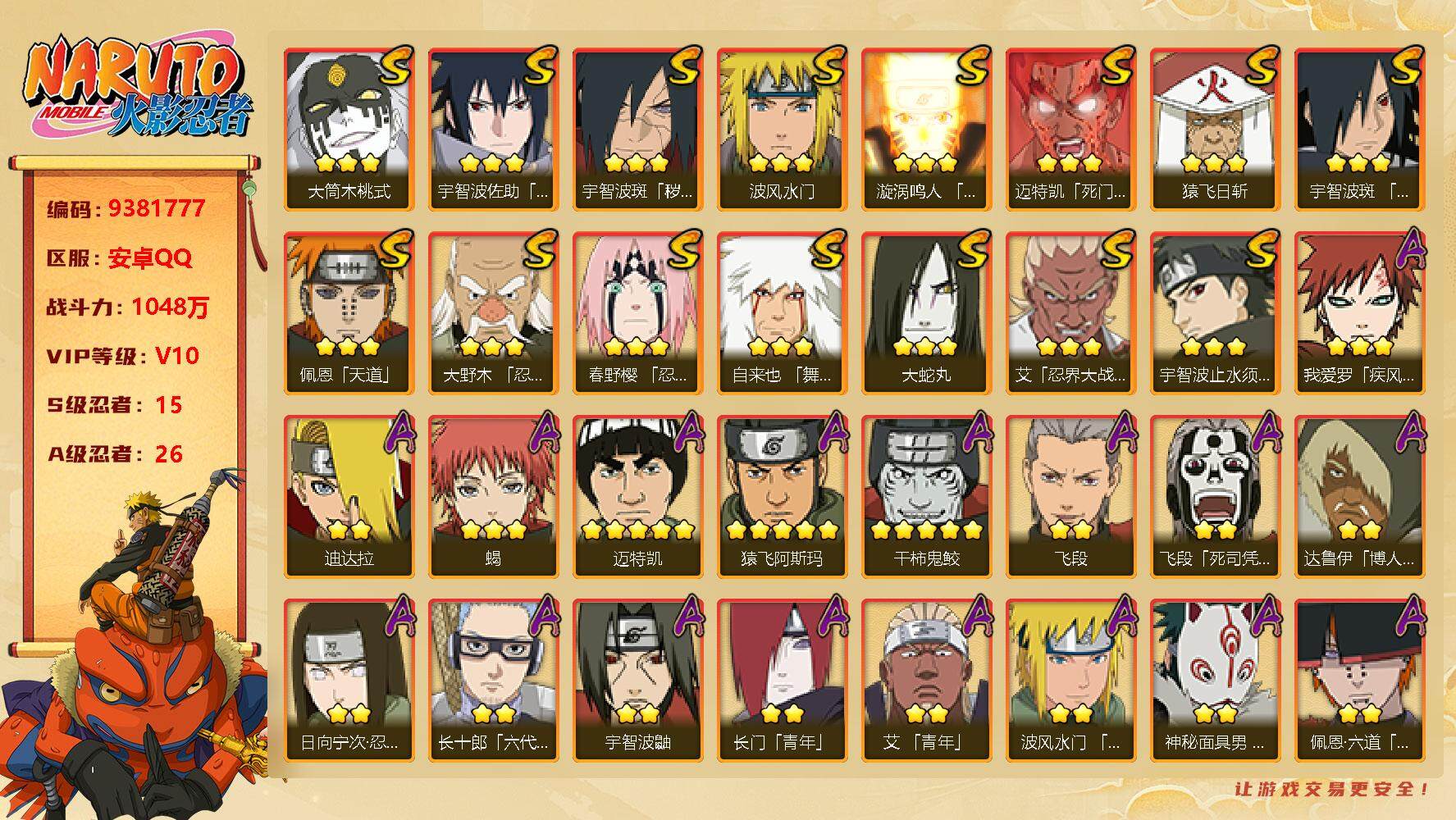 [12929620]【编号36758 可秒换绑】【店长推荐捡漏号!】15s级忍者数-26a级忍者数 【s级忍者】:宇智波斑「秽土转生·解」3星,大野木「忍界大战」3星,春野樱「忍界大战」3星,艾「忍界大战」3星,宇智波止水「须佐能乎」3星,宇智波斑「木叶创立」3星,自来也「舞之豪杰」3星,大蛇丸3星,猿飞日斩3星,波风水门3星,漩涡鸣人「九喇嘛连结」3星,迈特凯「死门」3星,佩恩「天道」3星,宇智波佐助「永恒万花筒」3星,大筒木桃式3星 【a级忍者】:艾「青年」2星,长门「青年」2星,波风水门「青年」2星,达鲁伊「博人传」2星,迪达拉2星,飞段2星,飞段「死司凭血」2星,干柿鬼鲛5星,漩涡博人「桃式显现」2星,漩涡鸣人「九尾查克拉」2星,迈特凯5星,旗木卡卡西「幻之真容」2星,我爱罗「疾风传」3星,蝎3星,猿飞阿斯玛5星,宇智波鼬2星,宇智波佐助「须佐能乎」2星,照美冥「五代目水影」2星,日向宁次「忍界大战」2星,日向雏田「最终章」2星,长十郎「六代目水影」2星,神秘面具男「忍者之路」2星,佩恩·六道「漂泊浪客」2星,李洛克「忍界大战」2星,秋道丁次「忍界大战」2星,千代「近松十人卫」2星