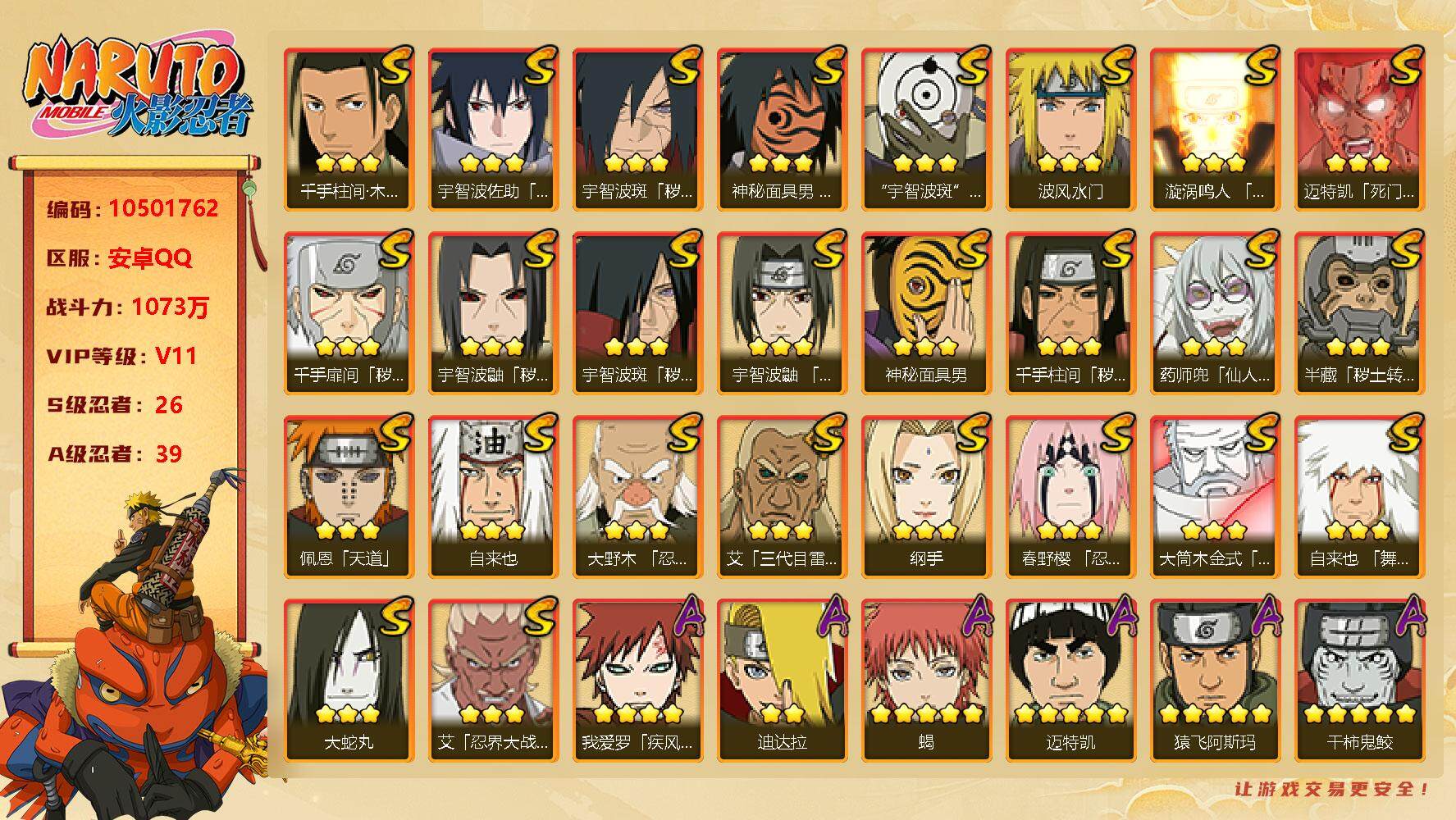 [12929738]【编号63786 可秒换绑】【店长推荐精品号!】26s级忍者数-39a级忍者数 【s级忍者】:半藏「秽土转生」3星,千手扉间「秽土转生」3星,千手柱间「秽土转生」3星,宇智波鼬「秽土转生」3星,宇智波斑「秽土转生」3星,宇智波斑「秽土转生·解」3星,大野木「忍界大战」3星,春野樱「忍界大战」3星,艾「忍界大战」3星,宇智波鼬「须佐能乎」3星,千手柱间「木叶创立」3星,艾「三代目雷影」3星,自来也3星,自来也「舞之豪杰」3星,大蛇丸3星,纲手3星,波风水门3星,药师兜「仙人模式」3星,神秘面具男3星,神秘面具男「红夜之刃」3星,漩涡鸣人「九喇嘛连结」3星,迈特凯「死门」3星,佩恩「天道」3星,宇智波佐助「永恒万花筒」3星,宇智波斑 「白面具」3星宇智波斑「白面具」,大筒木金式3星 【a级忍者】:艾「青年」2星,长门「青年」2星,波风水门「青年」2星,达鲁伊「博人传」2星,迪达拉2星,迪达拉「秽土转生」2星,奇拉比2星,奇拉比「忍界大战」2星,飞段4星,飞段「死司凭血」2星,干柿鬼鲛5星,漩涡博人「桃式显现」2星,漩涡鸣人「仙人模式」2星,漩涡鸣人「九尾查克拉」2星,迈特凯5星,我爱罗「疾风传」4星,我爱罗「忍界大战」2星,蝎5星,蝎「绯流琥」2星,小南2星,角都「秽土转生」2星,猿飞阿斯玛5星,宇智波止水2星,宇智波鼬2星,宇智波鼬「新春限定」2星,宇智波佐助「须佐能乎」2星,宇智波佐助「万花筒写轮眼」2星,照美冥「五代目水影」2星,日向宁次「忍界大战」2星,宇智波带土「暴怒」2星,长十郎「六代目水影」2星,佩恩·六道「漂泊浪客」2星,猿飞木叶丸「博人传」3星,黑土「博人传」2星,千手扉间「漂泊武士」2星,春野樱「百豪」2星,秋道丁次「忍界大战」2星,千代「近松十人卫」2星,宇智波泉奈2星