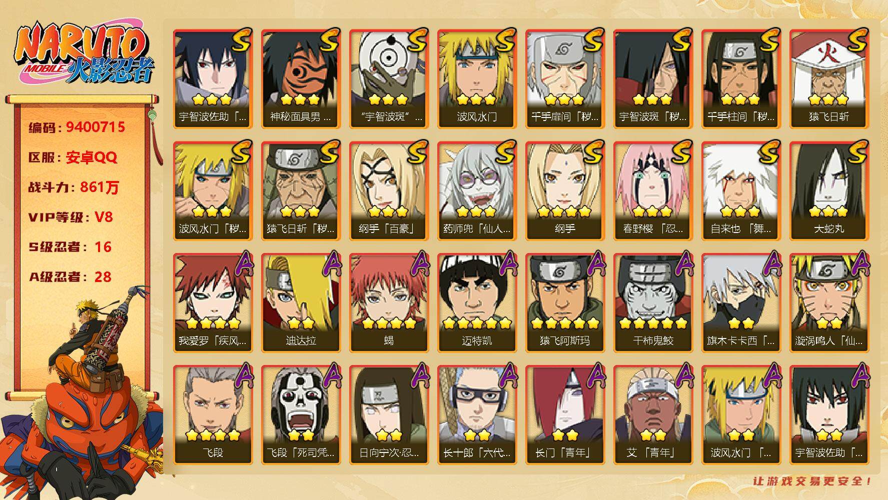 [12935946]【编号57720 可秒换绑】【店长推荐捡漏号!】16s级忍者数-28a级忍者数 【s级忍者】:猿飞日斩「秽土转生」3星,波风水门「秽土转生」3星,千手扉间「秽土转生」3星,千手柱间「秽土转生」3星,宇智波斑「秽土转生」3星,春野樱「忍界大战」3星,自来也「舞之豪杰」3星,大蛇丸3星,纲手4星,纲手「百豪」3星,猿飞日斩3星,波风水门3星,药师兜「仙人模式」3星,神秘面具男「红夜之刃」3星,宇智波佐助「永恒万花筒」3星,宇智波斑 「白面具」3星宇智波斑「白面具」 【a级忍者】:艾「青年」2星,长门「青年」2星,波风水门「青年」2星,迪达拉2星,迪达拉「秽土转生」2星,大蛇丸「晓」2星,奇拉比「忍界大战」2星,飞段4星,飞段「死司凭血」2星,干柿鬼鲛5星,漩涡鸣人「仙人模式」2星,漩涡鸣人「九尾查克拉」2星,迈特凯5星,旗木卡卡西「万花筒写轮眼」2星,我爱罗「疾风传」4星,我爱罗「忍界大战」2星,蝎4星,猿飞阿斯玛5星,猿飞日斩「火影继承人」2星,宇智波佐助「须佐能乎」2星,宇智波佐助「万花筒写轮眼」2星,药师兜「半蛇斗篷」2星,日向宁次「忍界大战」2星,长十郎「六代目水影」2星,猿飞木叶丸「博人传」2星,秋道丁次「忍界大战」2星,千代「近松十人卫」2星,地陆2星