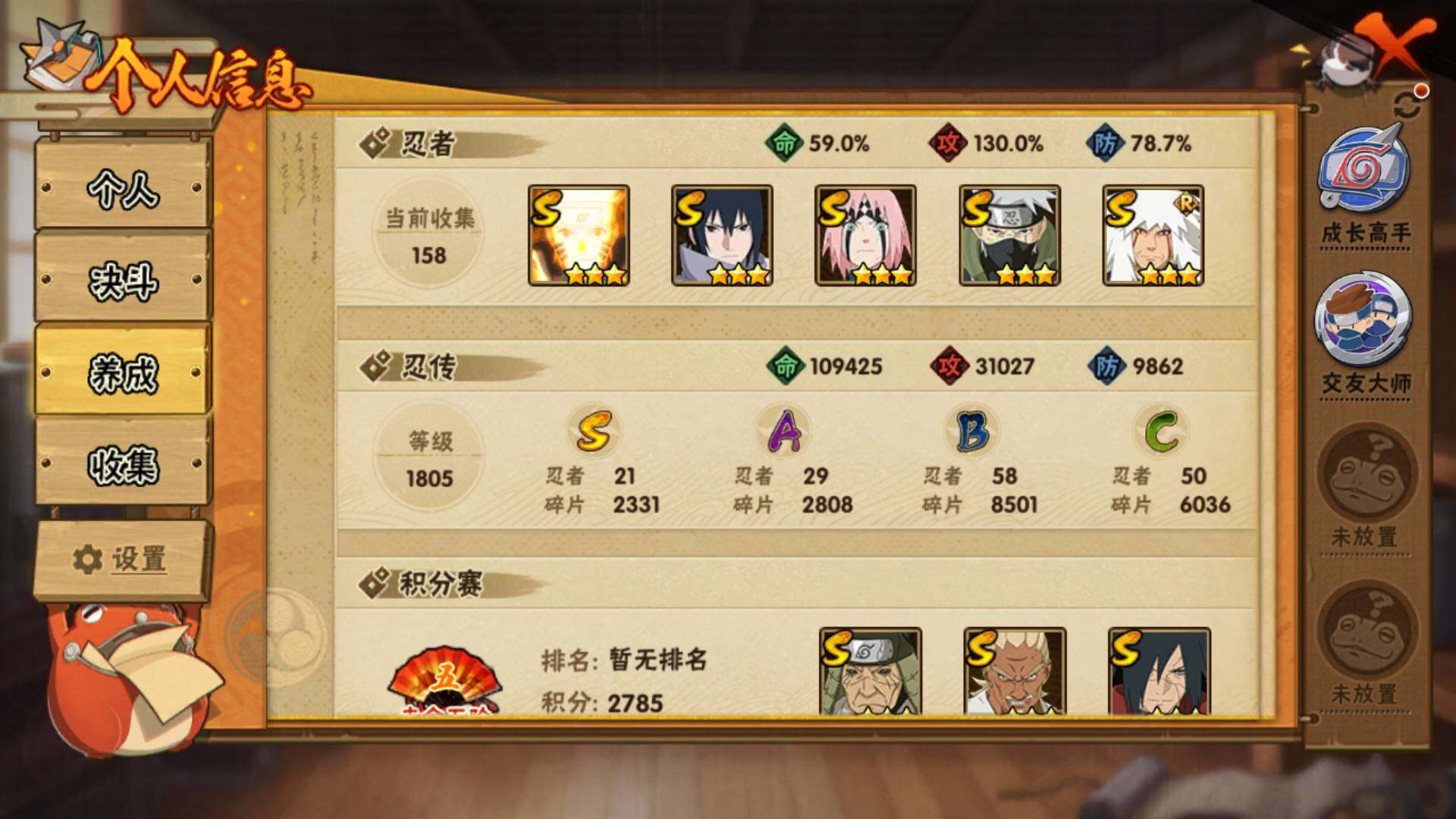 v10/836万战力/总忍者159/21s/29a/最终章舍人/红夜带土/须佐止水/创立柱间/大筒木桃式/九喇嘛水门/须佐卡卡西/传说自来也/白面具/忍战艾/秽土水门/秽土解斑/秽土长门/秽土日斩/九喇嘛鸣人/永恒佐助/忍战樱/漂泊小南/秽土再不斩/秽土角都/15通灵/45密卷/1.9千金币