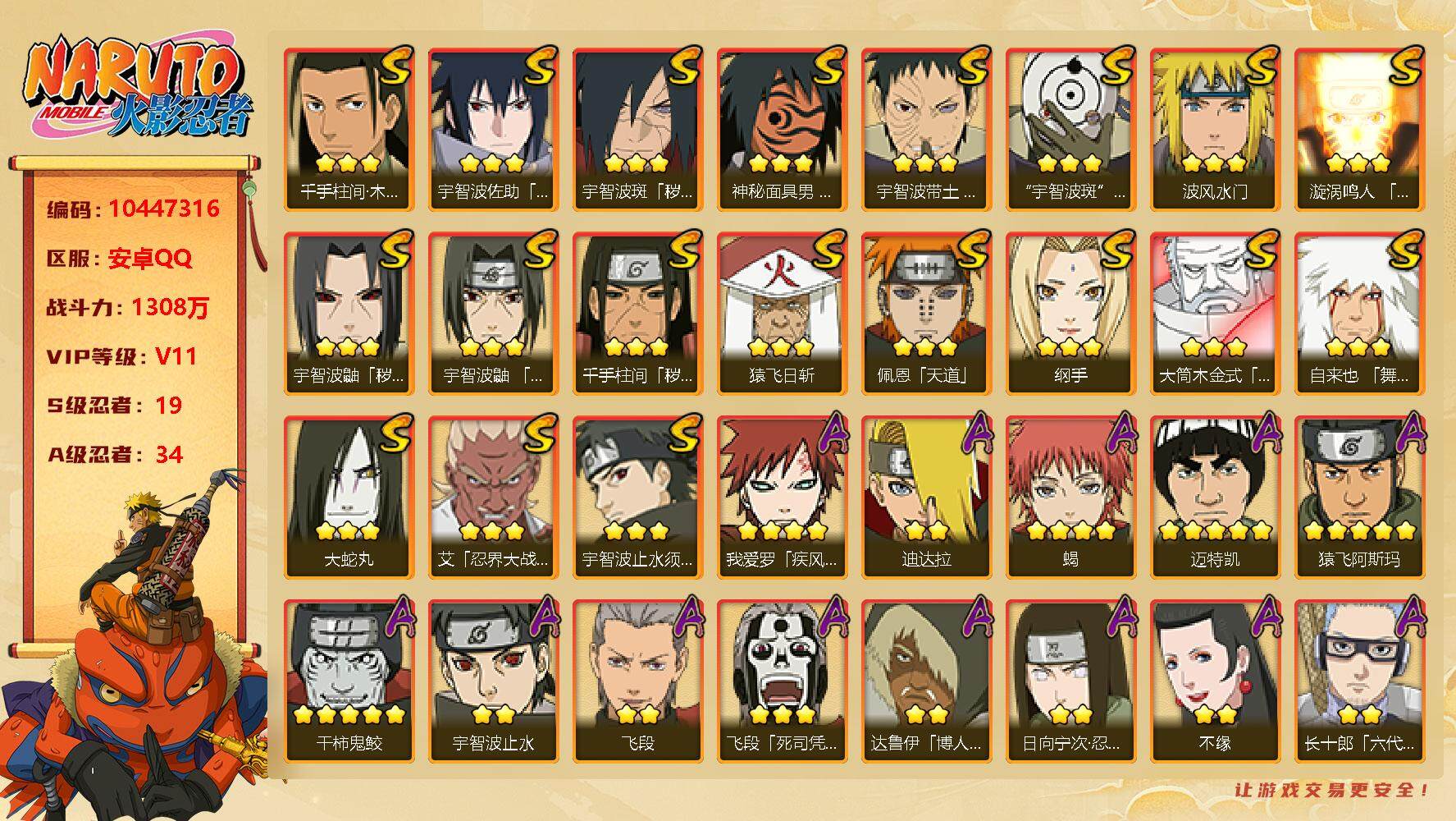 [13236149]【编号27856】【店长推荐捡漏号】19s级忍者数-34a级忍者数 【s级忍者】:千手柱间「秽土转生」3星,宇智波鼬「秽土转生」3星,宇智波斑「秽土转生·解」3星,宇智波带土「忍界大战」3星,艾「忍界大战」3星,宇智波鼬「须佐能乎」3星,宇智波止水「须佐能乎」3星,千手柱间「木叶创立」3星,自来也「舞之豪杰」3星,大蛇丸3星,纲手3星,猿飞日斩3星,波风水门3星,神秘面具男「红夜之刃」3星,漩涡鸣人「九喇嘛连结」3星,佩恩「天道」3星,宇智波佐助「永恒万花筒」3星,宇智波斑 「白面具」3星宇智波斑「白面具」,大筒木金式3星 【a级忍者】:艾「青年」2星,长门「青年」2星,波风水门「青年」2星,达鲁伊「博人传」2星,迪达拉2星,迪达拉「秽土转生」2星,大蛇丸「晓」2星,奇拉比2星,奇拉比「忍界大战」2星,飞段2星,飞段「死司凭血」3星,干柿鬼鲛5星,漩涡博人「桃式显现」2星,漩涡鸣人「九尾查克拉」2星,迈特凯5星,旗木卡卡西「幻之真容」2星,我爱罗「疾风传」4星,蝎4星,小南「漂泊浪客」2星,猿飞阿斯玛5星,宇智波止水2星,宇智波鼬2星,宇智波佐助「须佐能乎」2星,照美冥「五代目水影」2星,日向宁次「忍界大战」2星,长十郎「六代目水影」2星,纲手「侠隐江湖」2星,神秘面具男「忍者之路」2星,李洛克「忍界大战」2星,黑土「博人传」2星,秋道丁次「忍界大战」2星,千代「近松十人卫」2星,不缘2星,地陆2星