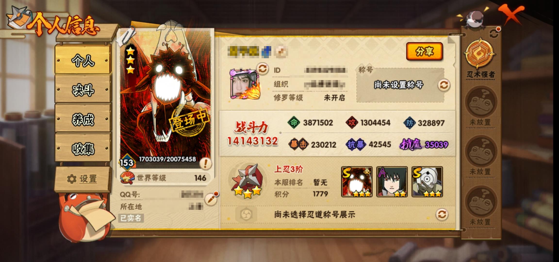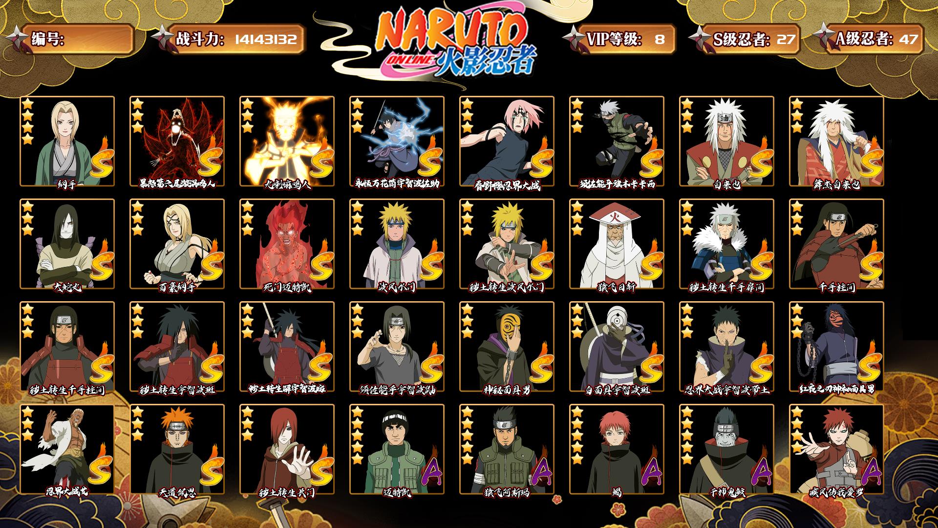 [13035085]0ajwzj 号 vip8,1414w战力,s忍27个,a忍47个,本服排名265,战区排名未上榜,通灵兽21个,6时装,上忍3阶,忍者星数556