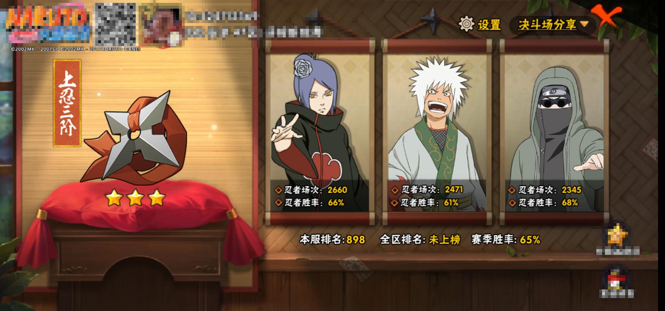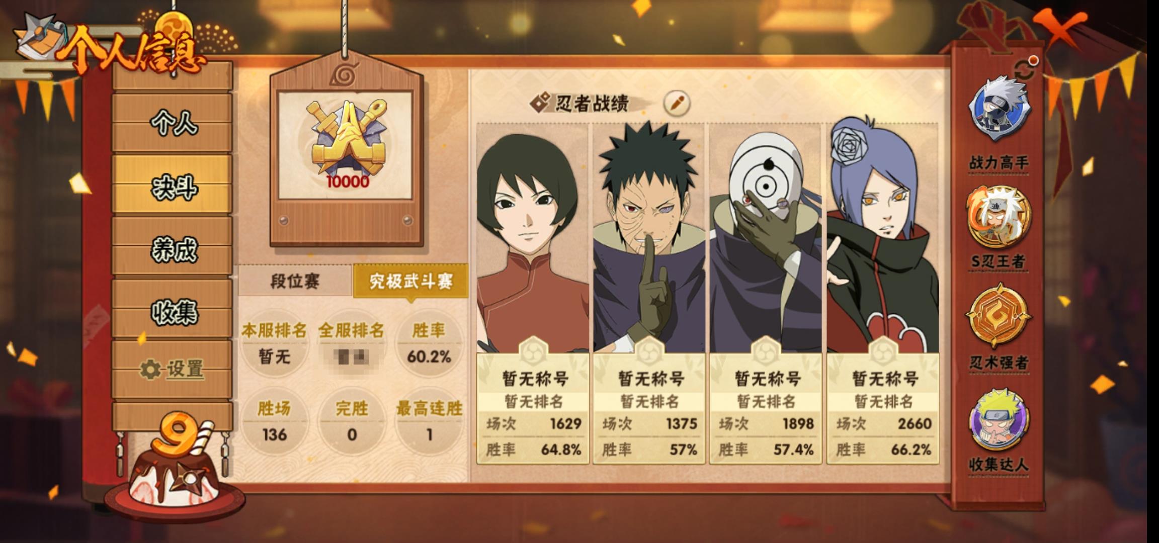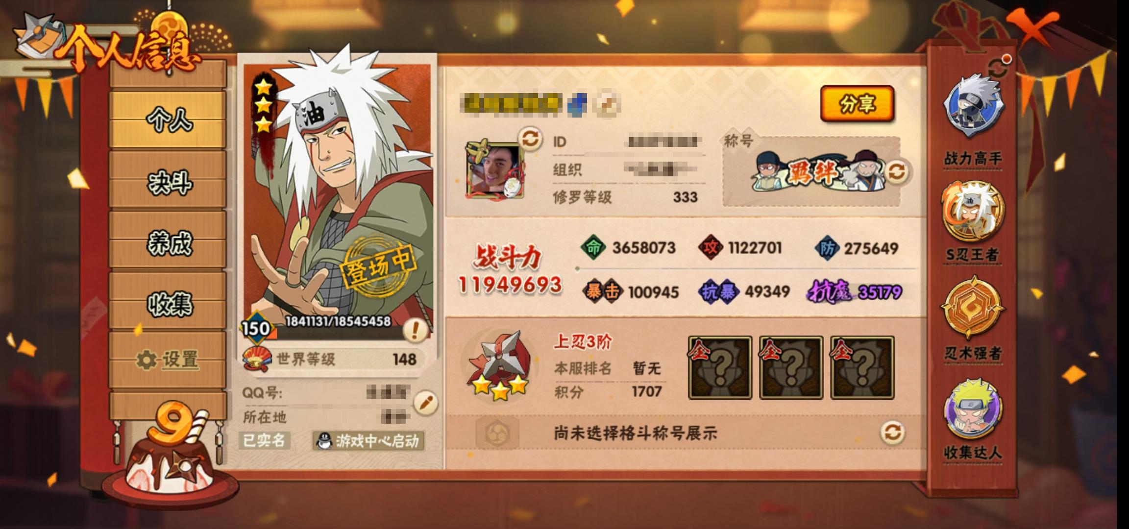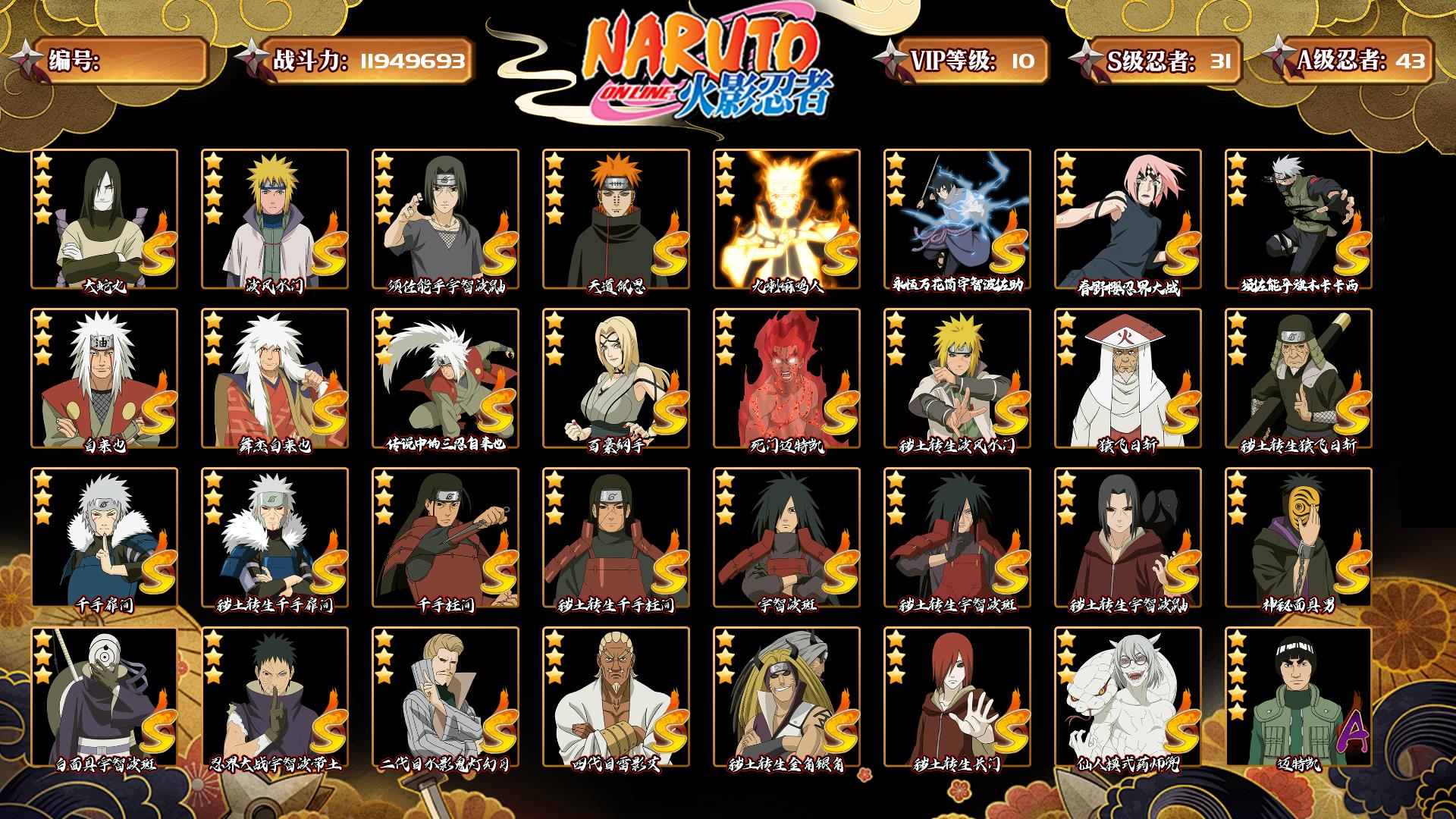 [12652803]vip10,战力:11949693,s忍者数量:31,a忍者数量:43,本服排名:574,战区排名:未上榜,通灵兽数量:20,时装数:5,段位:上忍3阶,忍者星数:664