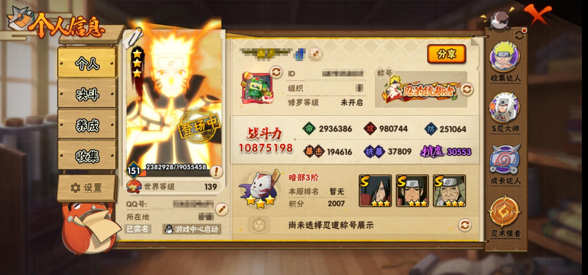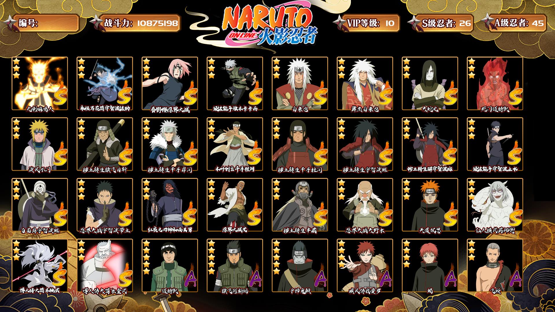 [12652818]vip10,战力:10875198,s忍者数量:26,a忍者数量:45,本服排名:202,战区排名:未上榜,通灵兽数量:18,时装数:4,段位:暗部3阶,忍者星数:525