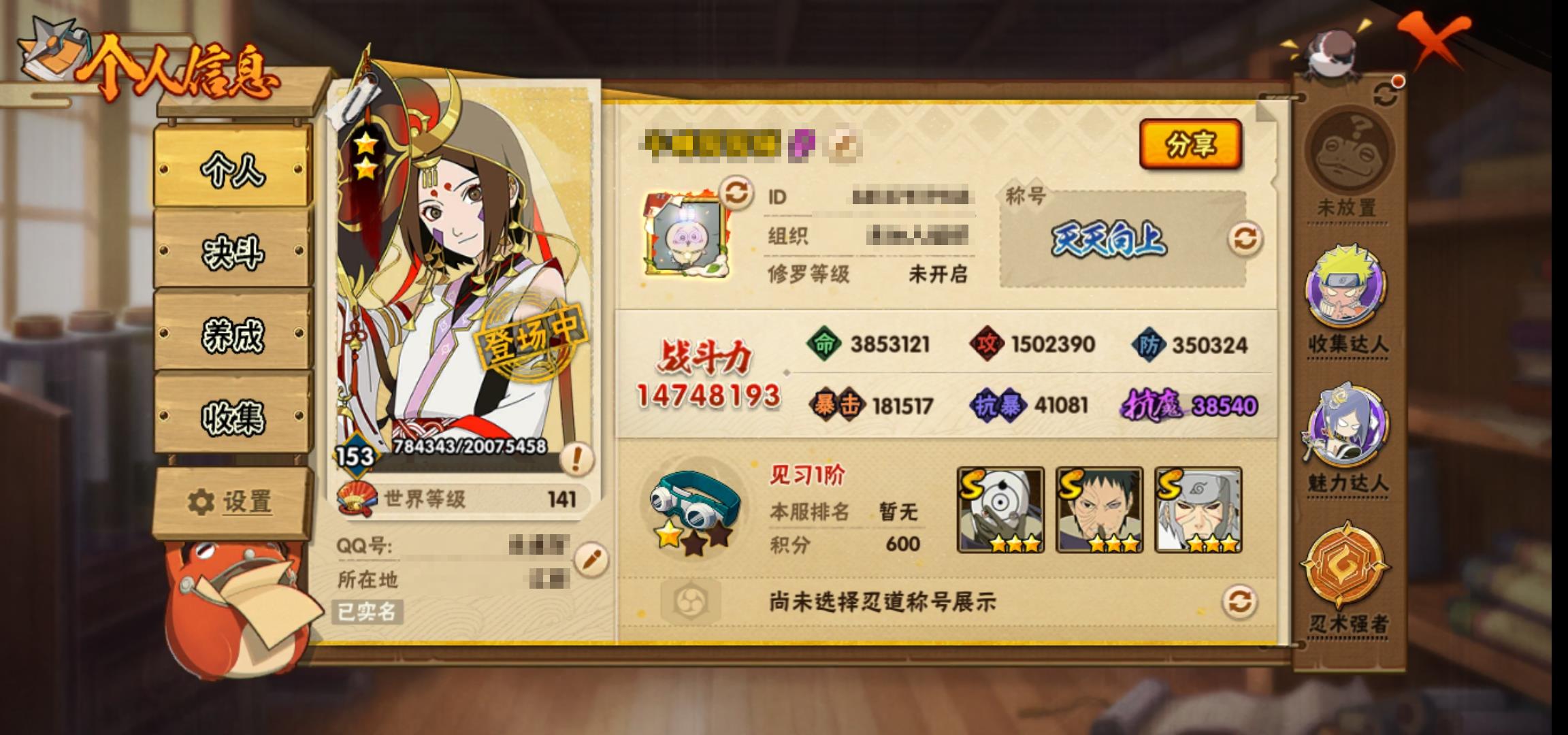 [12653342]x9251战斗力:1483w;段位:暗部2阶;本服排名:106;战区排名:未上榜;vip11级;s忍29个;a忍36个;通灵兽19个;s忍:仙人模式药师兜秽土转生宇智波斑千手柱间(普通)4星波风水门(普通)忍界大战宇智波带土秽土转生解宇智波斑永恒万花筒宇智波佐助4星大蛇丸(普通)须佐能乎旗木卡卡西4星纲手(普通)忍界大战春野樱木叶创立千手柱间天道佩恩四代目雷影艾秽土转生半藏舞之豪杰自来也千手扉间(普通)自来也(普通)神秘面具男(普通)九喇嘛连结漩涡鸣人二代目土影无百豪纲手红夜之刃神秘面具男须佐能乎宇智波鼬猿飞日斩(普通)三代目土影大野木白面具宇智波斑秽土转生波风水门秽土转生千手扉间;a忍:5星迈特凯(普通)5星猿飞阿斯玛(普通)5星蝎(普通)5星干柿鬼鲛(普通)4星疾风传我爱罗3星飞段(普通)3星死司凭血飞段仙人模式漩涡鸣人九尾查克拉漩涡鸣人万花筒写轮眼宇智波佐助须佐能乎宇智波佐助宇智波泉奈忍界大战秋道丁次忍界大战日向宁次忍界大战李洛克最终章日向雏田幻之真容旗木卡卡西青年波风水门忍界大战我爱罗近松十人卫千代五代目水影照美冥奇拉比(普通)半蛇斗篷药师兜青年长门漂泊浪客小南地怨虞角都秽土转生角都晓大蛇丸绯流琥蝎宇智波鼬(普通)迪达拉(普通)秽土转生迪达拉木叶上忍猿飞木叶丸六代目水影长十郎桃式显现漩涡博人四代目土影黑土;通灵兽:忍犬(普通)蓝蛇蛤蟆吉忍龟镰鼬猿魔山椒鱼蜃鲛鲨蛤蟆仙人蛤蟆健乌鸦(普通)蛞蝓(普通)蛤蟆龙蛤蟆广砂之守鹤梦貘鹰蜘蛛;时装:狂野鲛鲨干柿鬼鲛百战大蛇丸百战波风水门;详情看图【1375区】【安卓qq】【可二次实名】 vip11,战力:14748193,s忍者数量:29,a忍者数量:36,本服排名:124,战区排名:未上榜,通灵兽数量:19,时装数:5,段位:见习1阶,忍者星数:581