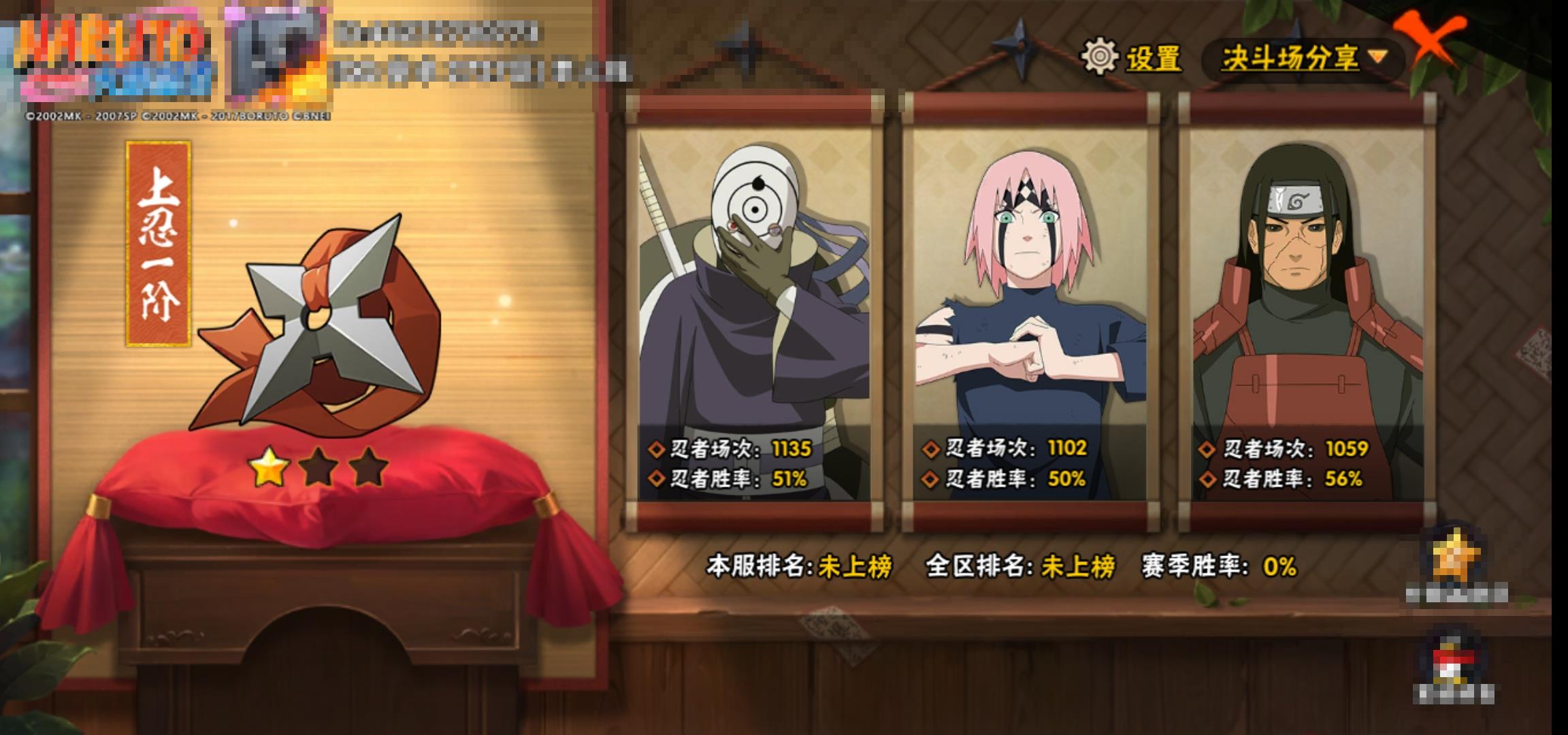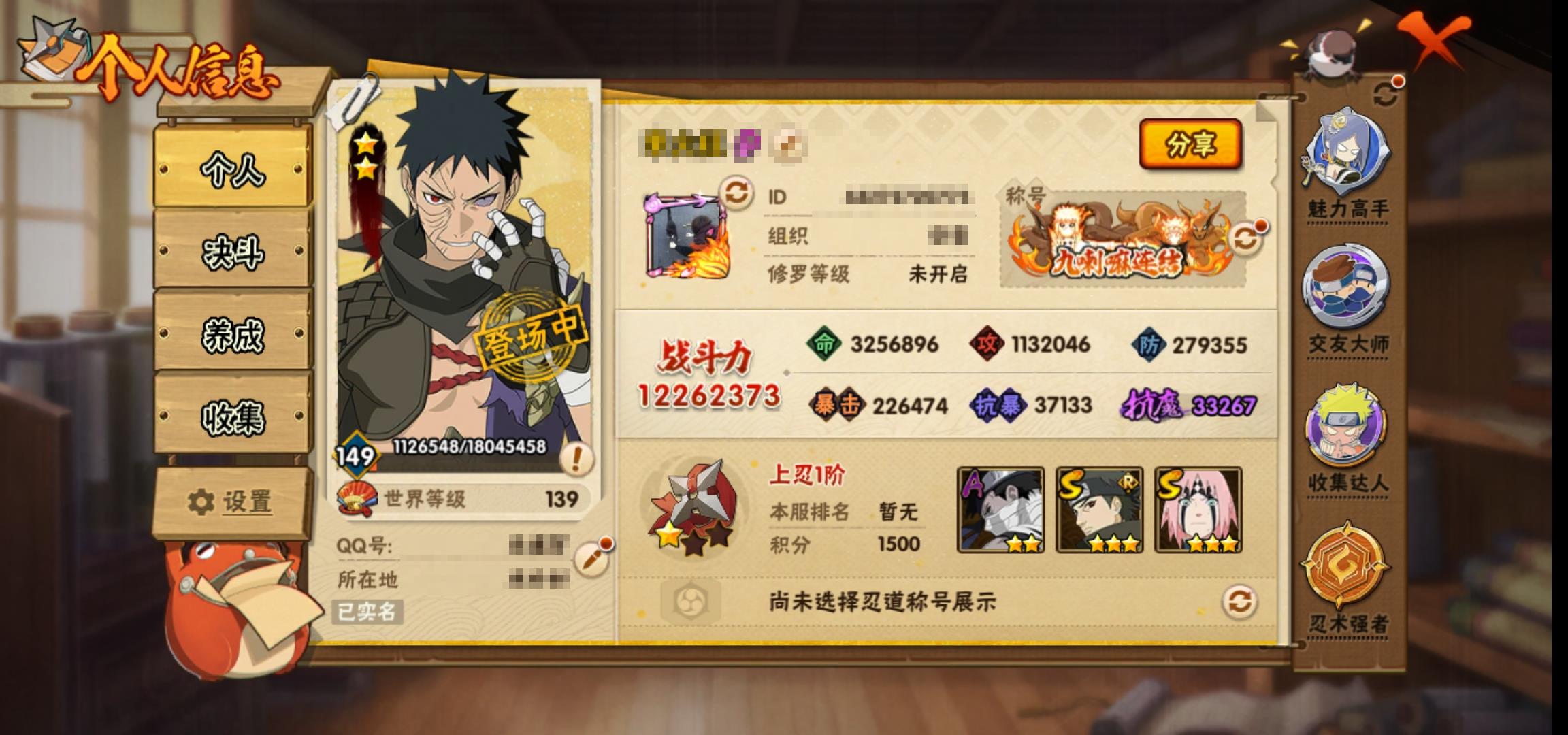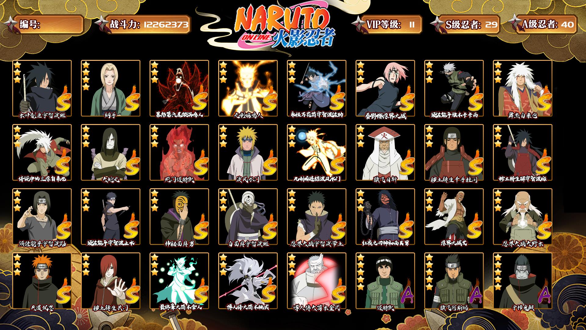 [13256702]0akpfb 号 vip11,1226w战力,s忍29个,a忍40个,本服排名171,战区排名未上榜,通灵兽22个,6时装,上忍1阶,忍者星数516