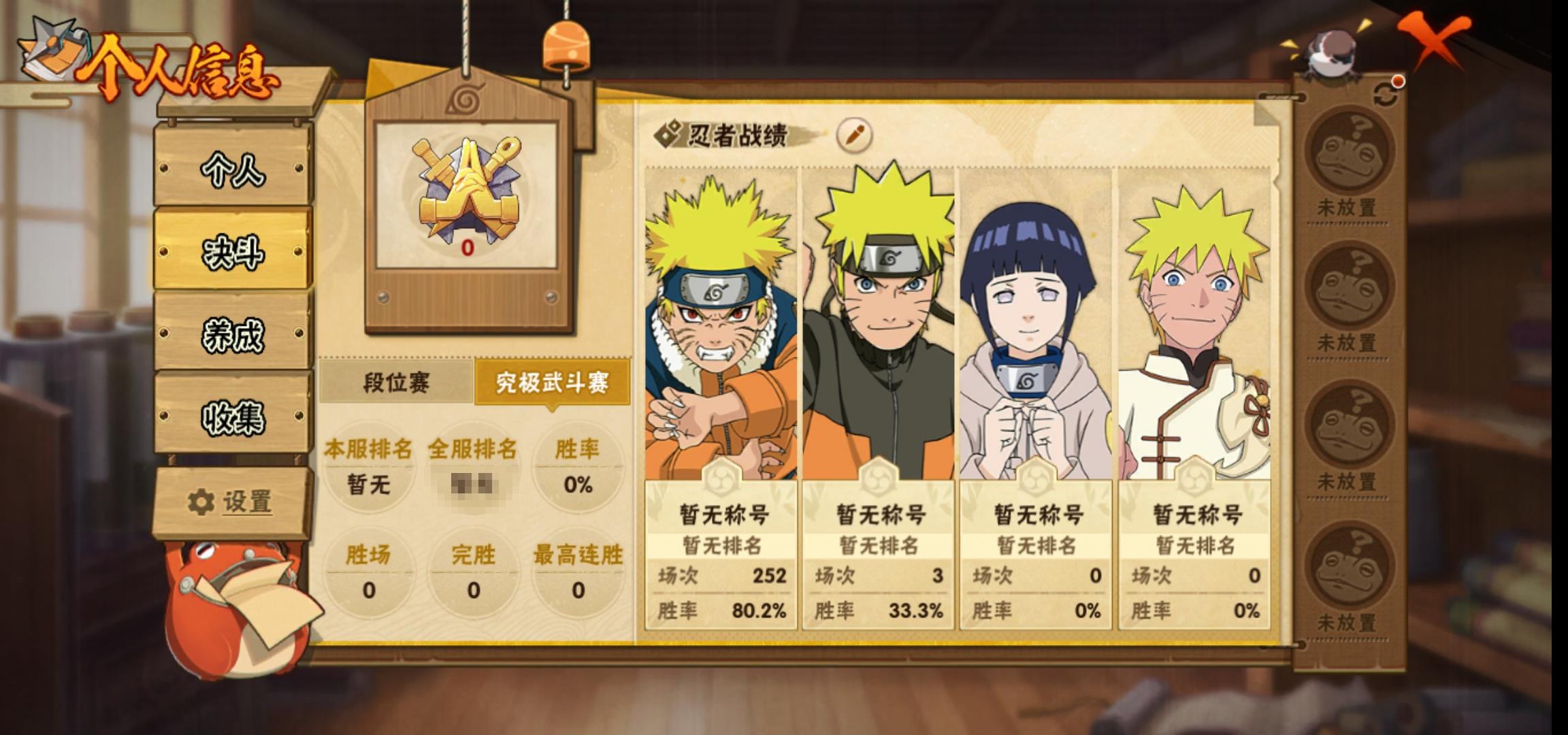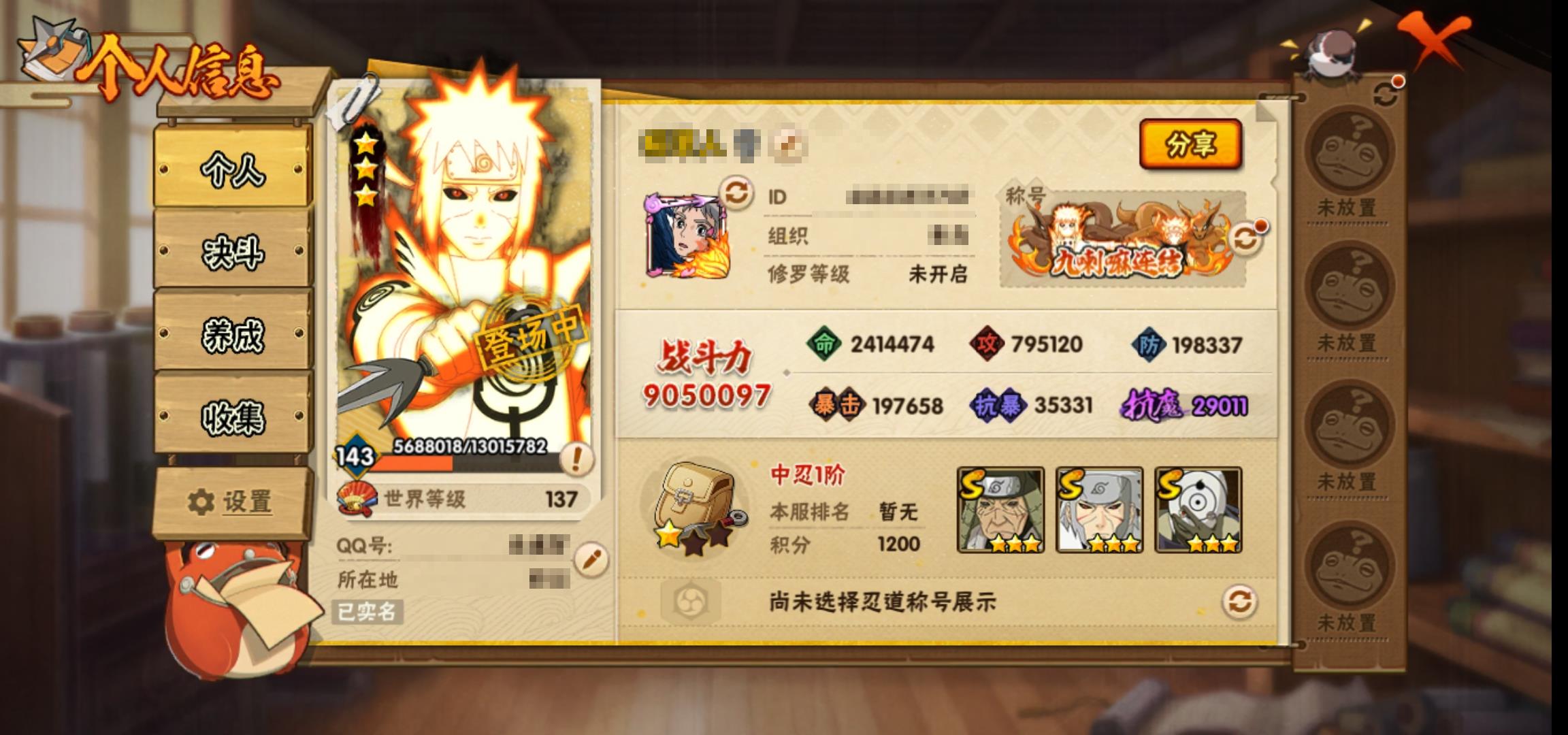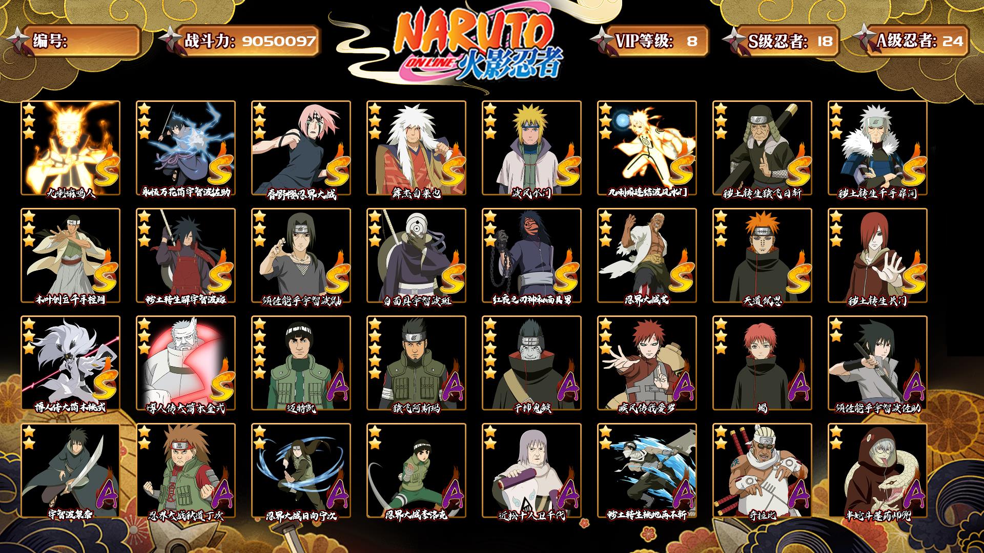[13290007]0aku1q 号 vip8,905w战力,s忍18个,a忍24个,本服排名510,战区排名未上榜,通灵兽16个,5时装,中忍1阶,忍者星数378