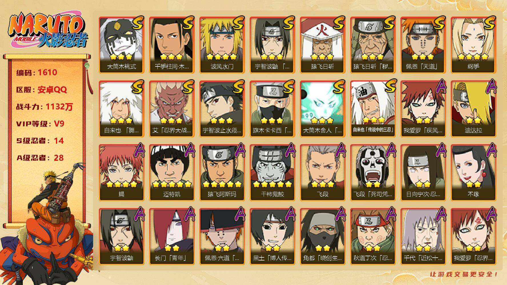 [13320776]v9 1132万战力 14s级忍者数-28a级忍者数 仙人自来也73片 九喇嘛水门50片 大蛇丸50片 秽土解斑80片 三代目风影52片 ll5205 【s级忍者】:猿飞日斩「秽土转生」3星,艾「忍界大战」3星,宇智波鼬「须佐能乎」3星,宇智波止水「须佐能乎」3星,旗木卡卡西「须佐能乎」3星,千手柱间「木叶创立」3星,自来也「舞之豪杰」3星,自来也「传说中的三忍」3星,纲手4星,猿飞日斩3星,波风水门4星,佩恩「天道」3星,大筒木桃式3星,大筒木舍人「最终章」3星 【a级忍者】:长门「青年」2星,迪达拉2星,飞段3星,飞段「死司凭血」2星,干柿鬼鲛5星,漩涡博人「桃式显现」2星,迈特凯5星,旗木卡卡西「幻之真容」2星,桃地再不斩「秽土转生」2星,我爱罗「疾风传」2星,我爱罗「忍界大战」2星,蝎4星,蝎「绯流琥」2星,角都「晓创生」2星,角都「秽土转生」2星,猿飞阿斯玛5星,宇智波鼬2星,日向宁次「忍界大战」2星,日向雏田「最终章」2星,佩恩·六道「漂泊浪客」2星,李洛克「忍界大战」2星,黑土「博人传」2星,秋道丁次「忍界大战」2星,千代「近松十人卫」2星,神农「羁绊」2星,不缘2星,宇智波泉奈2星,不动2星