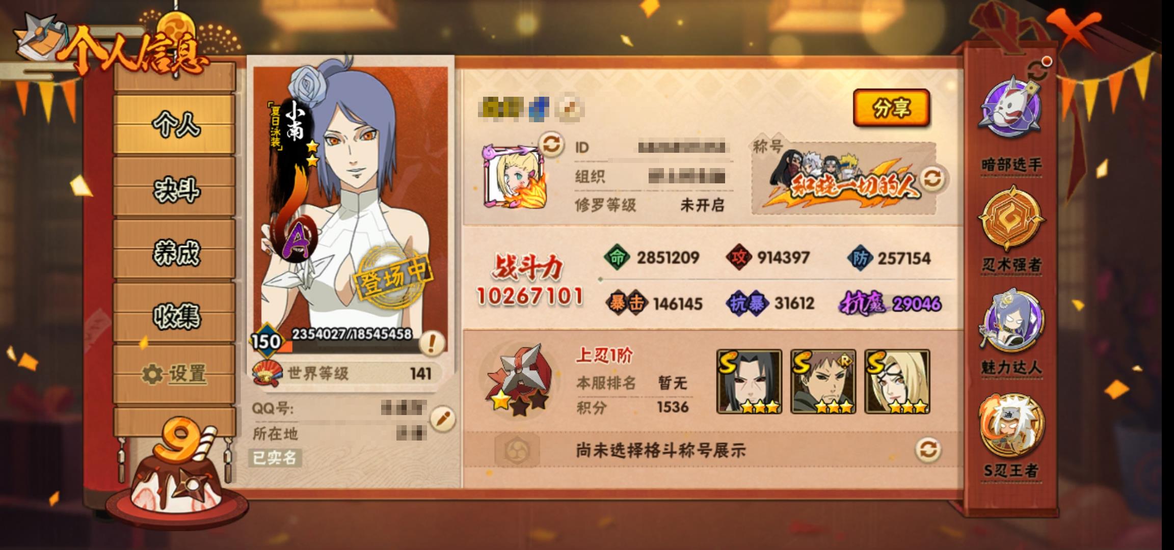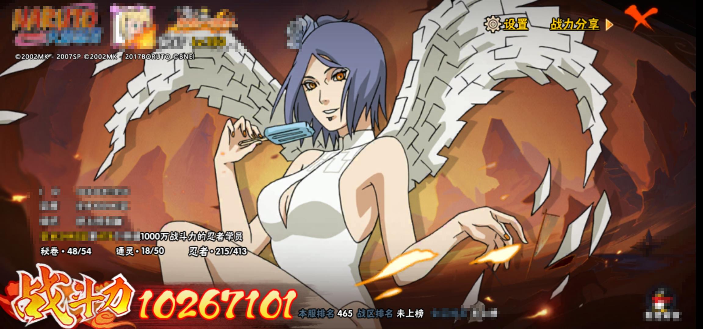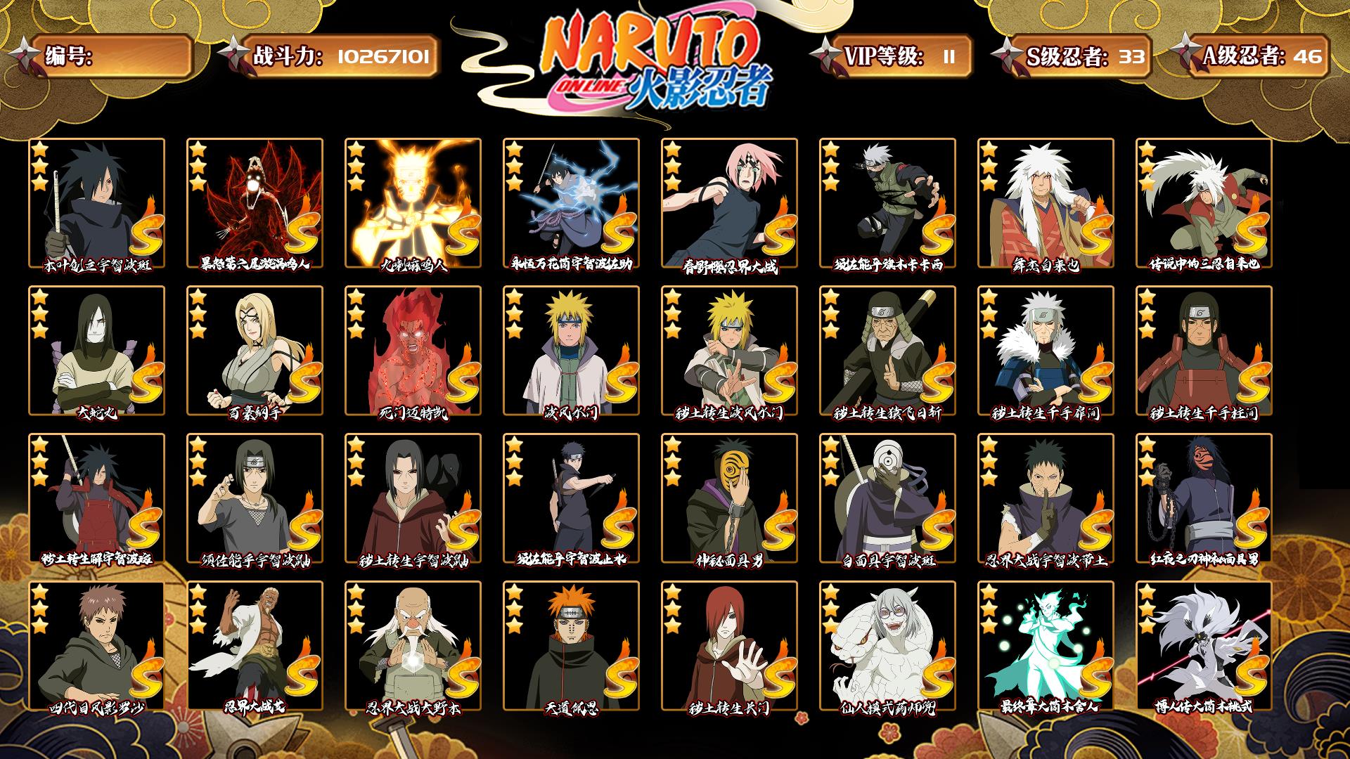 [13363784]0al3di 号 vip11,1026w战力,s忍33个,a忍46个,本服排名465,战区排名未上榜,通灵兽18个,6时装,上忍1阶,忍者星数548