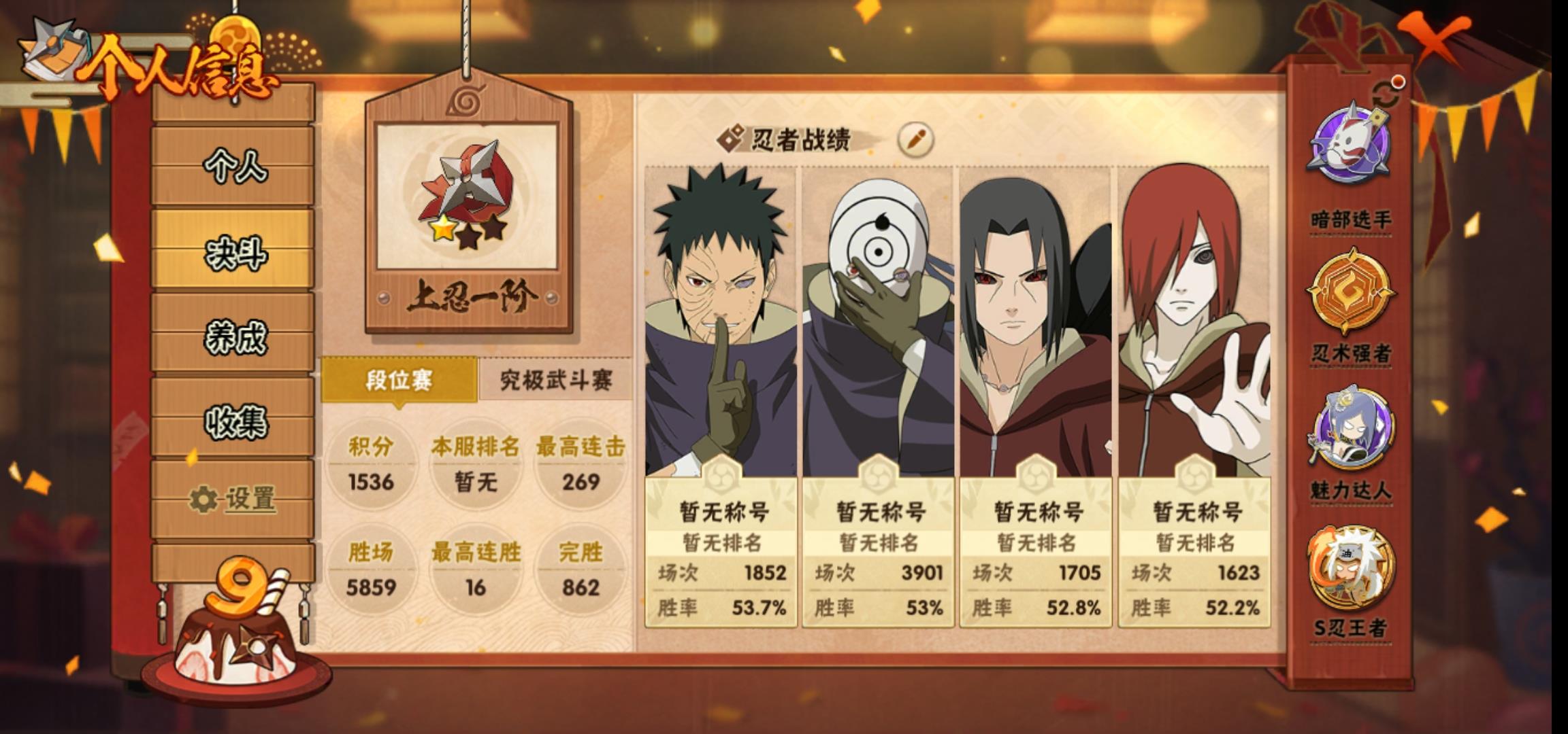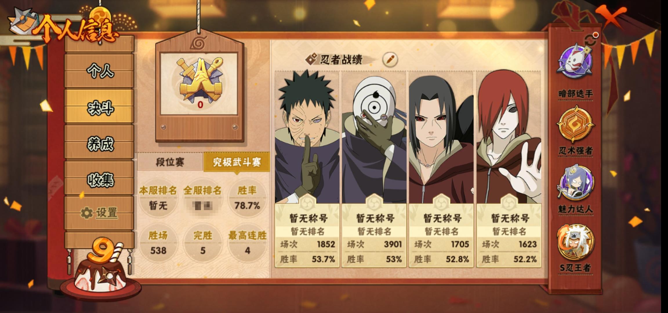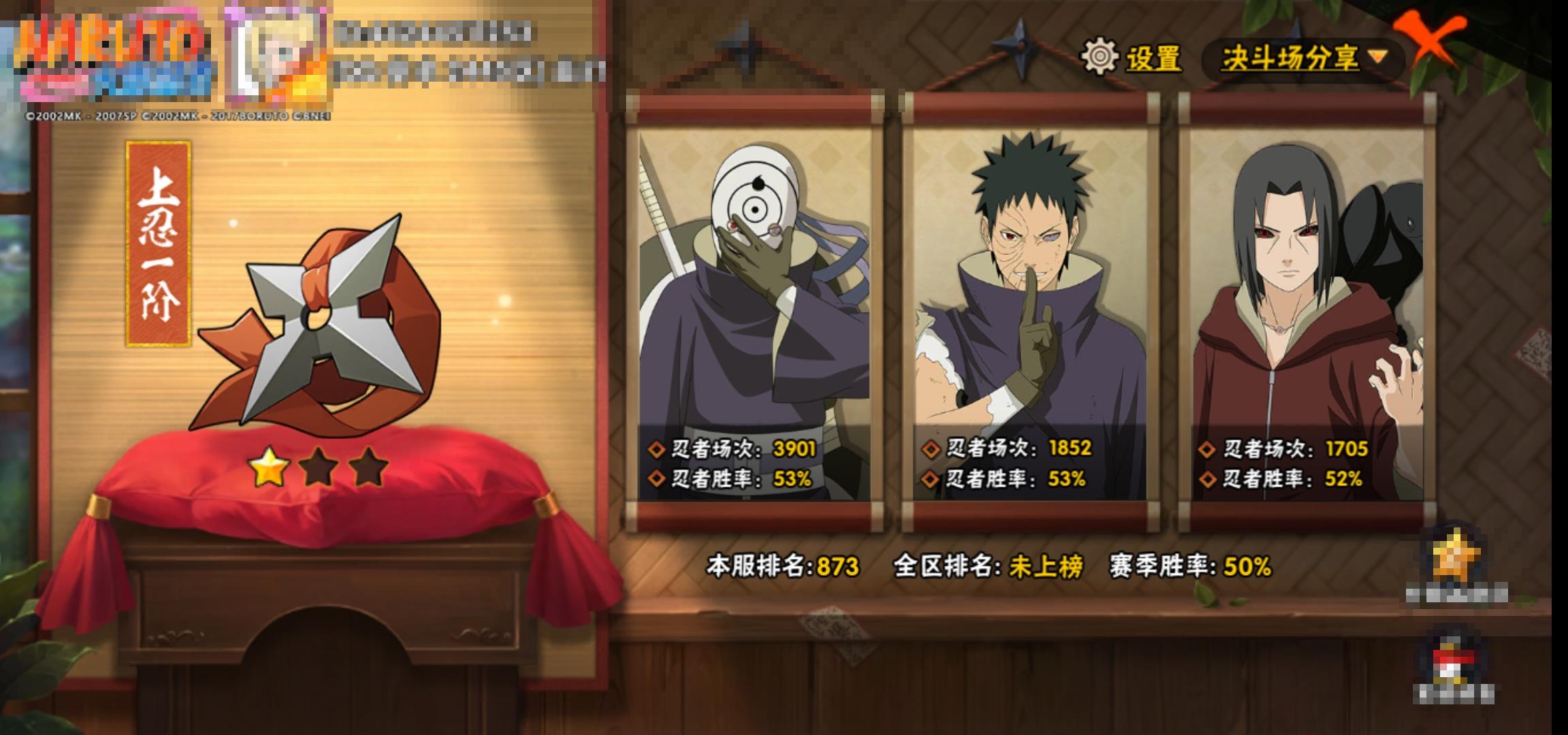[13363784]0al3di 号 vip11,1026w战力,s忍33个,a忍46个,本服排名465,战区排名未上榜,通灵兽18个,6时装,上忍1阶,忍者星数548