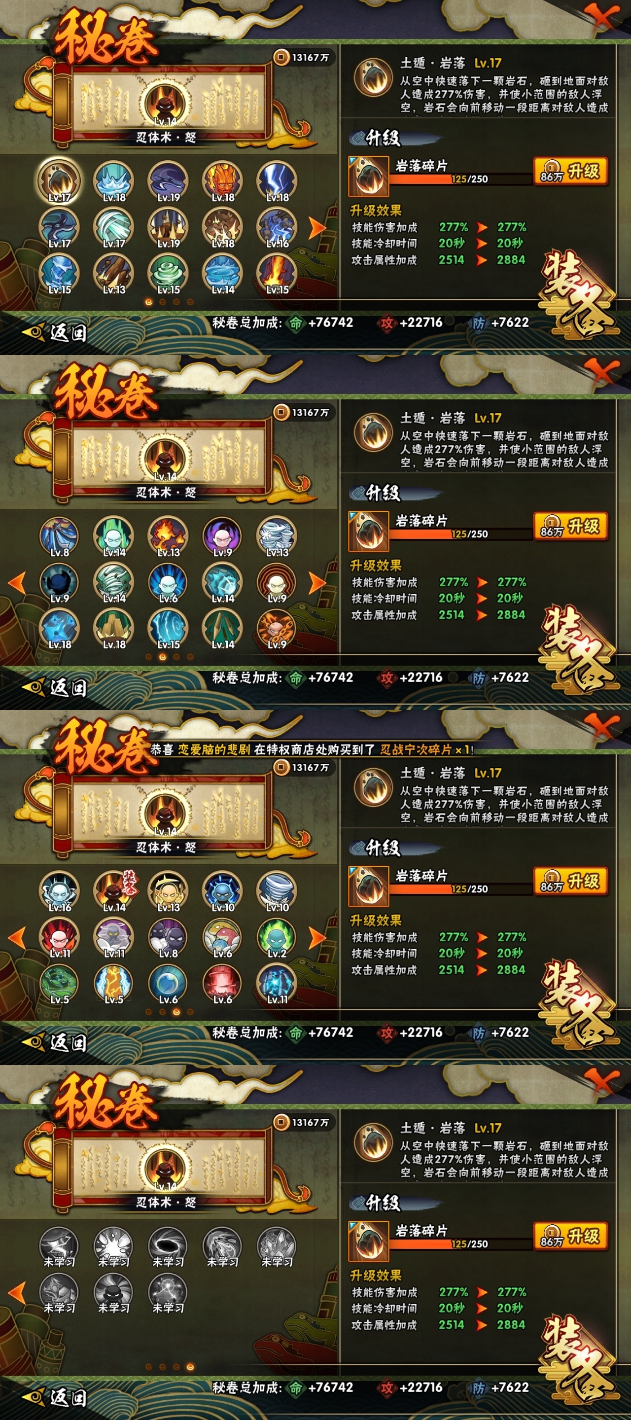 [13386366]s忍数 19 a忍数 45 时装数 13 战力值万 7596853 s级忍者19 宇智波鼬「秽土转生」宇智波斑 「木叶创立」佩恩「天道」大蛇丸波风水门宇智波鼬 「须佐能乎」迈特凯「死门」自来也 「舞之豪杰」宇智波斑「白面具」漩涡鸣人 「九喇嘛连结」春野樱 「忍界大战」神秘面具男 「红夜之刃」宇智波佐助「永恒万花筒」大筒木桃式艾「忍界大战」宇智波止水「须佐能乎」旗木卡卡西「须佐能乎」自来也 「传说中的三忍」漩涡鸣人 「暴怒·第六尾」 三星s19 宇智波鼬「秽土转生」宇智波斑 「木叶创立」佩恩「天道」大蛇丸波风水门宇智波鼬 「须佐能乎」迈特凯「死门」自来也「舞之豪杰」宇智波斑「白面具」漩涡鸣人 「九喇嘛连结」春野樱 「忍界大战」神秘面具男 「红夜之刃」宇智波佐助「永恒万花筒」大筒木桃式艾「忍界大战」宇智波止水「须佐能乎」旗木卡卡西「须佐能乎」自来也 「传说中的三忍」漩涡鸣人 「暴怒·第六尾」 五星a3 干柿鬼鲛猿飞阿斯玛迈特凯 三星a1 我爱罗「疾风传」 二星a41 旗木卡卡西「元气夏日」