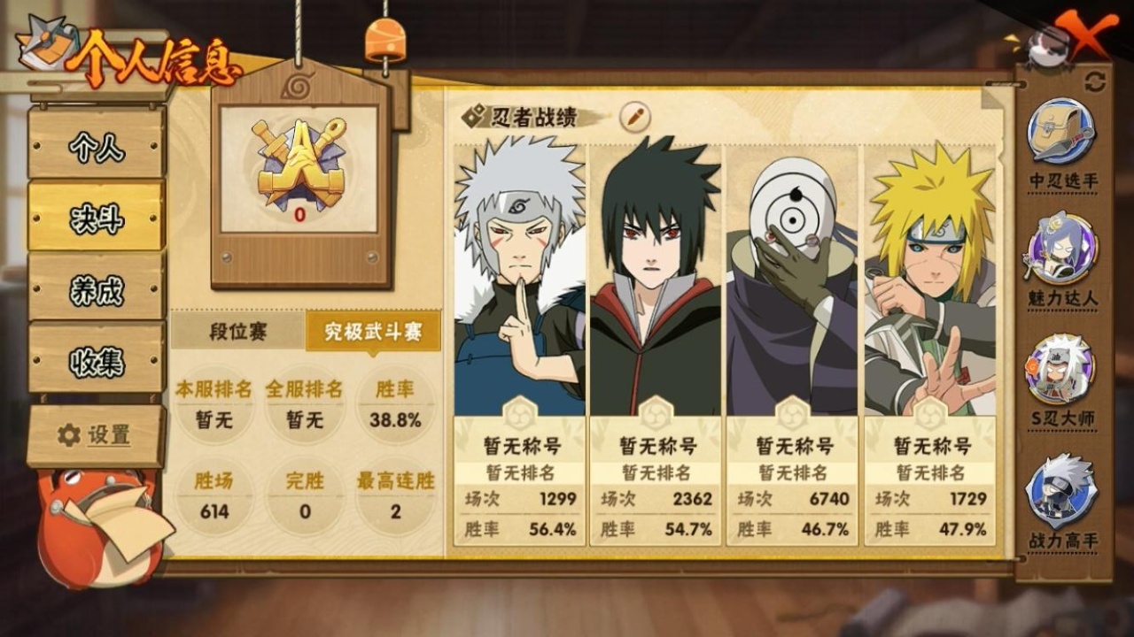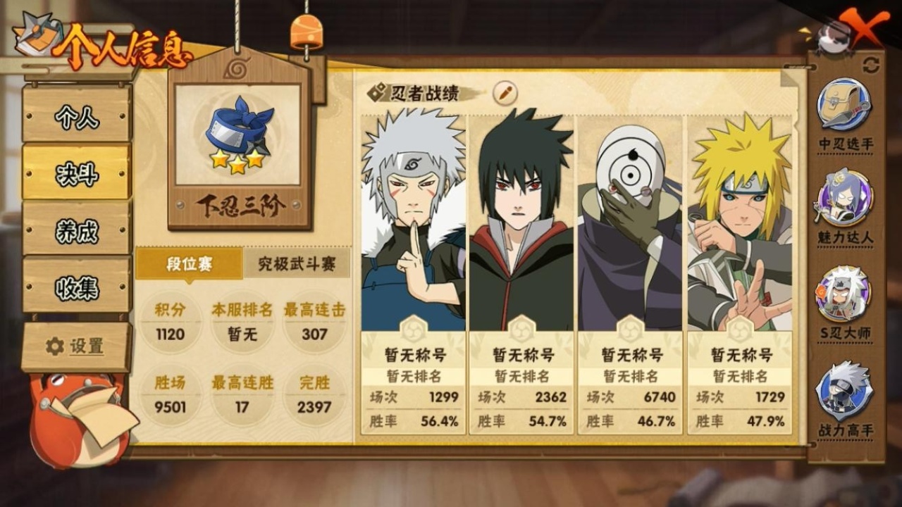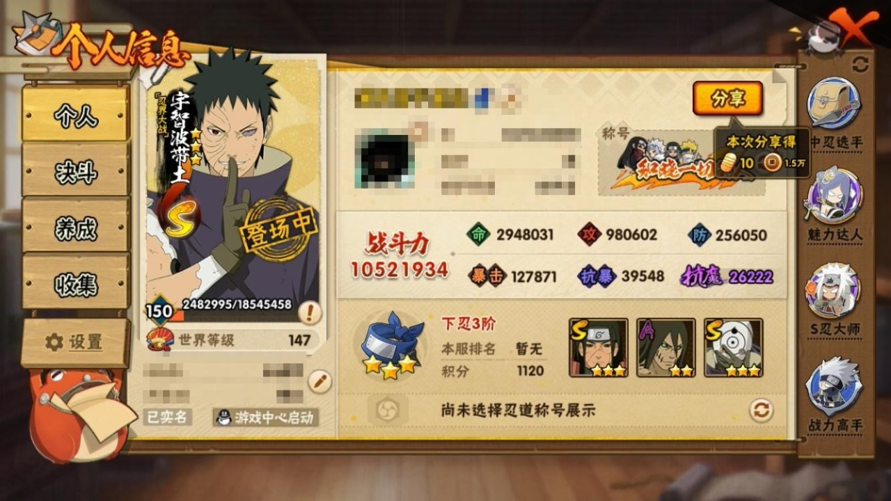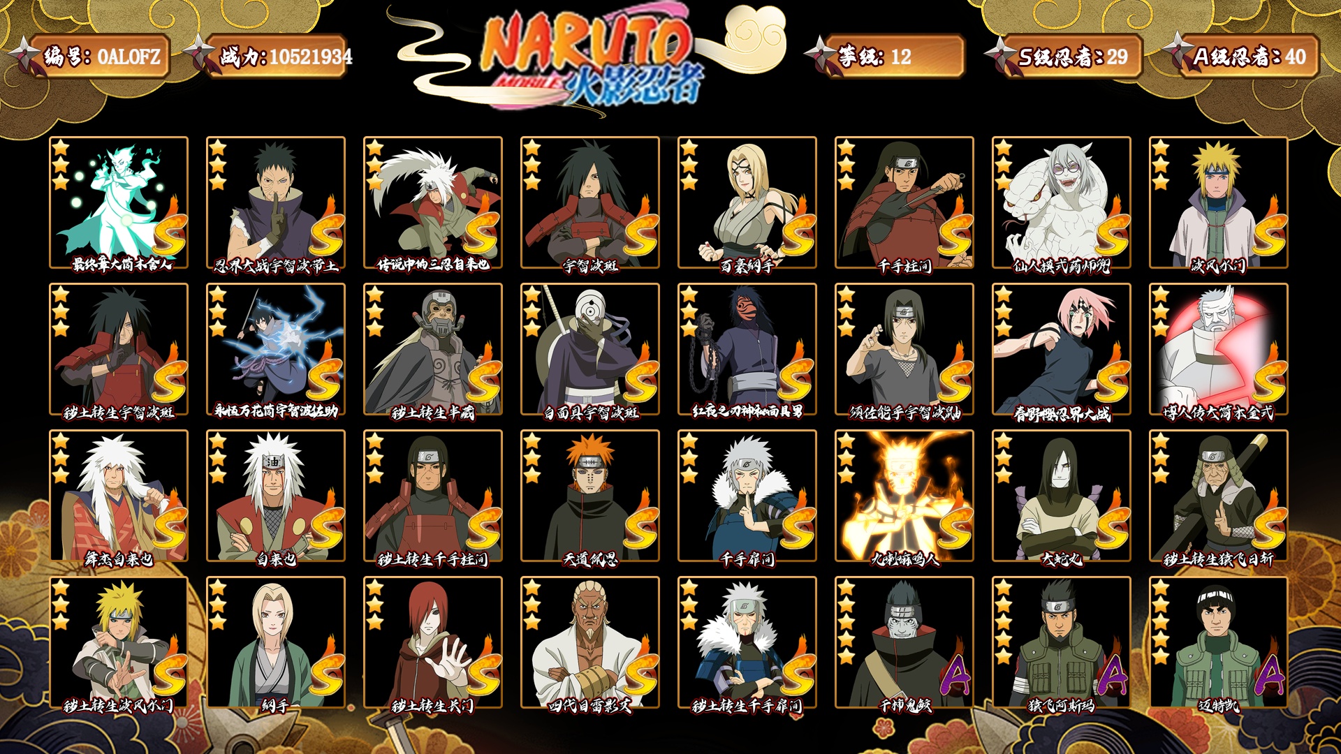 [13515266]0alofz 号,vip12,战力:10521934,s忍者数量:29,a忍者数量:40,本服排名:660,战区排名:未上榜,通灵兽数量:20,时装数:15,段位:下忍3阶,忍者星数:581
