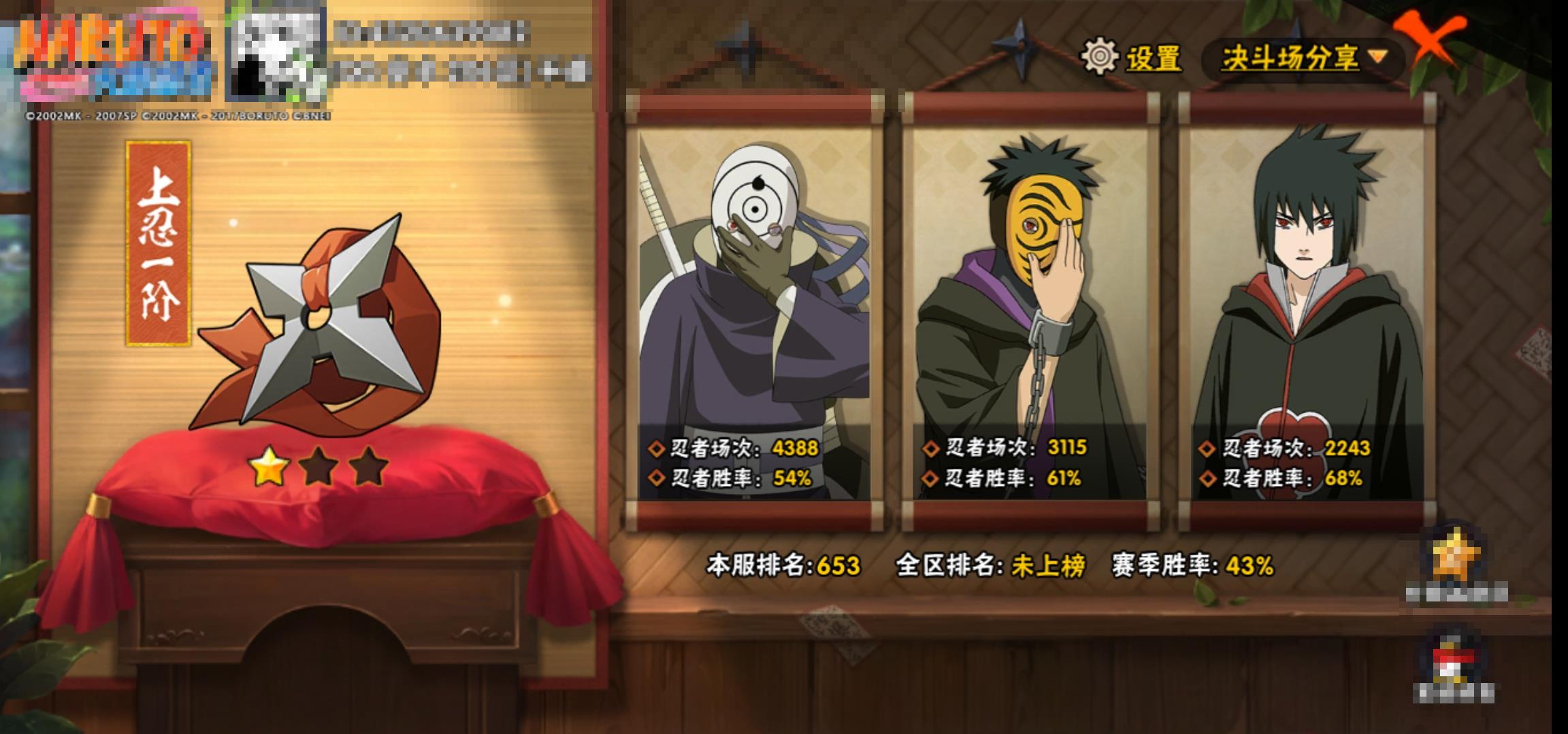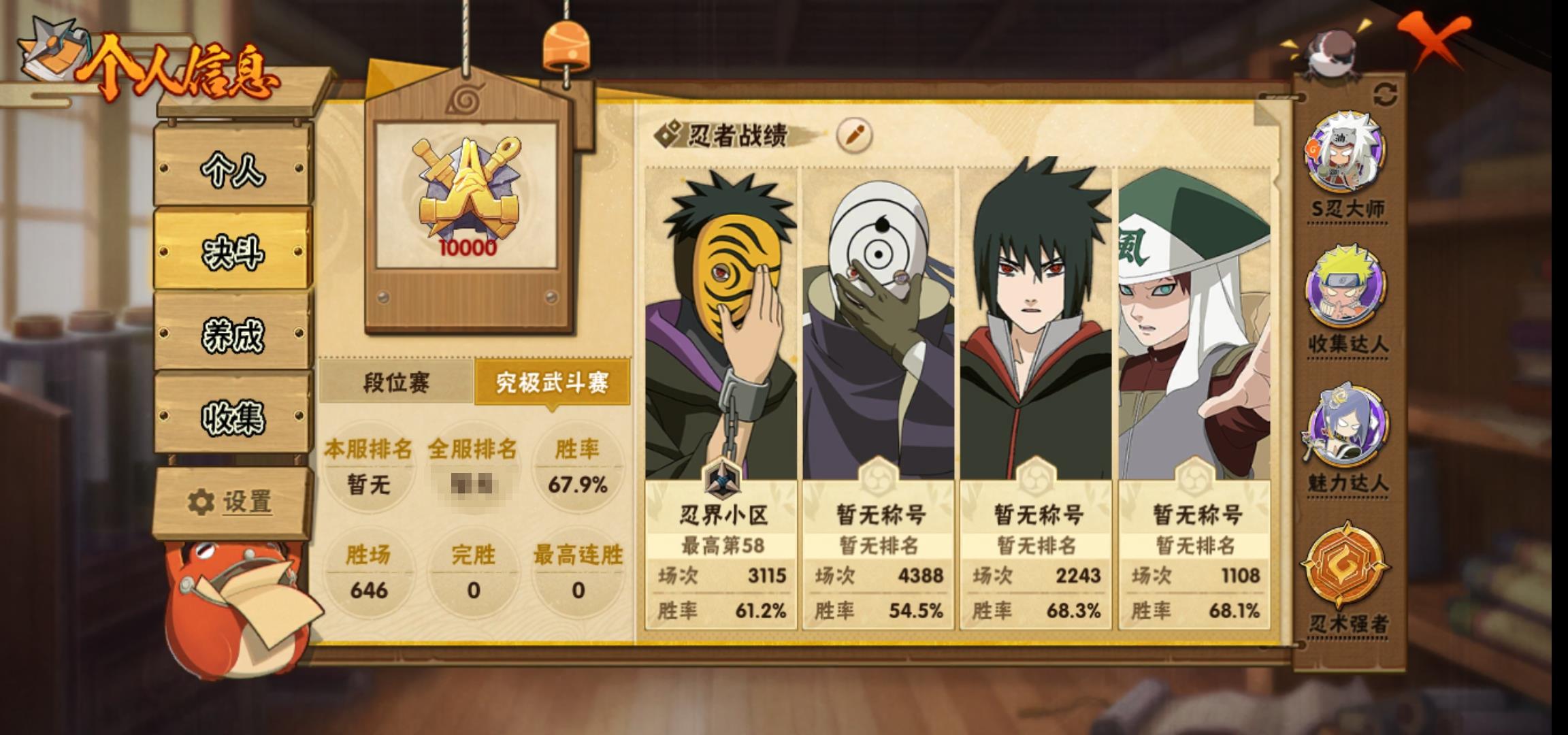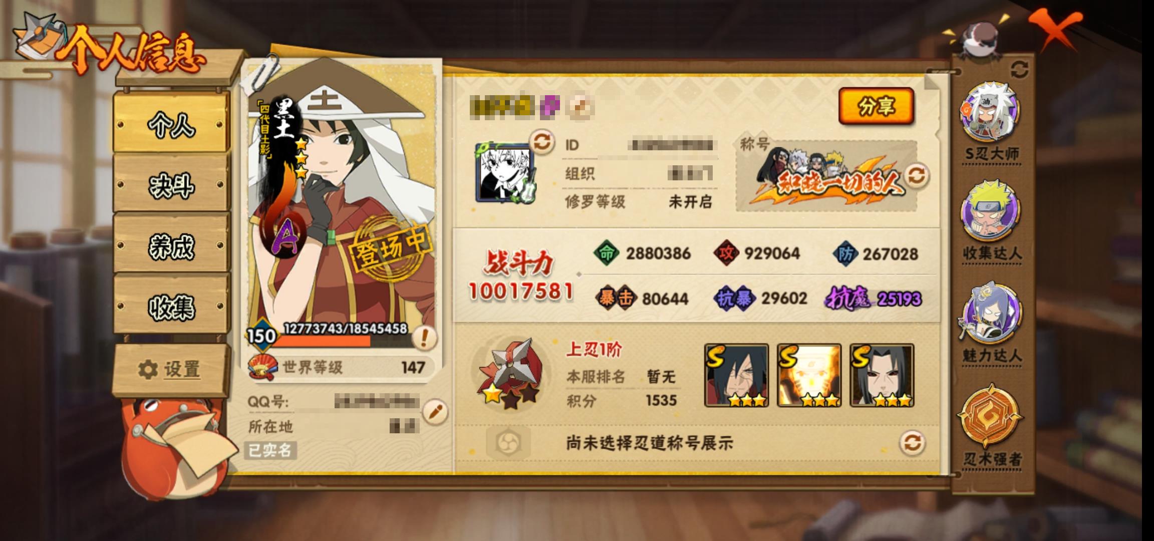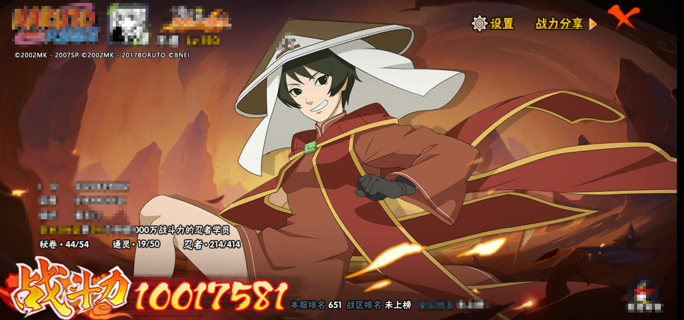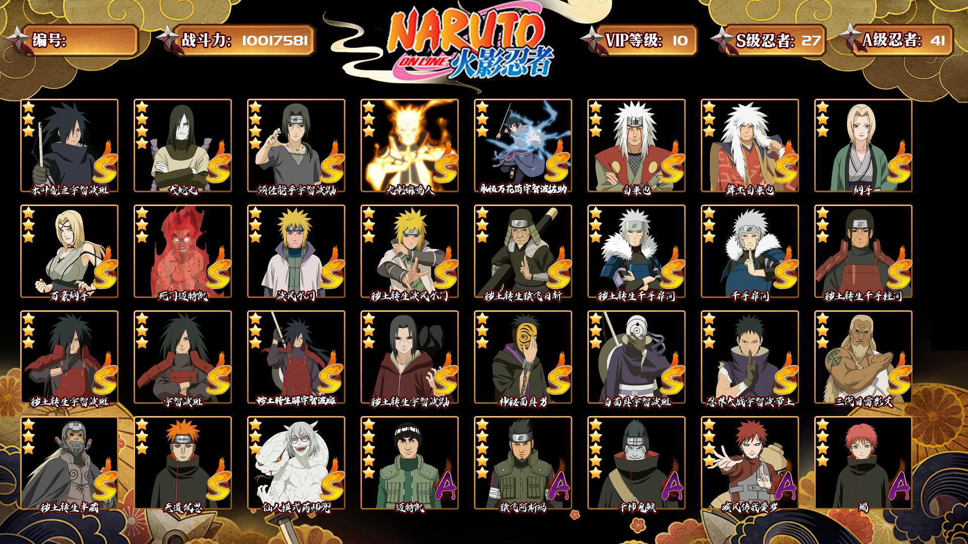 [13553776]0als77 号 vip10,1001w战力,s忍27个,a忍41个,本服排名651,战区排名未上榜,通灵兽19个,5时装,上忍1阶,忍者星数574