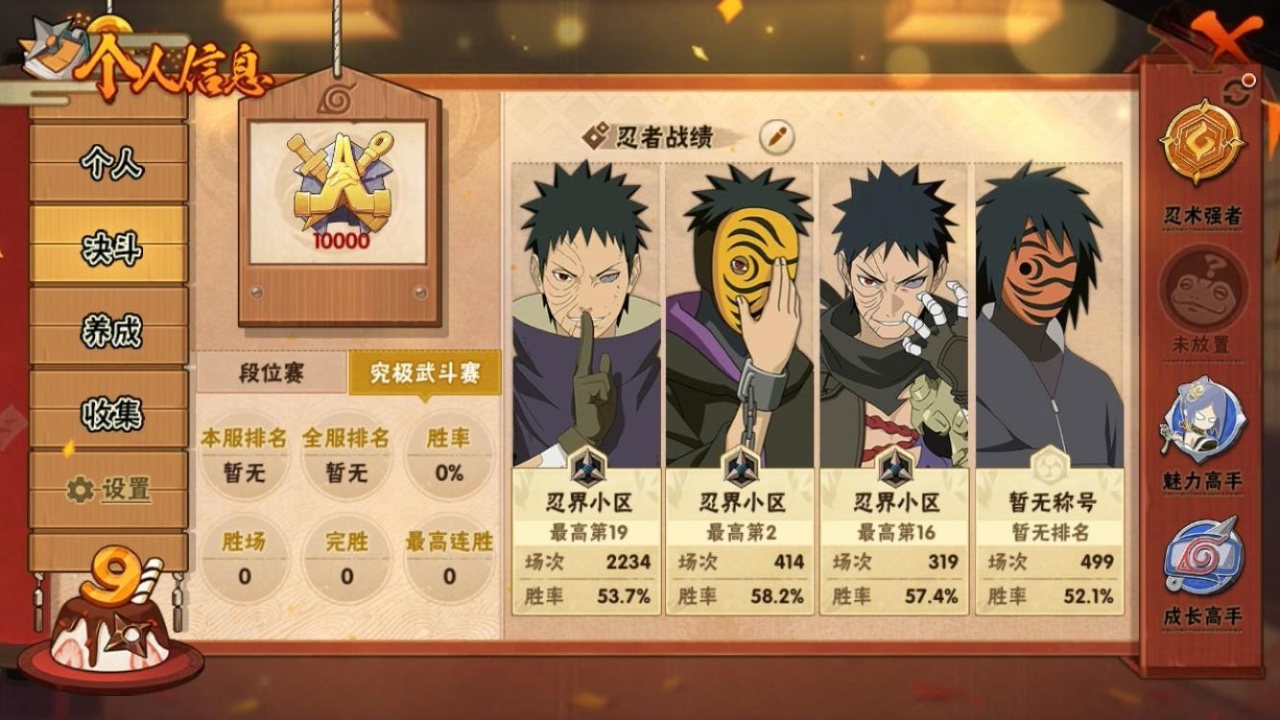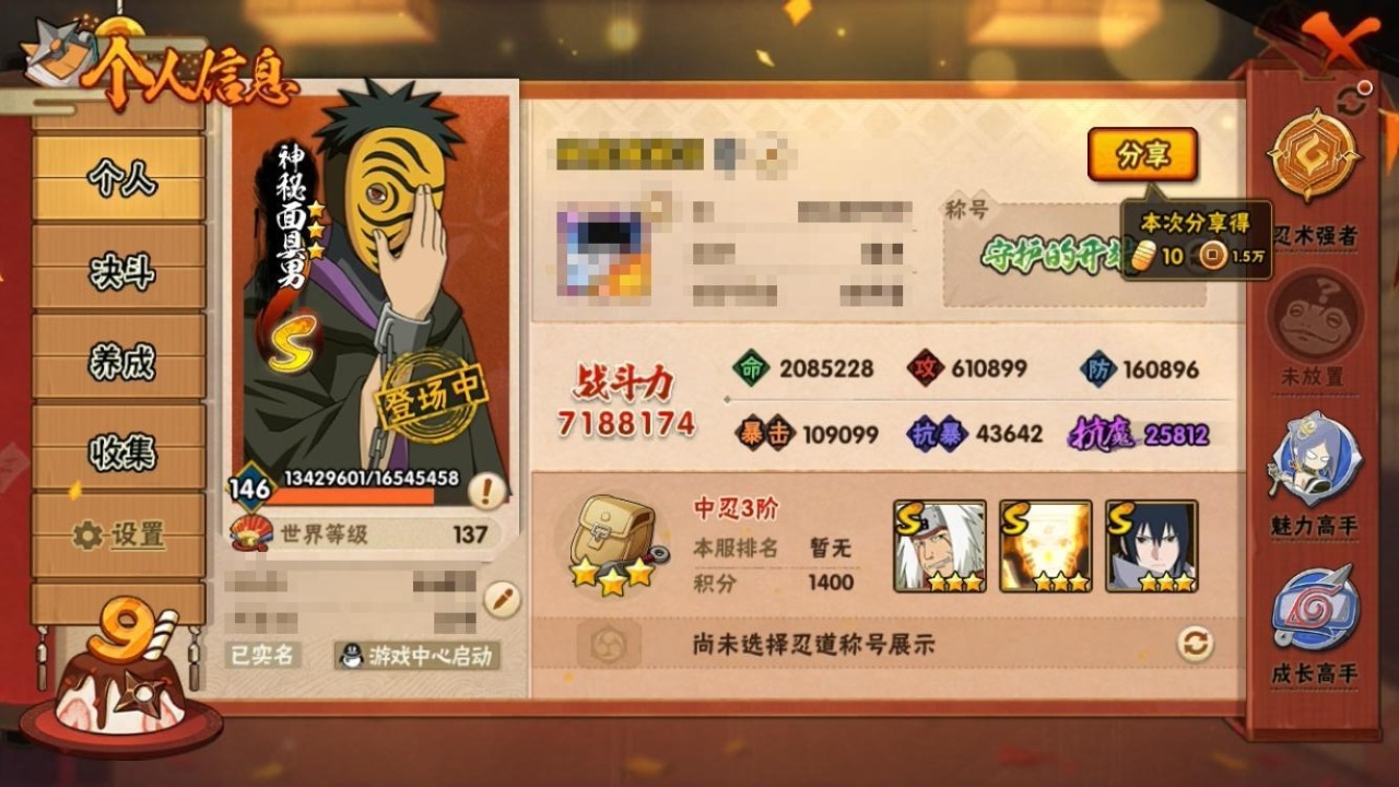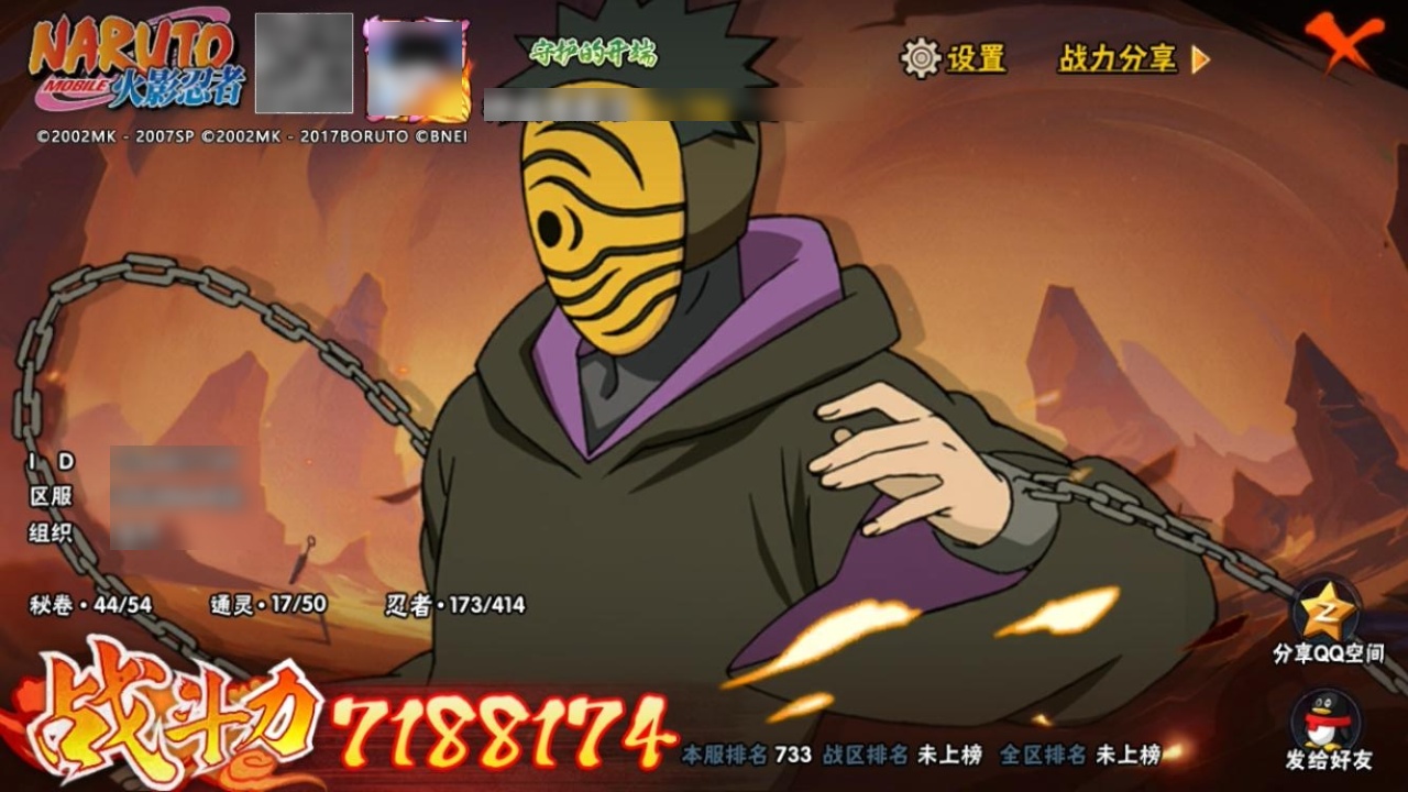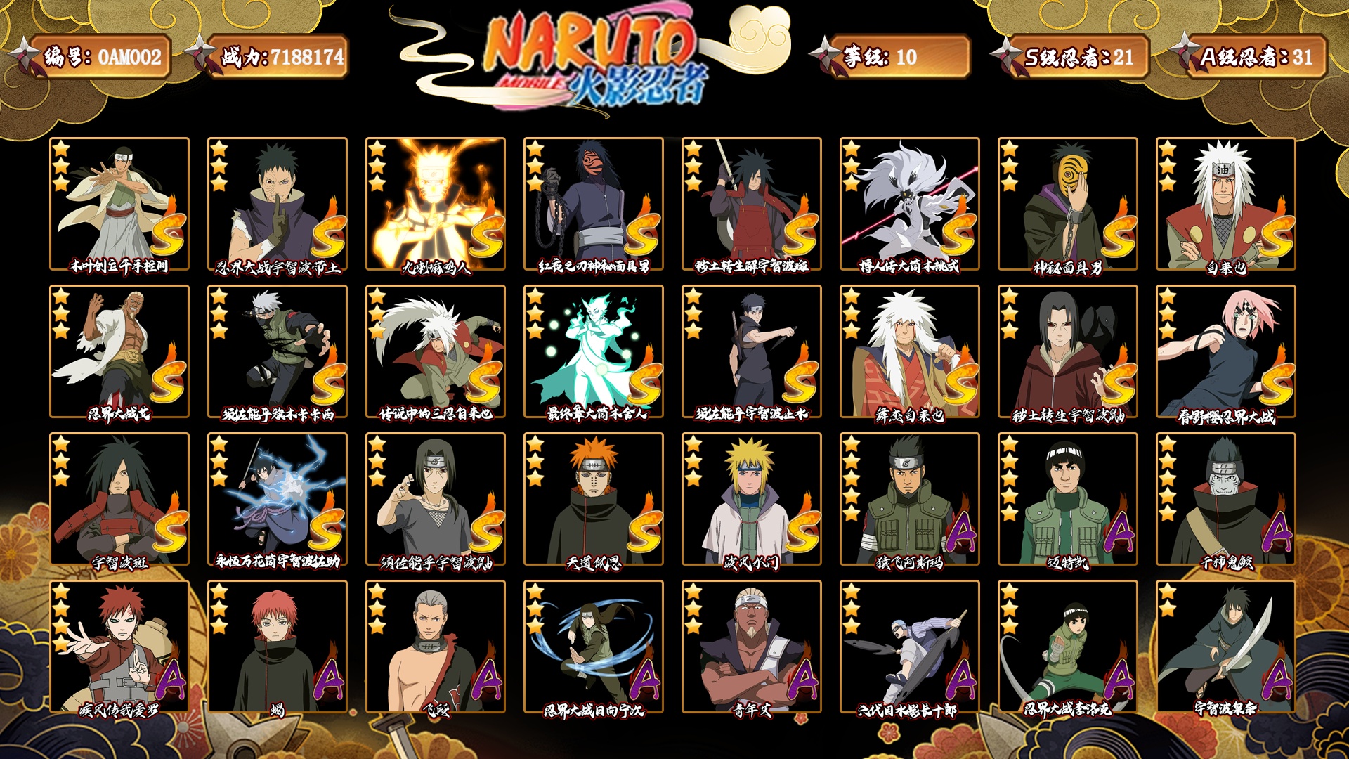 [13613238]0am002 号,vip10,战力:7188174,s忍者数量:21,a忍者数量:31,本服排名:733,战区排名:未上榜,通灵兽数量:17,时装数:10,段位:中忍3阶,忍者星数:453