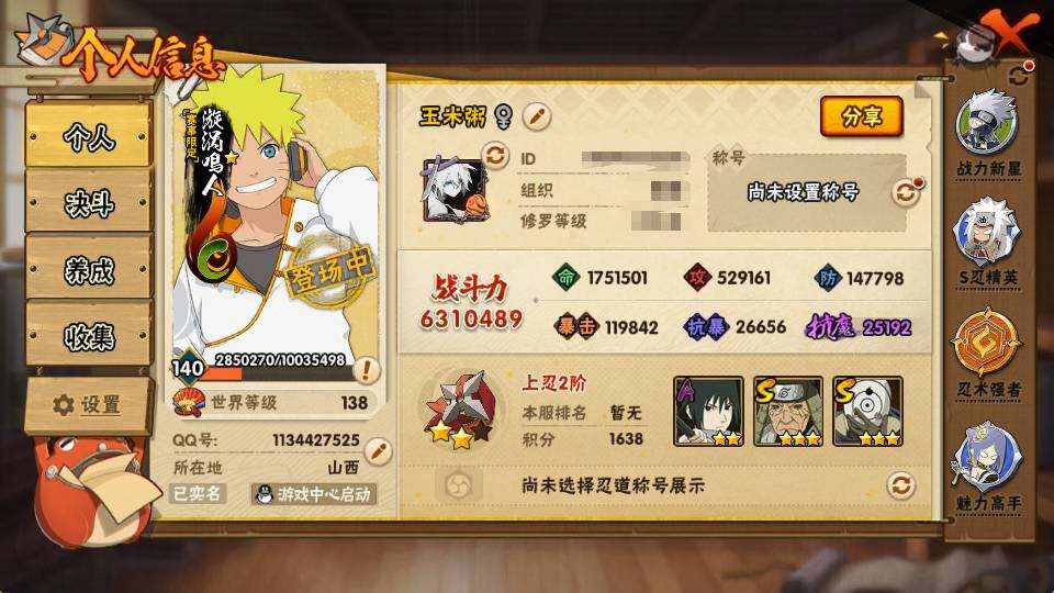 【hyyh404】v10/战力631w/s忍16/a忍23/4星干柿鬼鲛/2星日向宁次「忍界大战」/2星大野木「侠隐江湖」/2星达鲁伊「博人传」/2星飞段「死司凭血」/3星宇智波佐助「永恒万花筒」/3星大筒木金式/5星猿飞阿斯玛/2星长门「青年」/2星蝎/3星猿飞日斩「秽土转生」/3星佩恩「天道」/3星波风水门/3星漩涡鸣人「九喇嘛连结」/2星秋道丁次「忍界大战」/5星迈特凯/3星千手柱间「木叶创立」/3星我爱罗「疾风传」/2星长十郎「六代目水影」/2星波风水门「青年」/3星自来也「舞之豪杰」/3星宇智波斑「白面具」/3星迈特凯「死门」/3星神秘面具男「红夜之刃」/2星迪达拉「秽土转生」/2星奇拉比/2星飞段/3星春野樱「忍界大战」/2星宇智波佐助「万花筒写轮眼」/2星宇智波泉奈/2星迪达拉/3星大蛇丸/3星宇智波斑「秽土转生·解」/2星艾「青年」/2星漩涡鸣人「九尾查克拉」/3星大野木「忍界大战」/2星宇智波佐助「须佐能乎」/2星千代「近松十人卫」/3星宇智波鼬「须佐能乎」