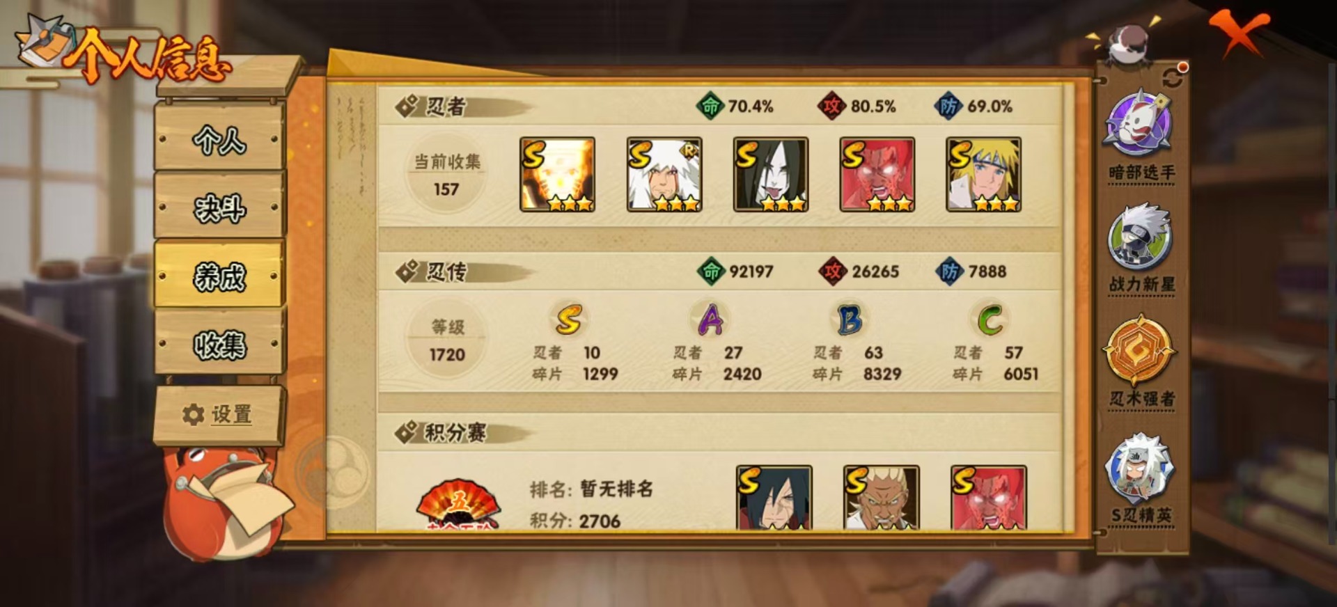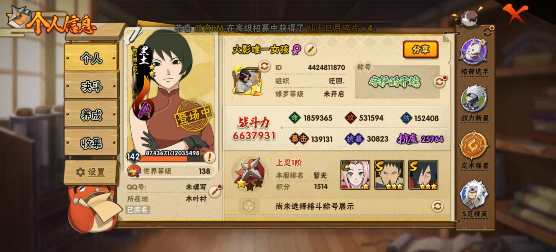 [13801342]v6 10s忍 27a忍 15通灵 663.7w战力 可二次 可修改实名 【s级忍者】:艾「忍界大战」宇智波斑「秽土转生·解」漩涡鸣人 「九喇嘛连结」迈特凯「死门」宇智波带土 「忍界大战」自来也 「舞之豪杰」宇智波鼬 「须佐能乎」佩恩「天道」波风水门大蛇丸
