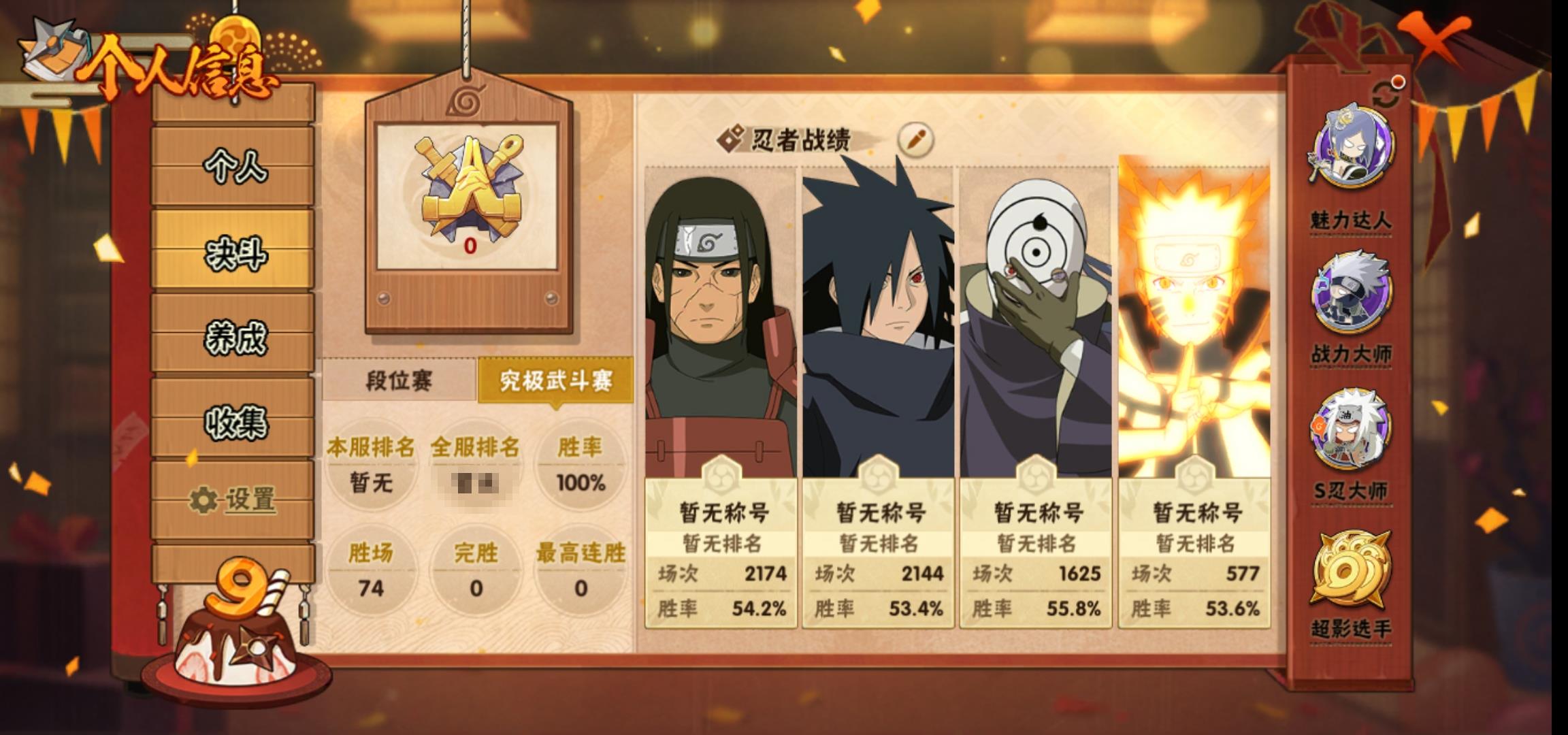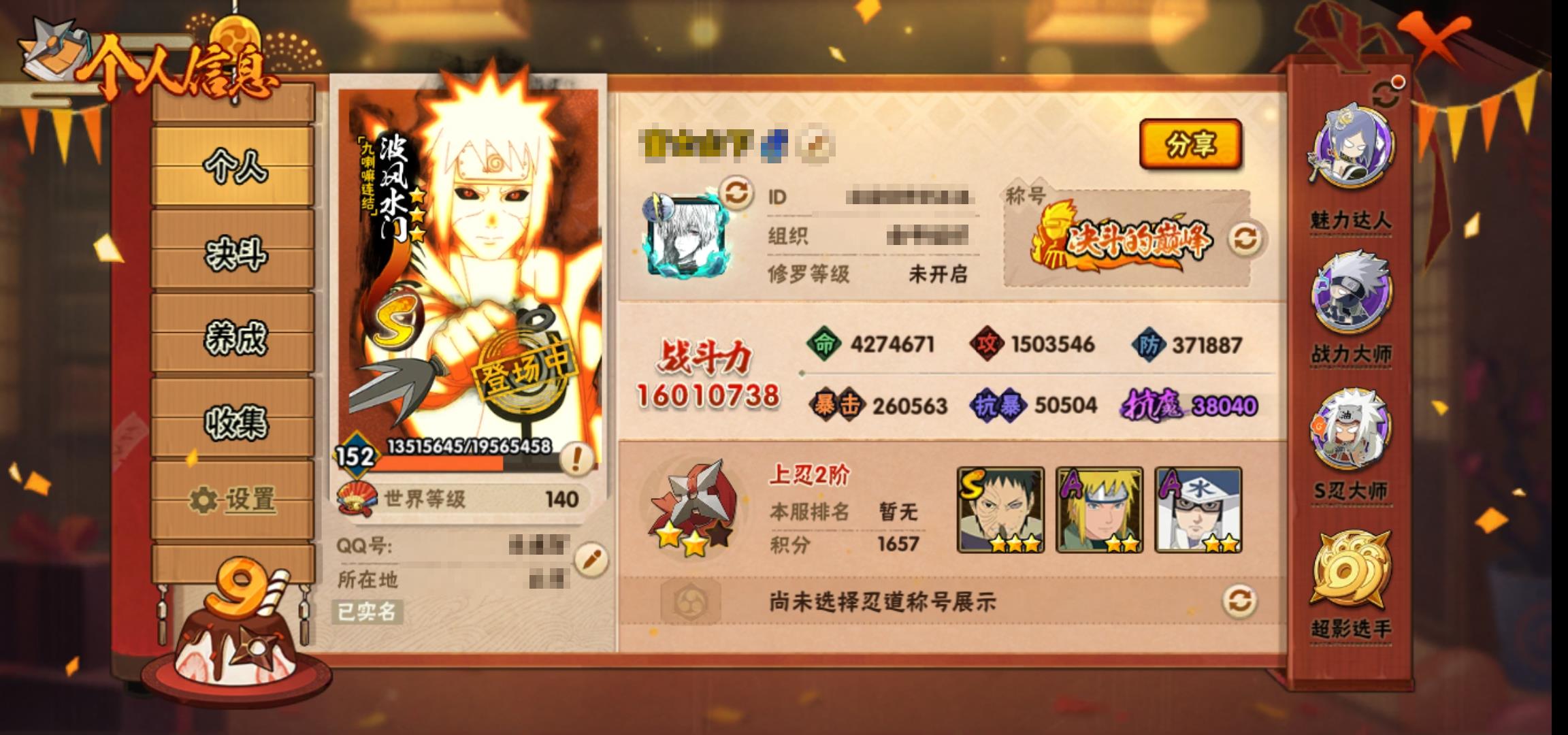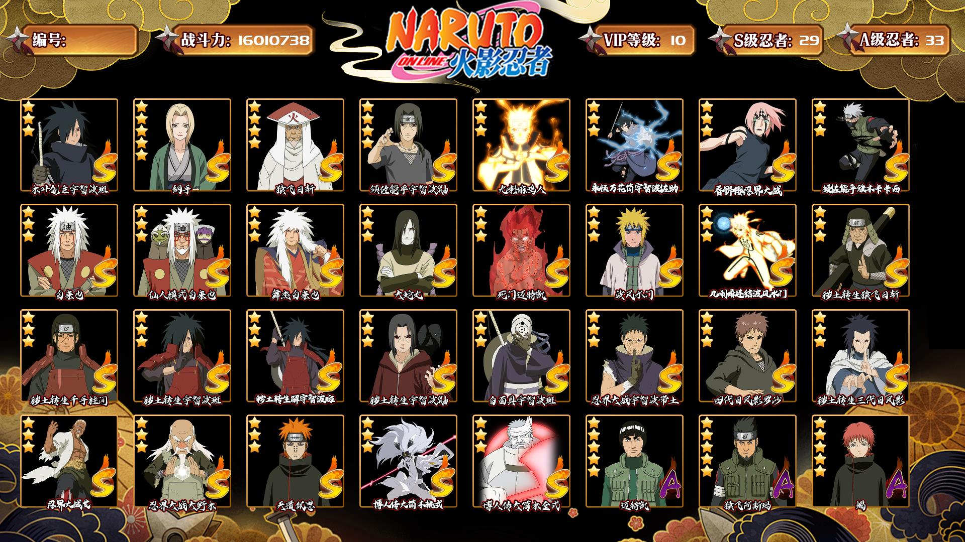 [13905121]0an253 号 vip10,1601w战力,s忍29个,a忍33个,本服排名72,战区排名未上榜,通灵兽19个,7时装,上忍2阶,忍者星数524