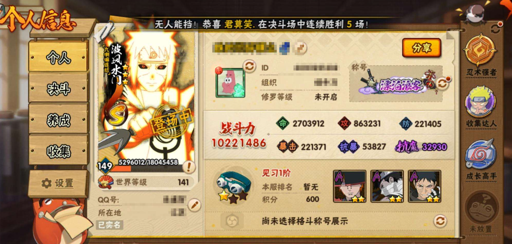 [13790043]hy071 【游戏区服】苹果qq 【vip等级】6 【战力值】783w 【段位】见习1阶 【战力排名】本服排名:1064,战区排名:未上榜 【忍者星数】409 【永久通灵兽】忍犬,蛤蟆吉,忍龟,蓝蛇,镰鼬,猿魔,山椒鱼,蜃,蛤蟆仙人,鲛鲨,蛤蟆健,乌鸦,蛤蟆龙,砂之守鹤,蛤蟆广 【永久主场景】木叶周年庆 【时装】百战须佐能乎宇智波鼬,百战佩恩天道,百战大蛇丸,百战波风水门,蜀面豪杰自来也舞之豪杰 【s忍】波风水门,九喇嘛连结漩涡鸣人,永恒万花筒宇智波佐助,舞之豪杰自来也,大蛇丸,秽土转生波风水门,千手柱间,秽土转生宇智波斑,须佐能乎宇智波鼬,秽土转生宇智波鼬,神秘面具男,天道佩恩,仙人模式药师兜 【a忍】迈特凯,猿飞阿斯玛,干柿鬼鲛,飞段,疾风传我爱罗,万花筒写轮眼宇智波佐助,须佐能乎宇智波佐助,宇智波泉奈,百豪春野樱,忍界大战秋道丁次,宇智波止水,青年波风水门,忍界大战我爱罗,秽土转生桃地再不斩,青年艾,半蛇斗篷药师兜,小南,角都,蝎,宇智波鼬,秽土转生迪达拉,死司凭血飞段,四代目土影黑土 【b忍】疾风传漩涡鸣人,疾风传宇智波佐助,疾风传春野樱,疾风传山中井野,疾风传李洛克,疾风传天天,少年旗木卡卡西,御手洗红豆,夕日红,疾风传勘九郎,咒印君麻吕,疾风传秋道丁次,疾风传木叶丸,暗部卡卡西,惠比寿,君麻吕,疾风传日向雏田,野原琳,漩涡玖辛奈,大和,疾风传手鞠,白,第一尾漩涡鸣人,新春限定漩涡鸣人,咒印宇智波佐助,忍者少女春野樱,佐井,新春限定佐井,夏日泳装山中井野,忍界大战山中井野,疾风传奈良鹿丸,疾风传油女志乃,疾风传日向宁次,杜门李洛克,木叶飞人李洛克,截拳宗师李洛克,少年宇智波带土,木叶三忍纲手,新春限定御手洗红豆,和服夕日红,卯月夕颜,新春限定漩涡辛久奈,暗部宇智波鼬,红夜之刃宇智波鼬,油女取根,马基,凭依体我爱罗,漂泊武士白,忍刀七人众栗霰串丸,忍刀七人众西瓜山河豚鬼,忍界大战萨姆伊,新春限定萨姆伊,地狱道佩恩,药师兜,红莲,重吾,鬼灯水月,鹰鬼灯水月,新佩恩六道二位由木人,新佩恩六道矢仓,新佩恩六道老紫,五尾人柱力汉,七尾人柱力枫 【奥义】不变的信念,守护和平之人,起舞吧,新的力量,狂笑四杰·其二,放马过来