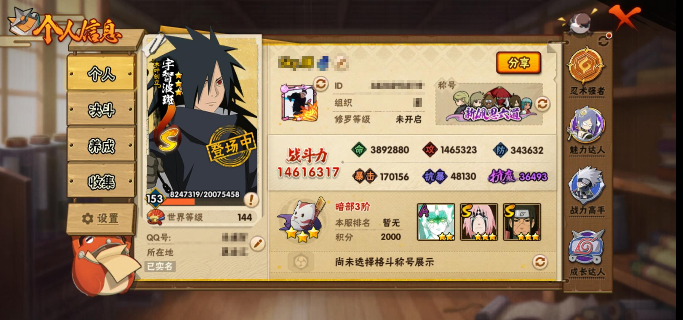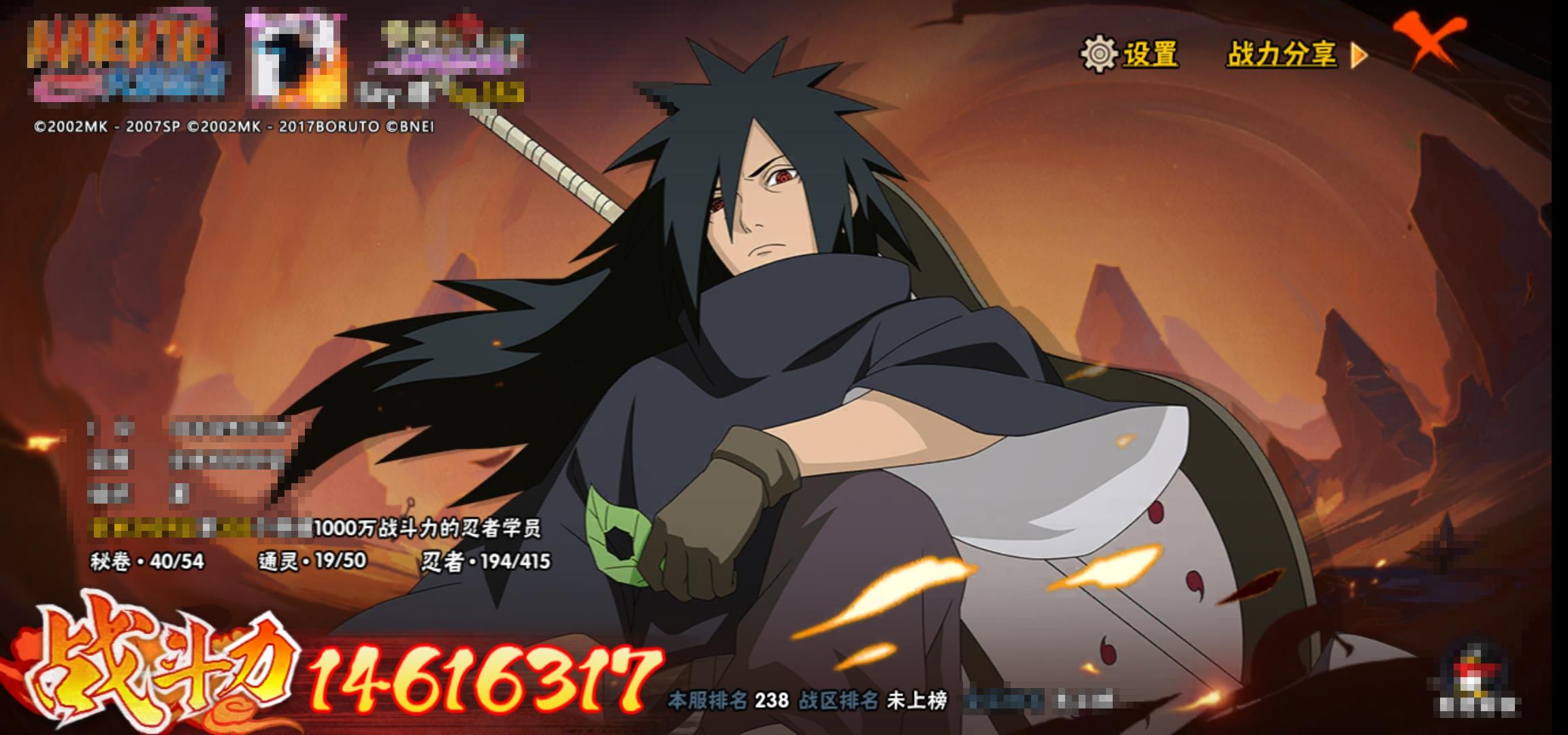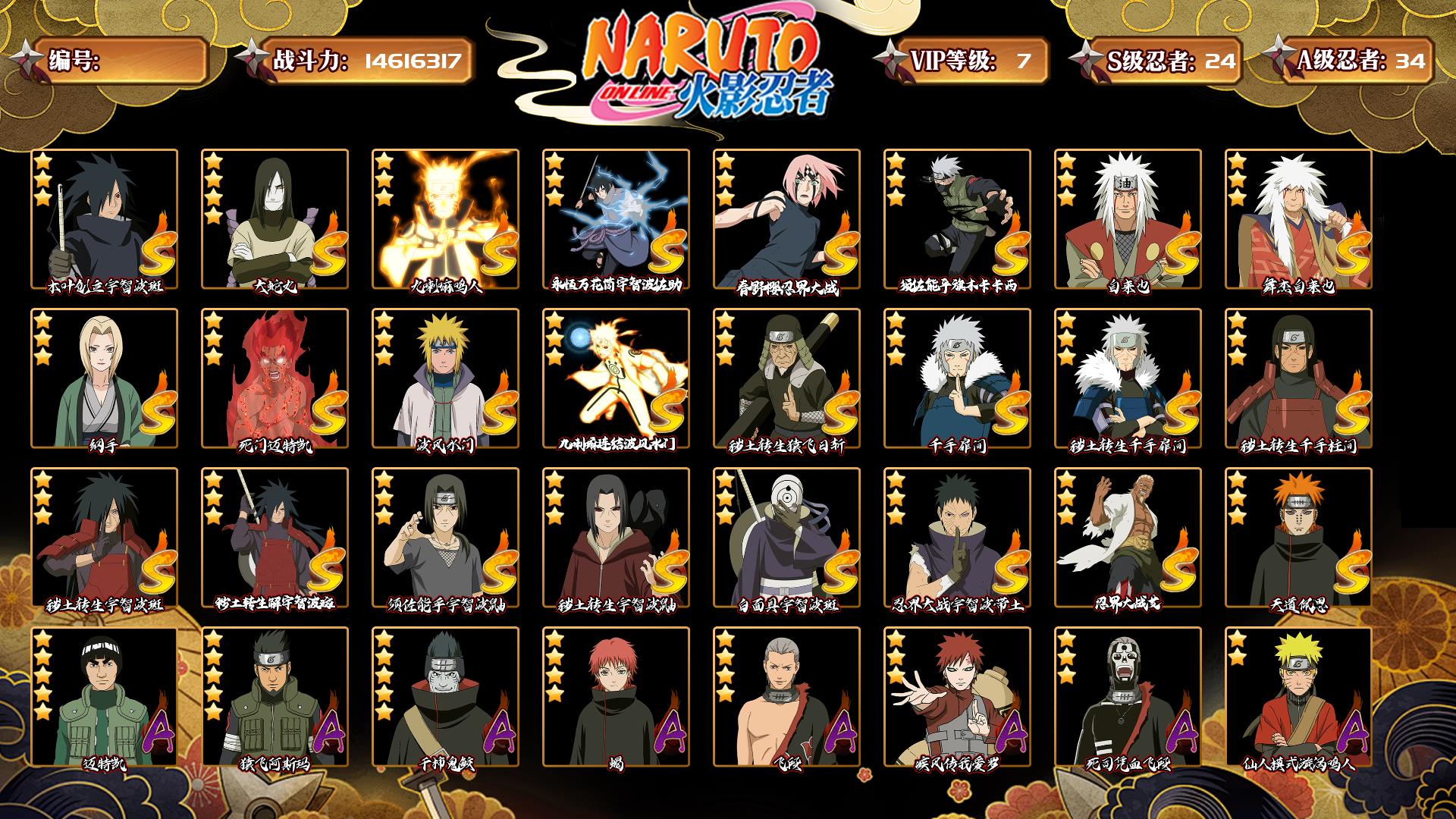 [13937405]0an5s4 号 vip7,1461w战力,s忍24个,a忍34个,本服排名238,战区排名未上榜,通灵兽19个,6时装,暗部3阶,忍者星数516