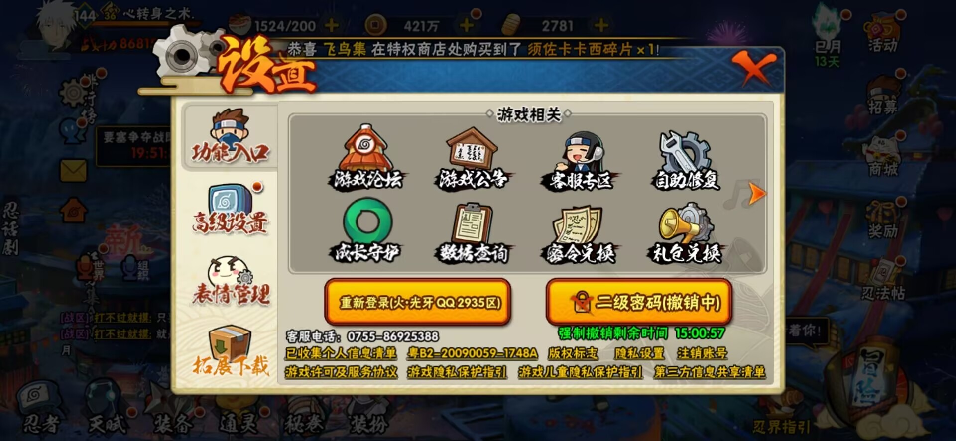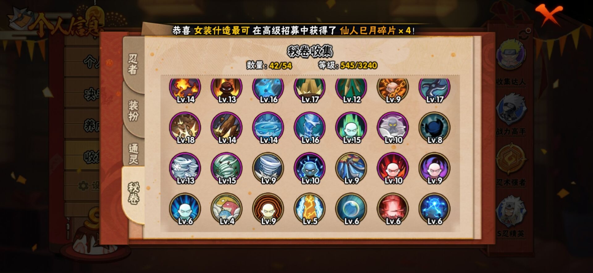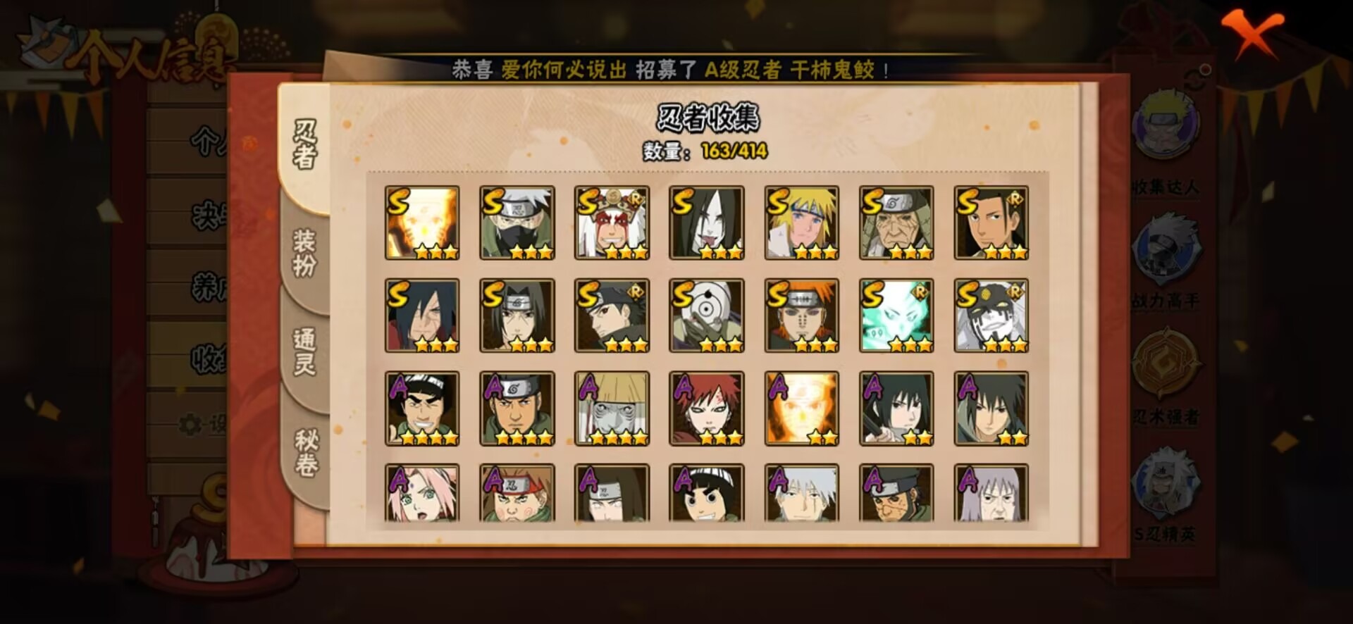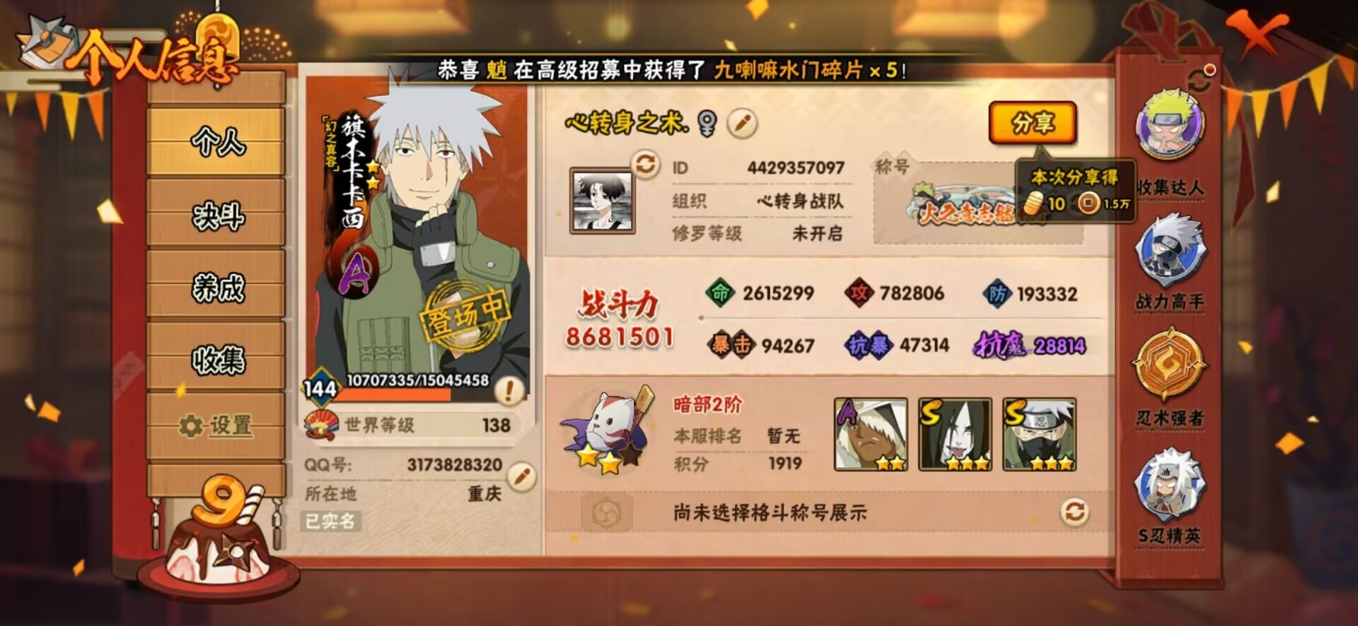 v9 14s忍 32a忍 17通灵 868.1w战力 可二次 可修改实名 【s级忍者】:宇智波止水「须佐能乎」大筒木桃式宇智波斑「秽土转生·解」千手柱间·木叶创立漩涡鸣人 「九喇嘛连结」自来也 「舞之豪杰」旗木卡卡西「须佐能乎」大筒木舍人 「最终章」宇智波斑「白面具」猿飞日斩「秽