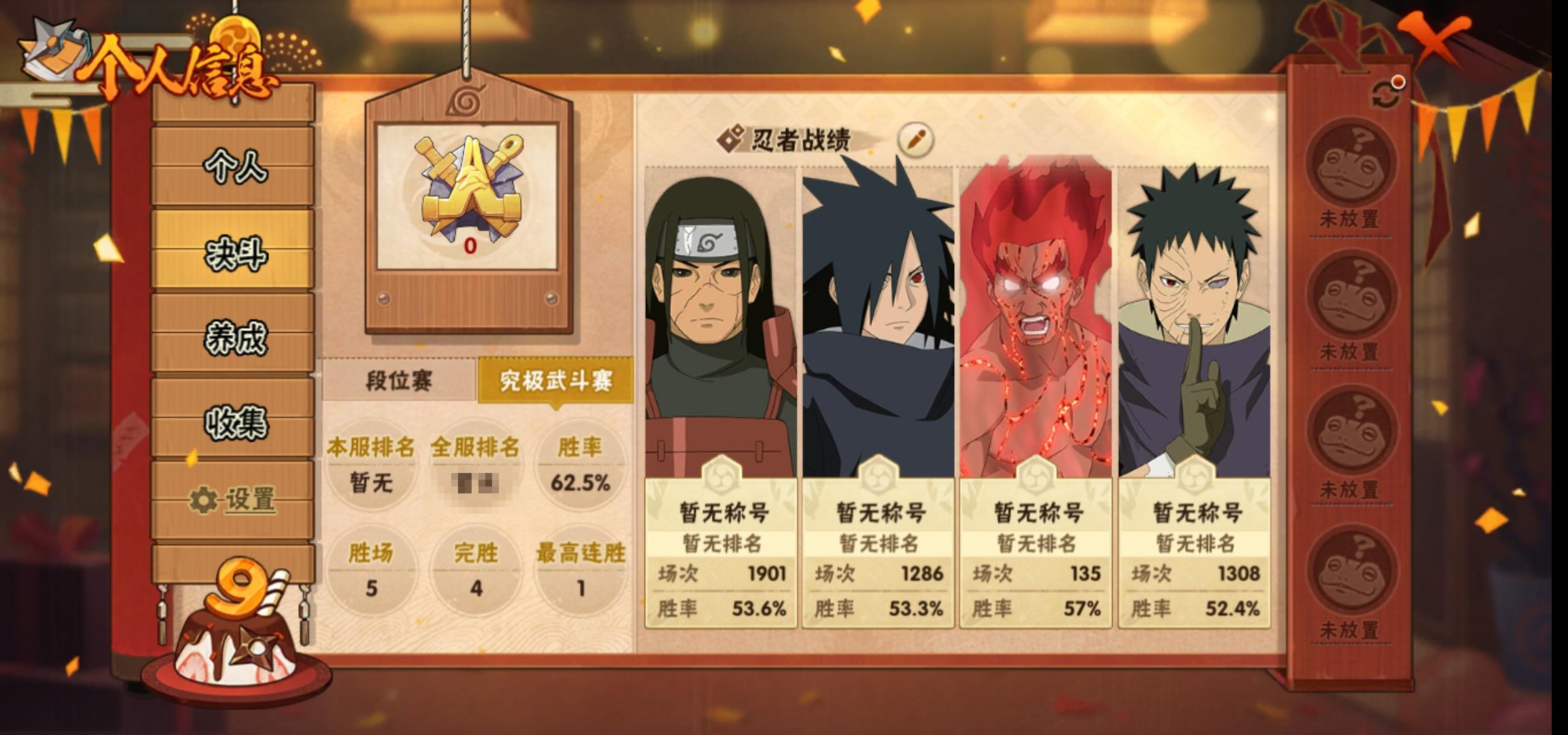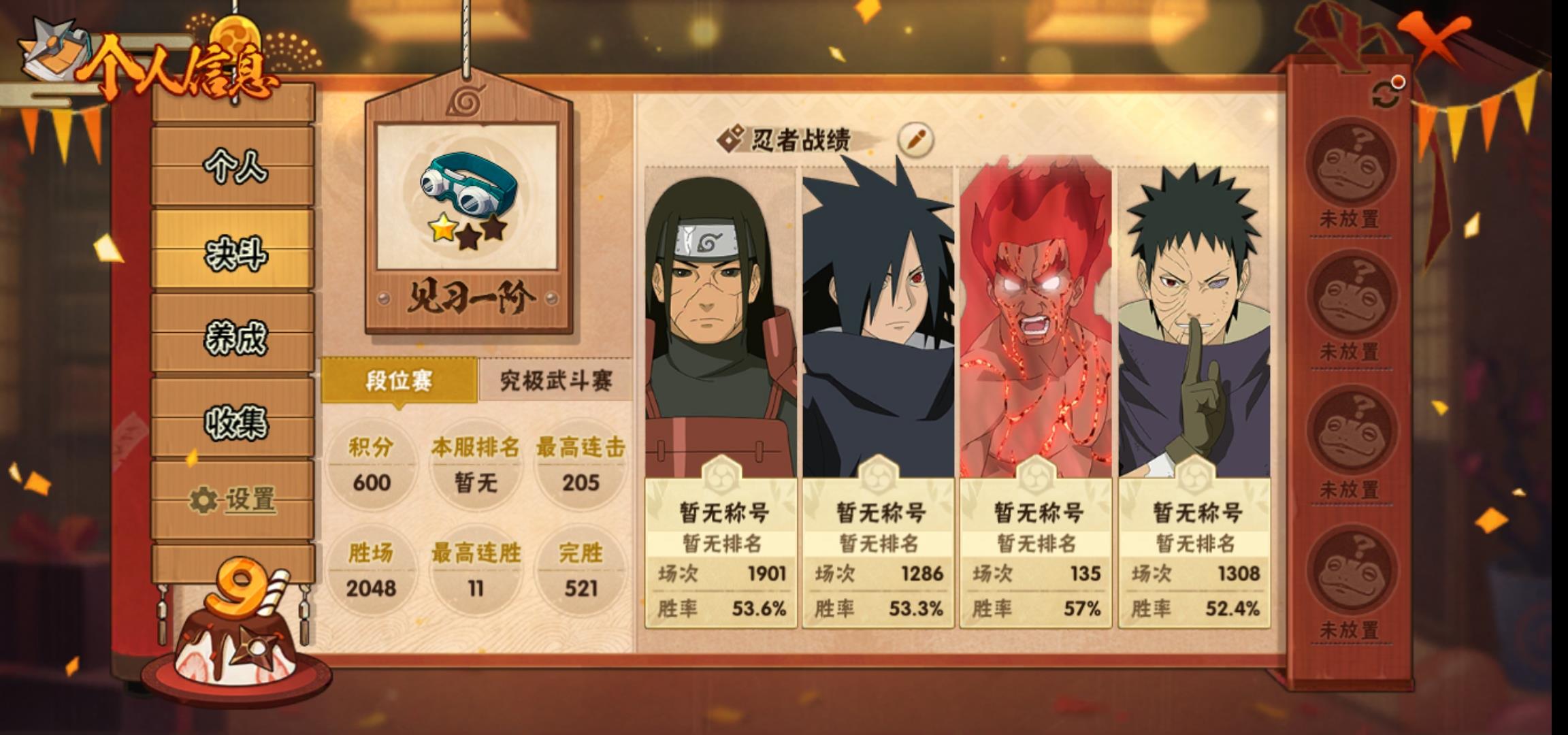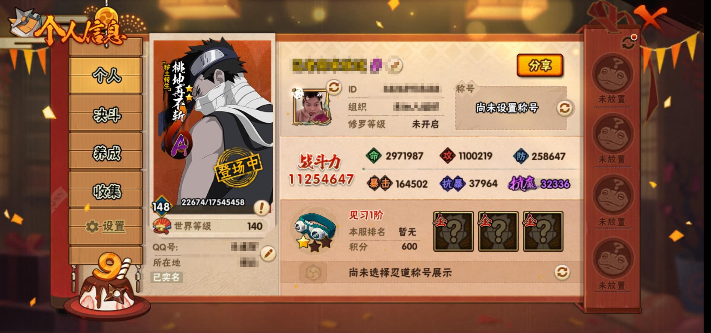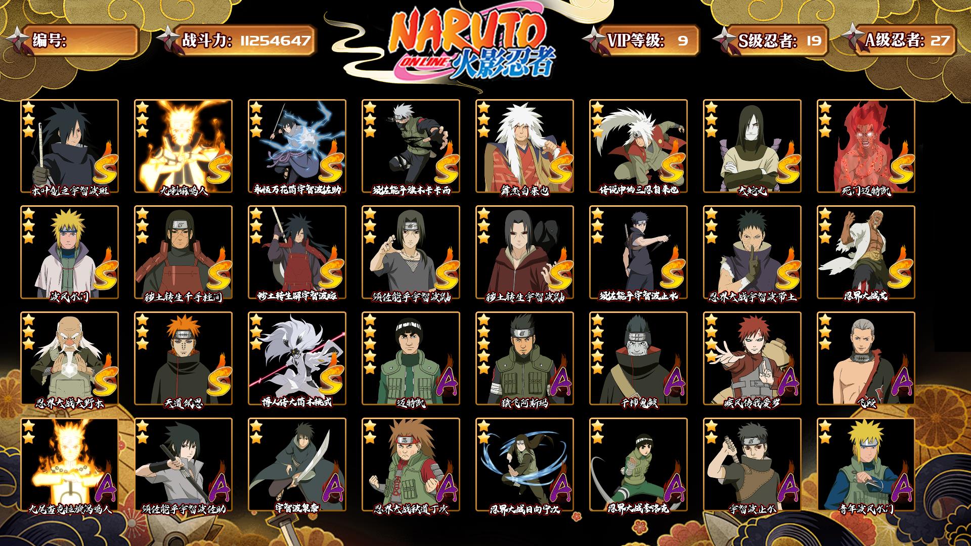 [14006460]0anejz 号 vip9,1125w战力,s忍19个,a忍27个,本服排名302,战区排名未上榜,通灵兽18个,6时装,见习1阶,忍者星数442