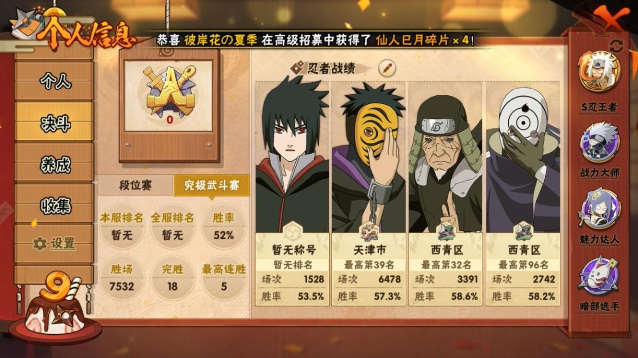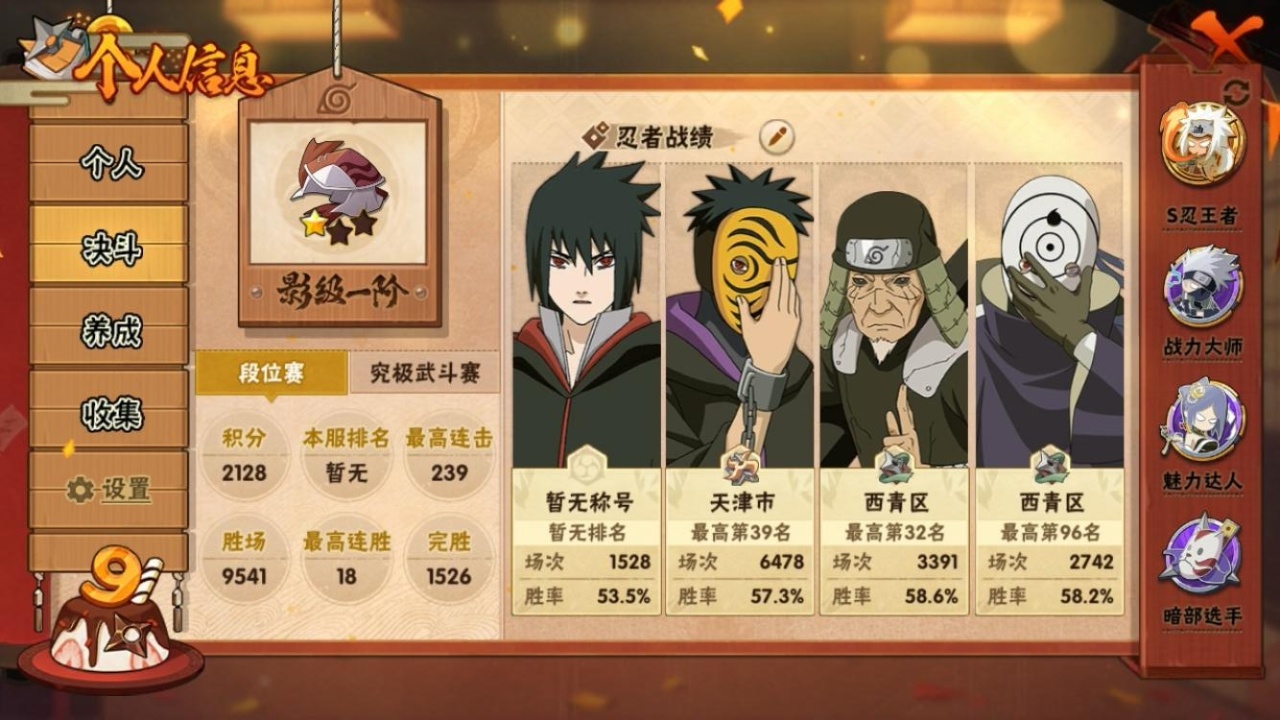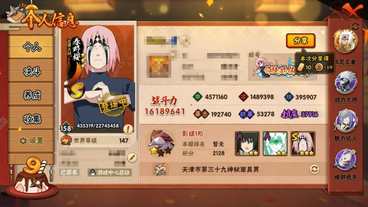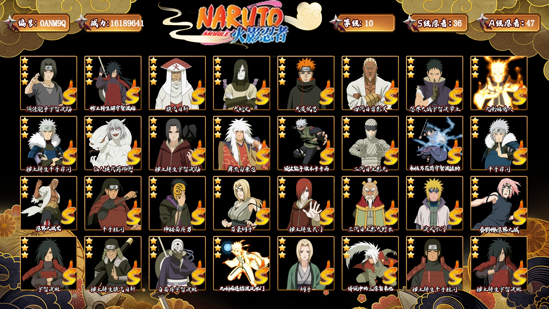 [14032142]0anm9q 号,vip10,战力:16189641,s忍者数量:36,a忍者数量:47,本服排名:206,战区排名:未上榜,通灵兽数量:20,时装数:17,段位:影级1阶,忍者星数:681