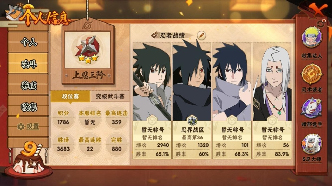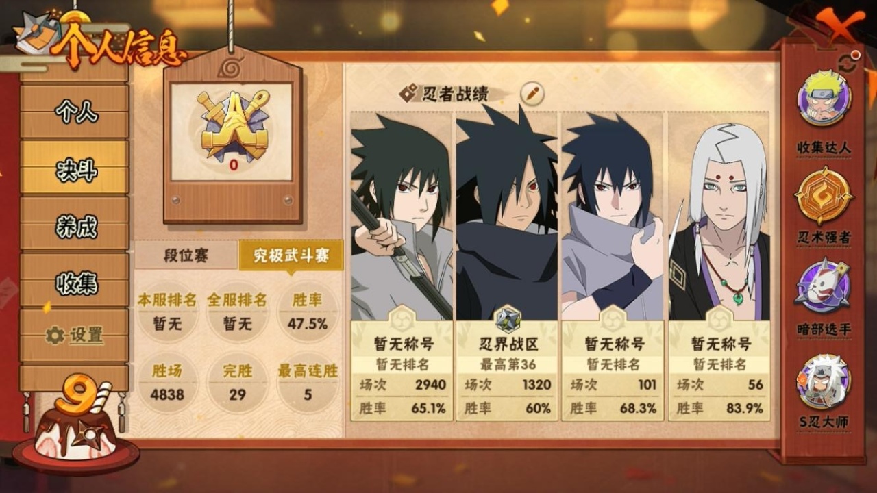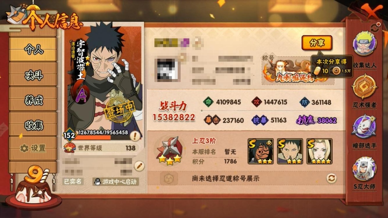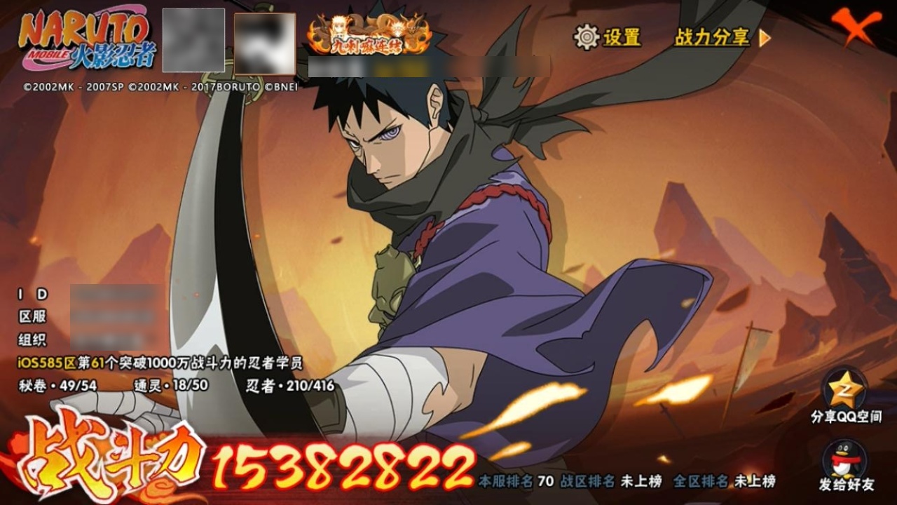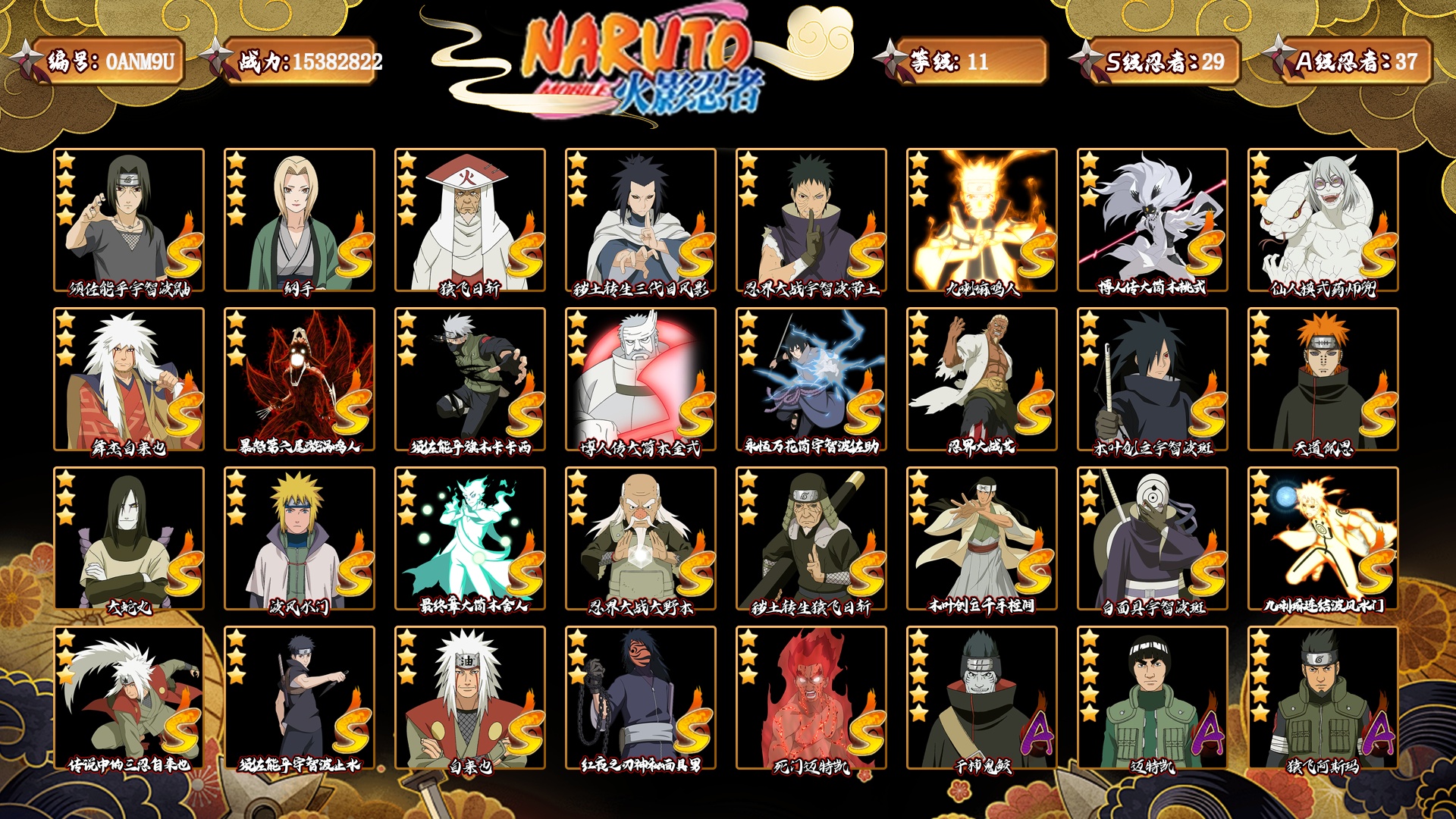 [14032171]0anm9u 号,vip11,战力:15382822,s忍者数量:29,a忍者数量:37,本服排名:70,战区排名:未上榜,通灵兽数量:18,时装数:18,段位:上忍3阶,忍者星数:543