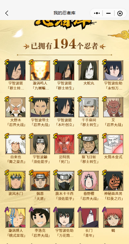 2246782-ios/20s忍/40a忍/战力nanw/请选择/区服581 【s忍者】 艾「忍界大战」,宇智波斑「秽土转生·解」,宇智波佐助「永恒万花筒」,神秘面具男「红夜之刃」,春野樱「忍界大战」,大筒木金式,漩涡鸣人「九喇嘛连结」,大野木「忍界大战」,迈特凯「死门」,宇智波斑「木叶创立」,宇智波带土「忍界大战」,自来也「舞之豪杰」,旗木卡卡西「须佐能乎」,宇智波斑「秽土转生」,千手扉间